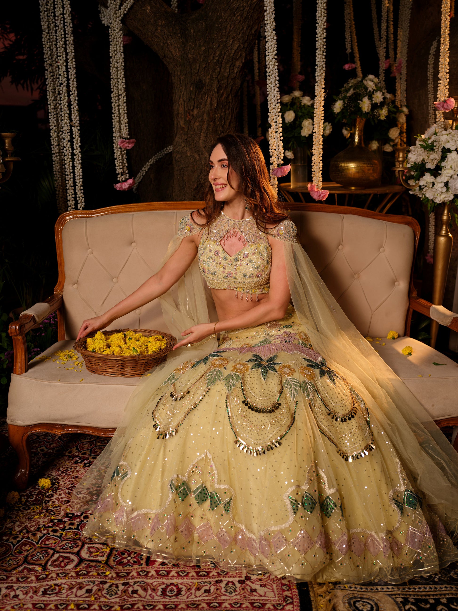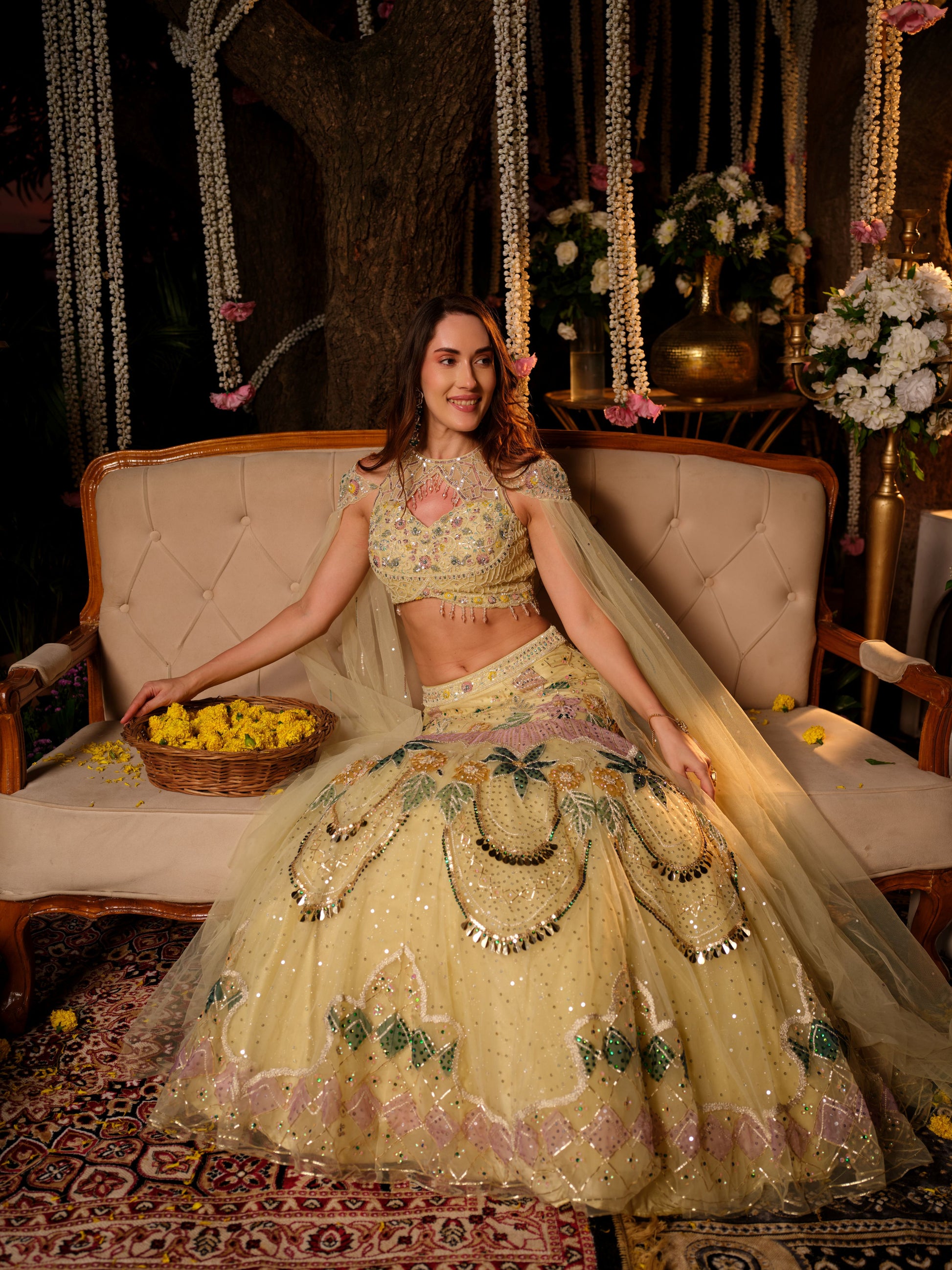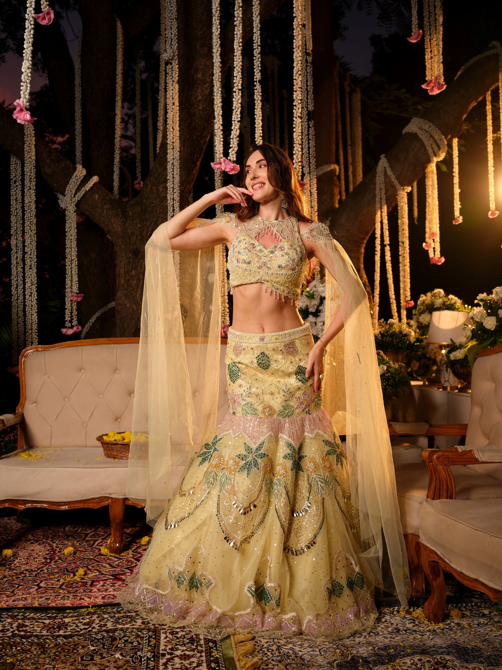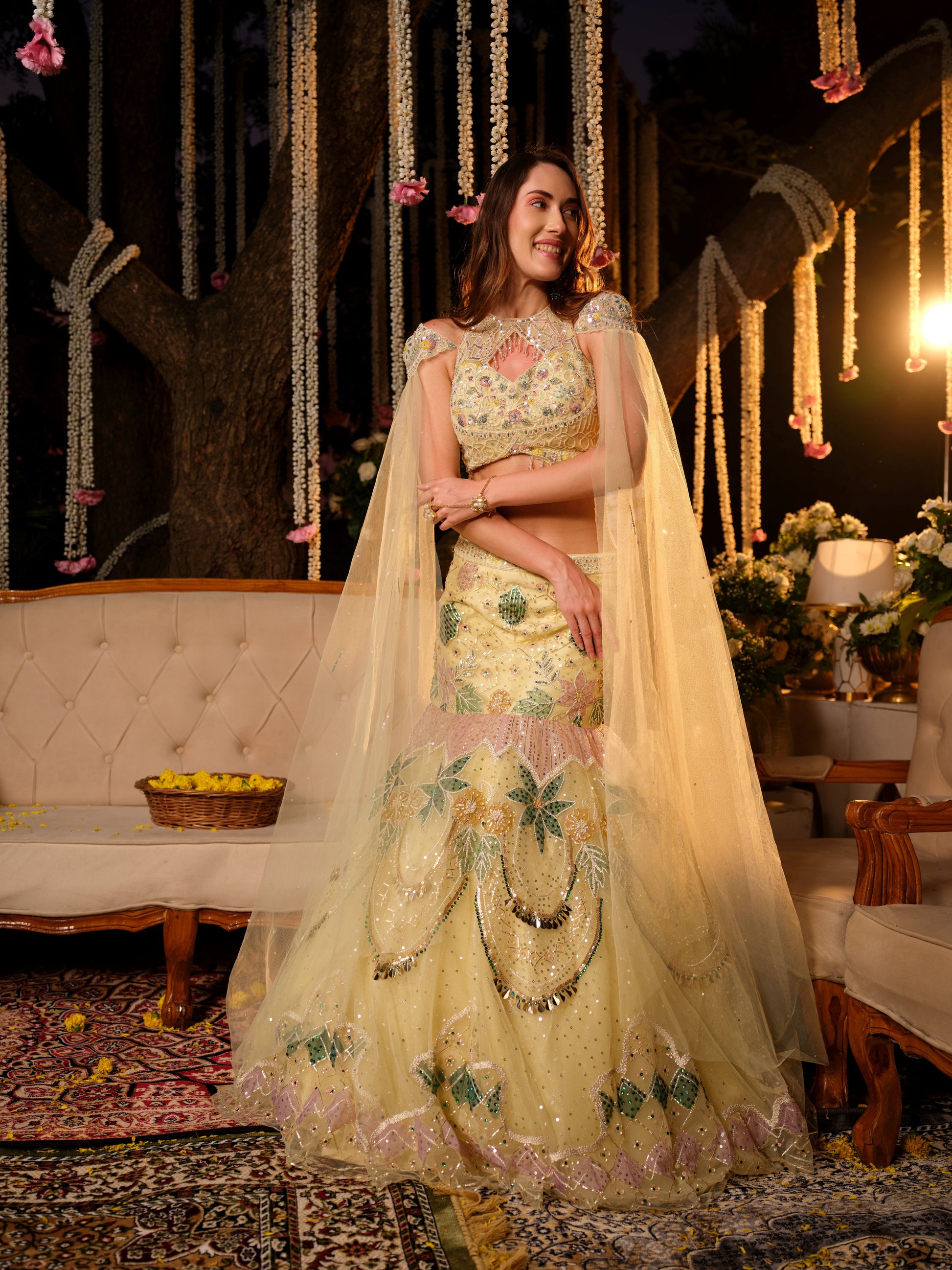 A striking mermaid-cut lehenga in soft lemon yellow, highlighted with intricate sequin, bead, and thread embroidery. The high-neck cropped blouse is richly adorned with floral detailing, while the lehenga features cascading motifs in green, lilac, and gold, giving it a festive vibrance. Paired with a sheer dupatta that drapes effortlessly, this ensemble radiates glamour with a youthful charm.