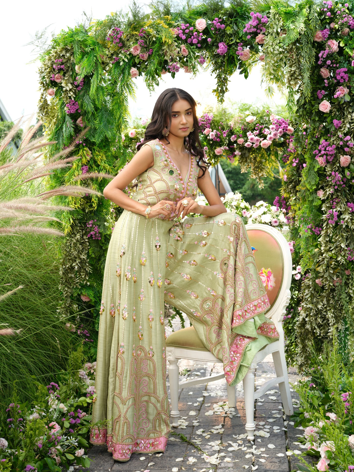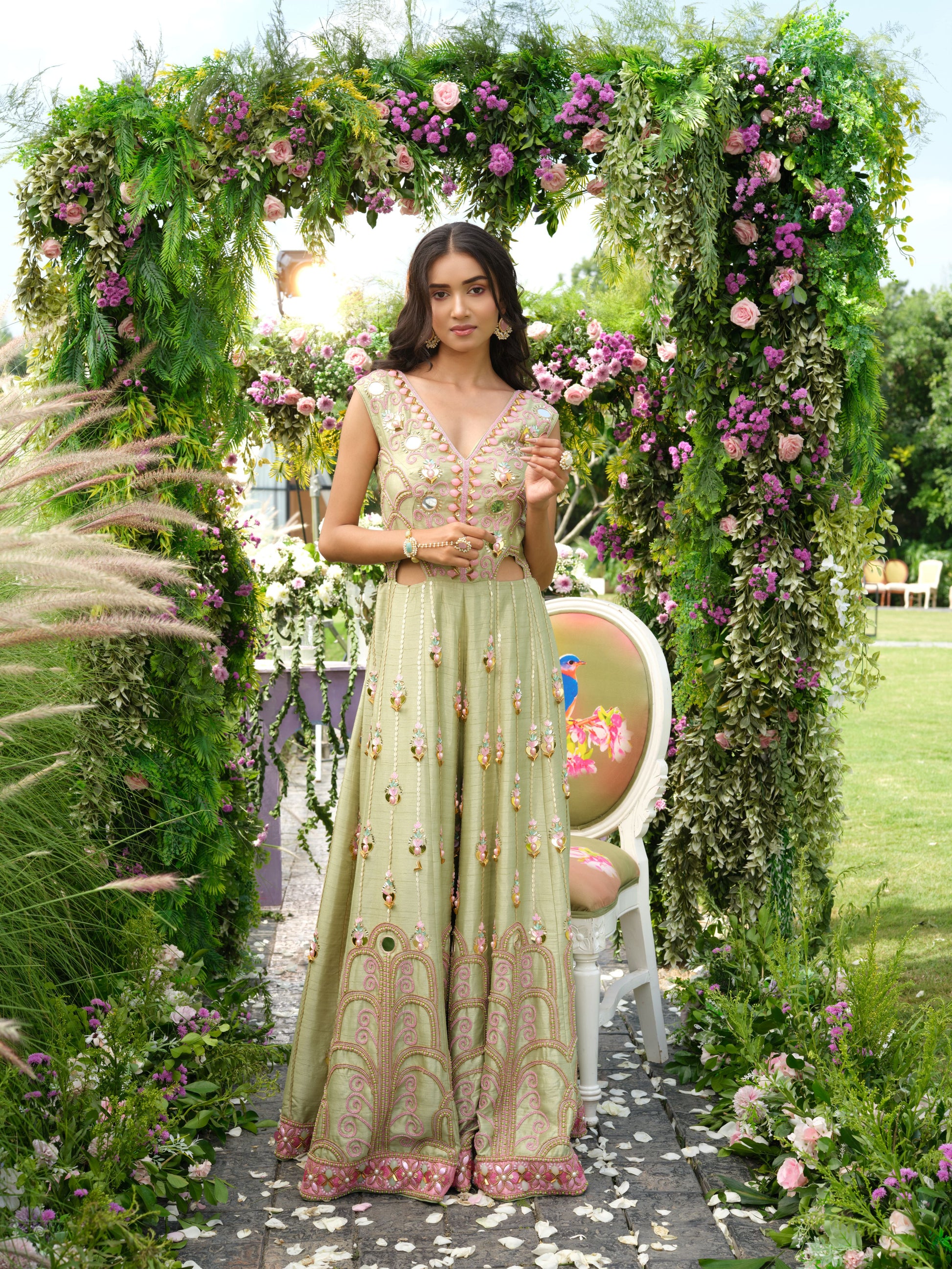 A stunning sleeveless indo-western jumpsuit crafted in pastel lime green, adorned with delicate floral embellishments, intricate beadwork, and shimmering sequins. The wide-legged silhouette features detailed embroidery along the hemline, giving it a graceful flow. The fitted bodice with a deep neckline adds elegance, while the embellishments create a soft, ethereal charm.