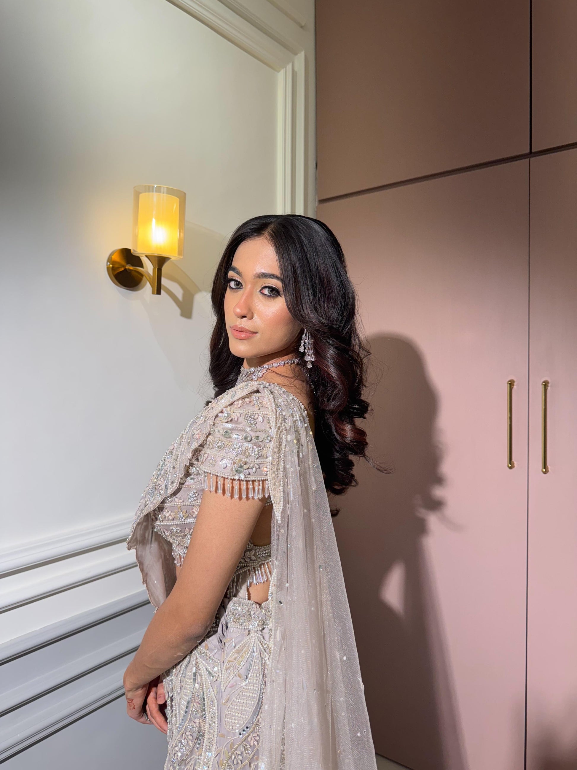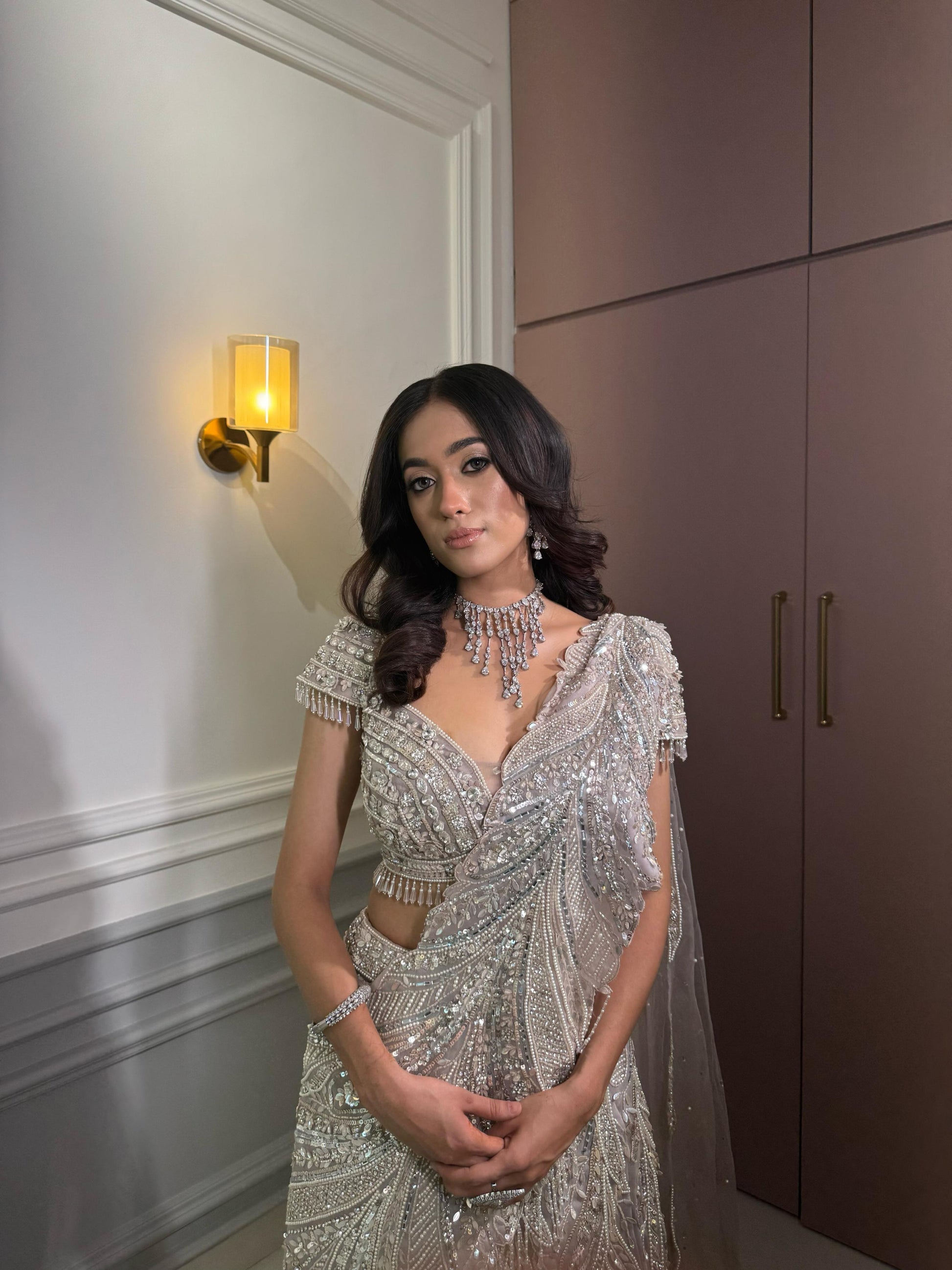Exude timeless glamour with this intricately embellished saree gown in a soft silver-beige hue. The ensemble features dazzling sequin and stone embroidery in ornate patterns, paired with a structured blouse that enhances the silhouette. The delicate drape with fringed details adds fluidity and sophistication, making it a perfect blend of modern chic and ethnic charm.