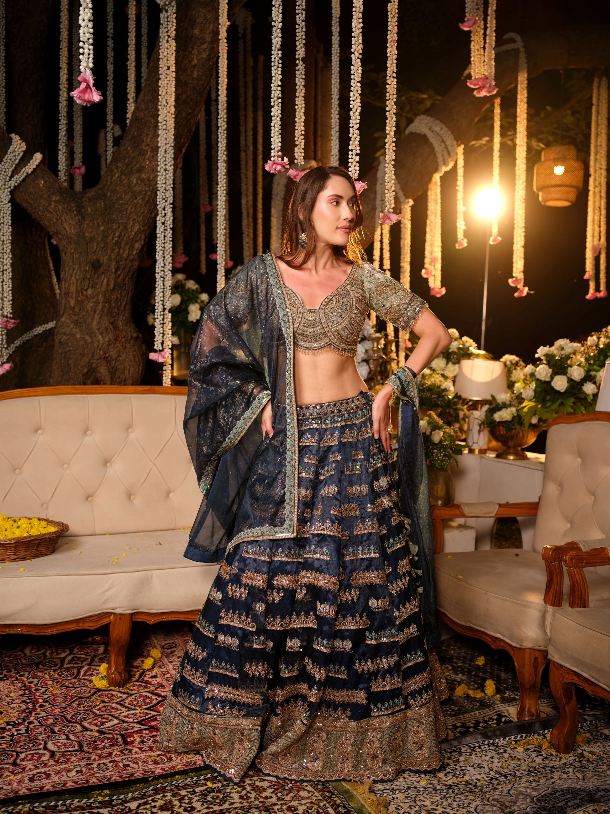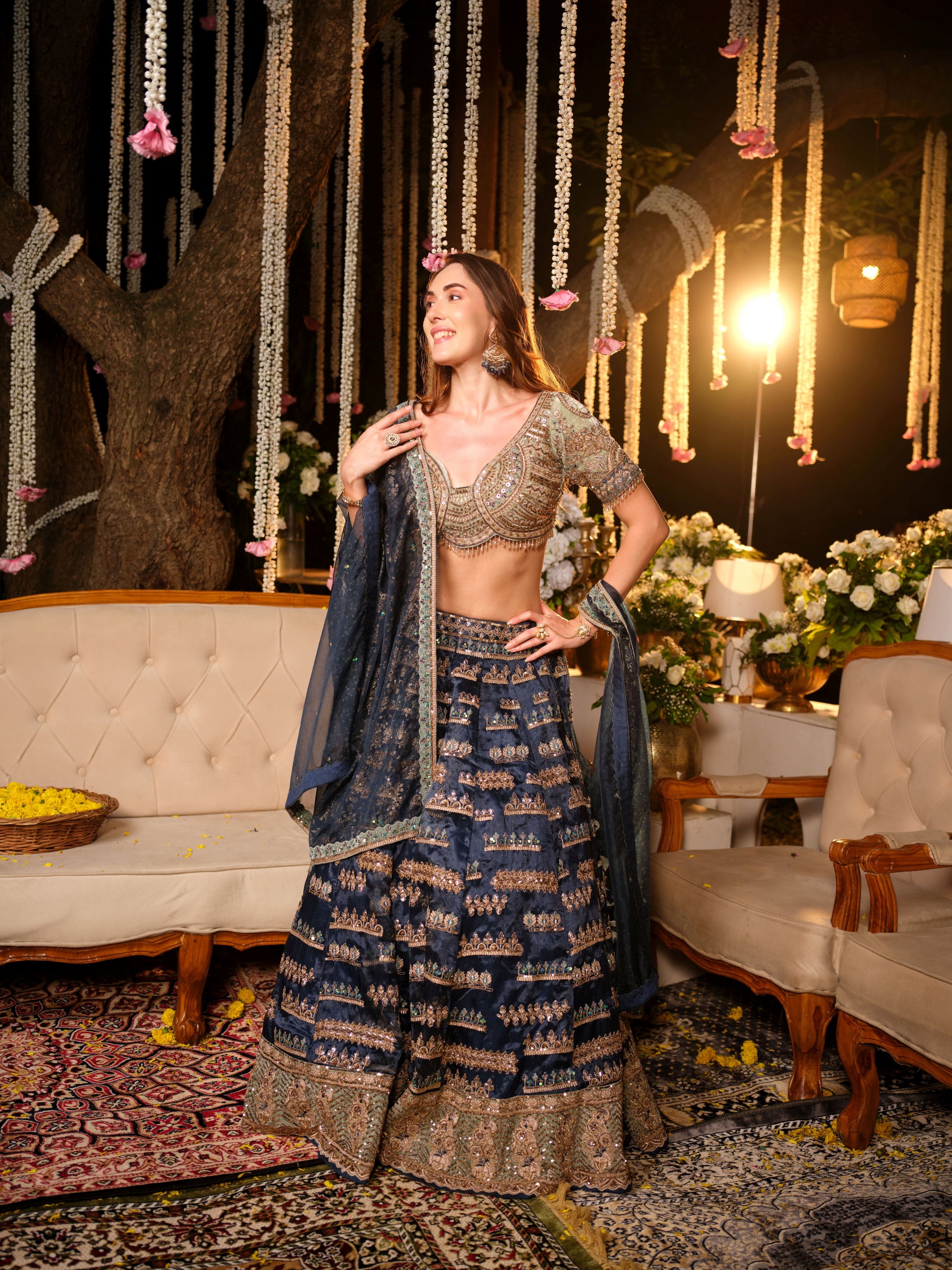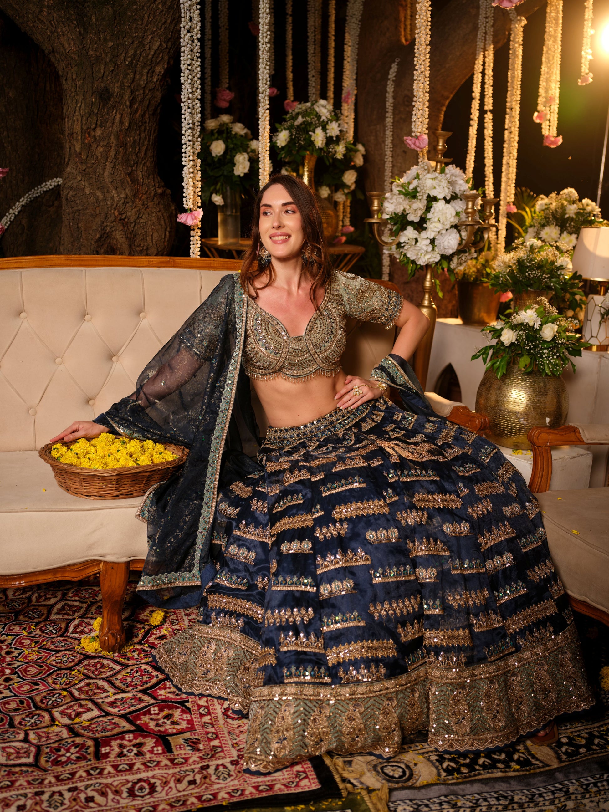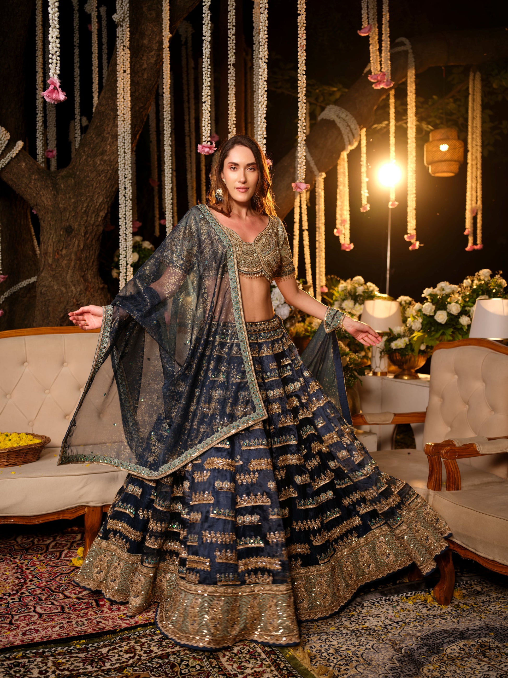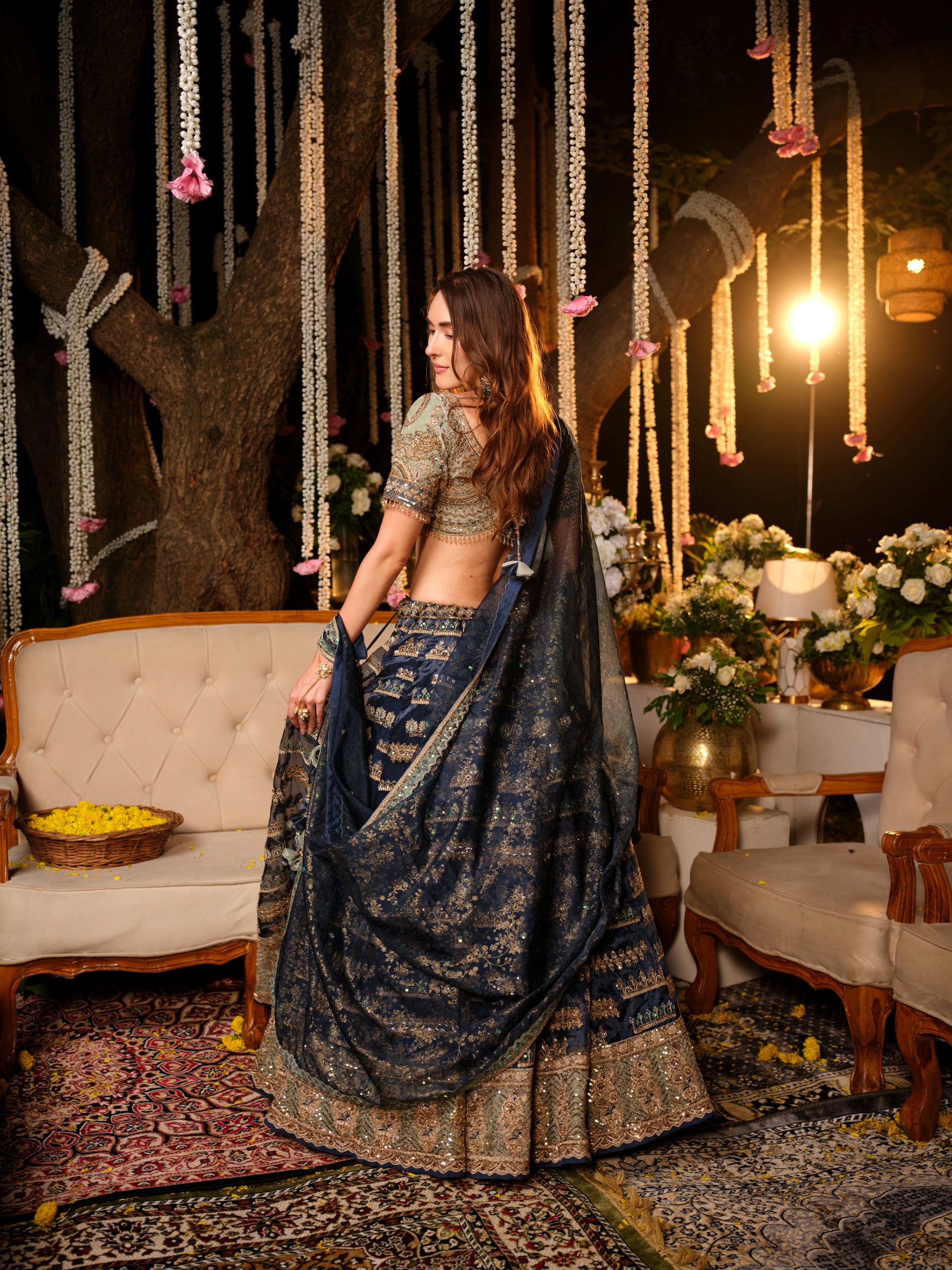 blouse features a sculpted neckline with heavy embellishments, beautifully complementing the flared skirt detailed with traditional motifs and ornate borders. The sheer dupatta with subtle embroidery and shimmering accents adds a refined finish, making this ensemble a perfect blend of regality and glamour.