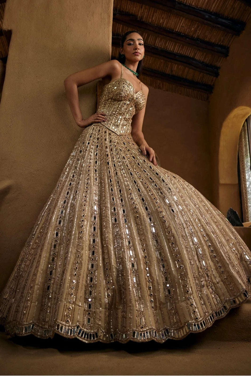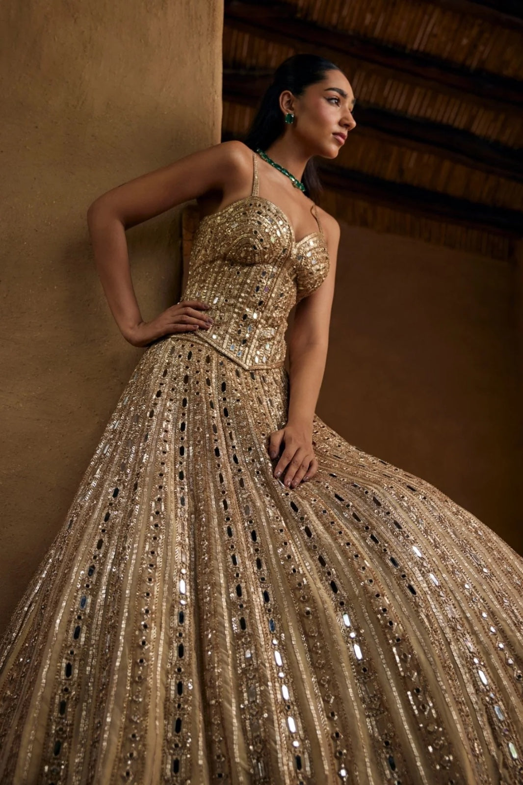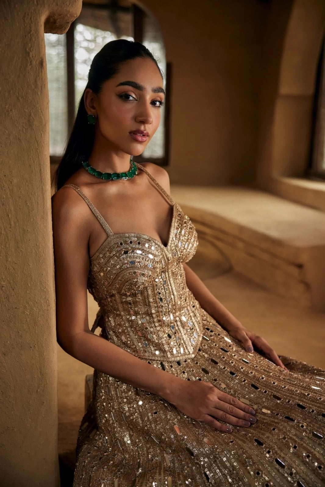 A breath taking mermaid silhouette gown intricately adorned with vertical sequin and mirror embellishments that create a striking play of light with every movement. The structured corset bodice, paired with slender straps, enhances the feminine form, while the dramatic flare at the hem exudes grandeur and poise. The subtle shimmer and reflective detailing make this ensemble a statement of refined glamour and sophistication.