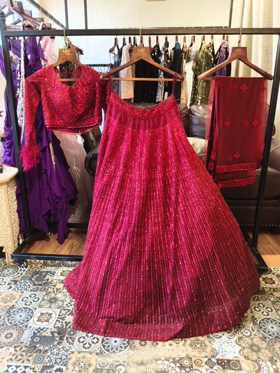 A full red lehenga, adorned with intricate embroidery and rich details, perfect for brides seeking a traditional yet striking look on their special day.