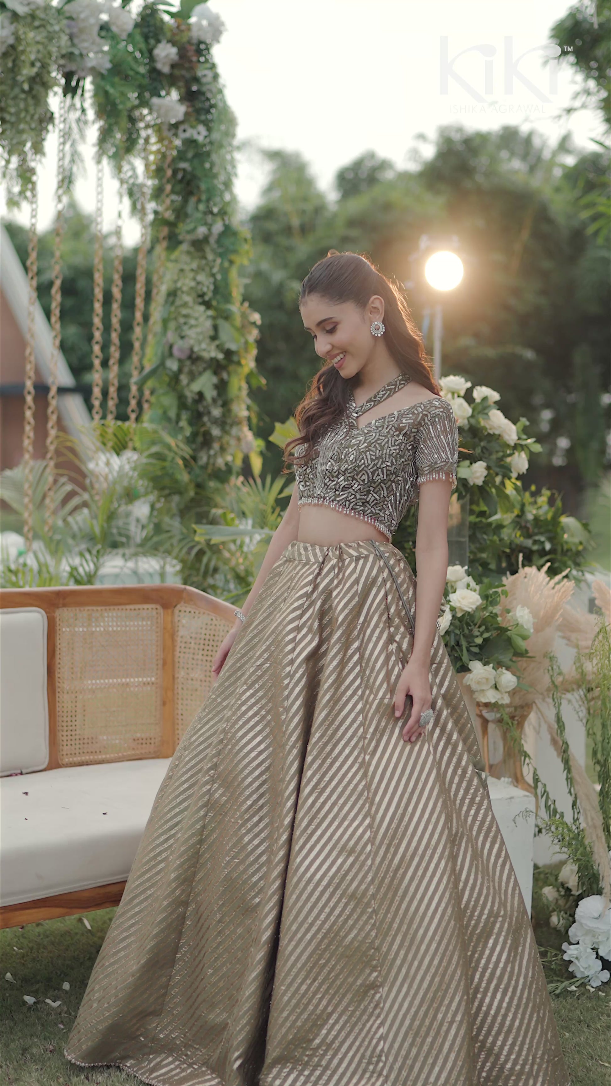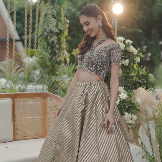 A regal antique gold lehenga set designed with modern metallic charm. The olive green blouse is heavily embellished with intricate bead and thread embroidery, while the flared gold skirt shimmers with diagonal striped patterns, giving it a rich, contemporary edge. Paired with subtle tassel details at the waist, this ensemble perfectly balances grandeur with elegance.
