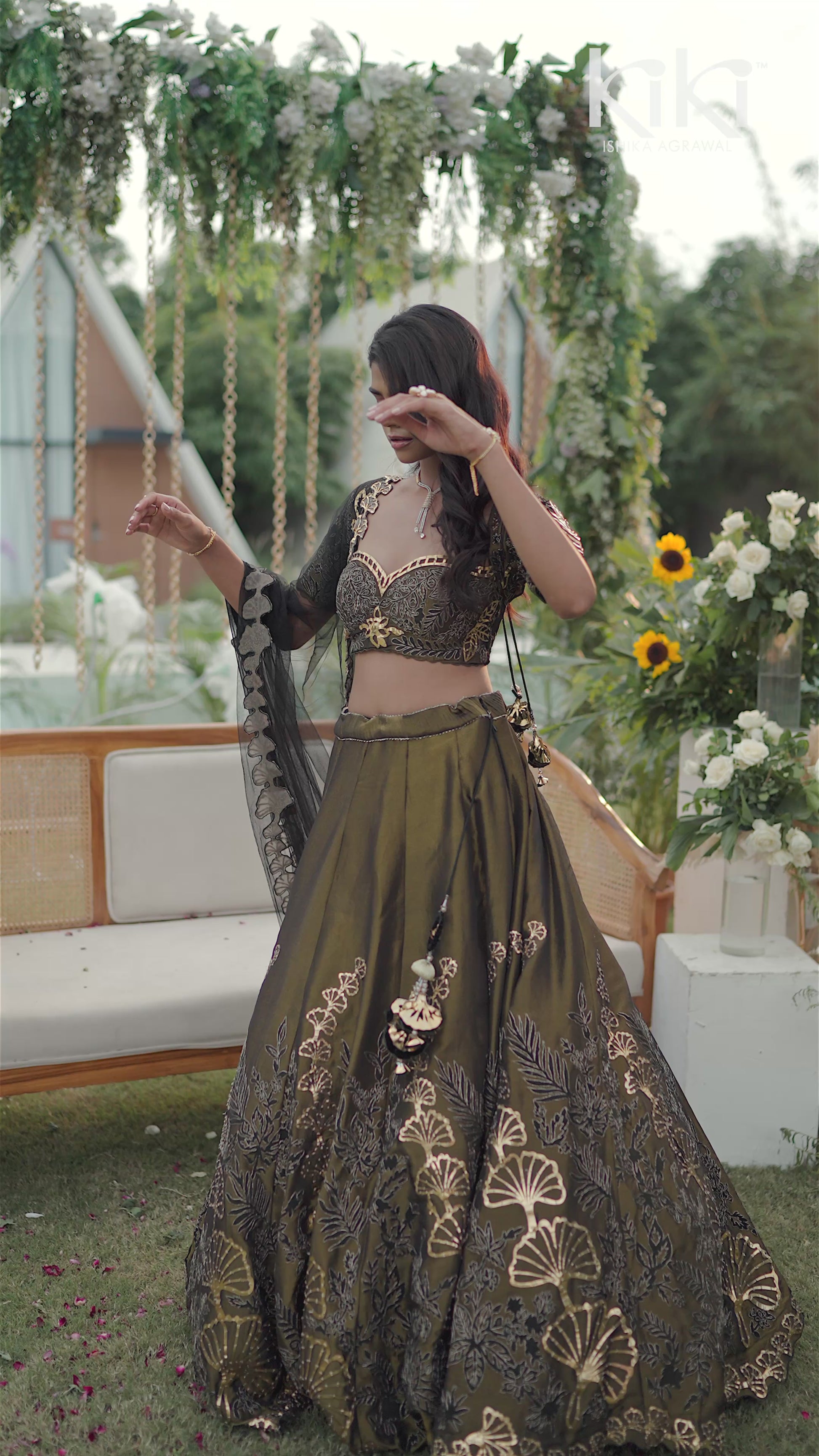 An opulent olive green lehenga set crafted in rich fabric with intricate golden embroidery. The sweetheart neckline blouse is delicately embellished with sequins and threadwork, paired with a flared lehenga featuring ornate floral and leaf-inspired motifs in shimmering gold. A sheer black dupatta with scalloped embroidered edging enhances the dramatic charm, making this outfit a true showstopper.
