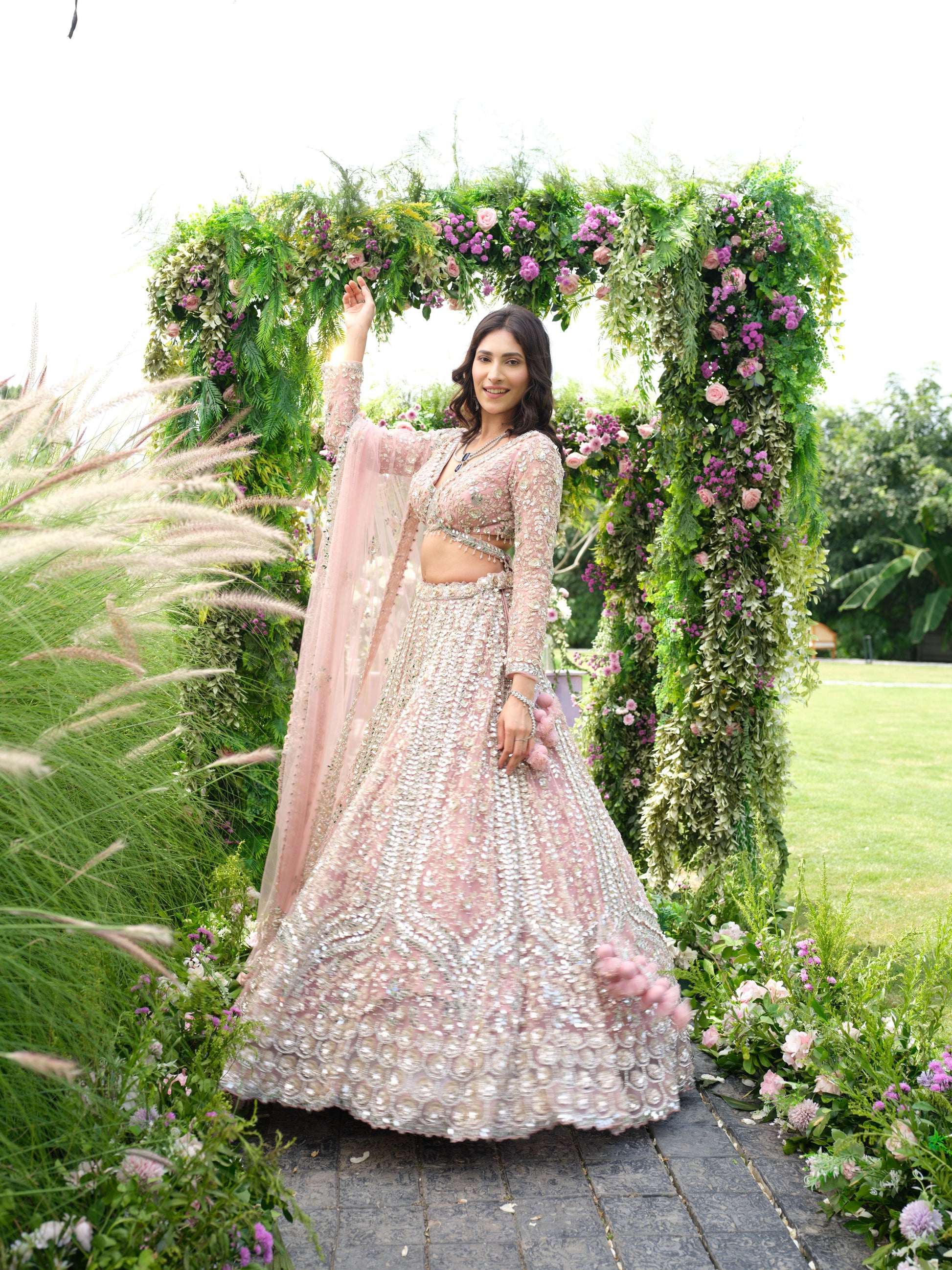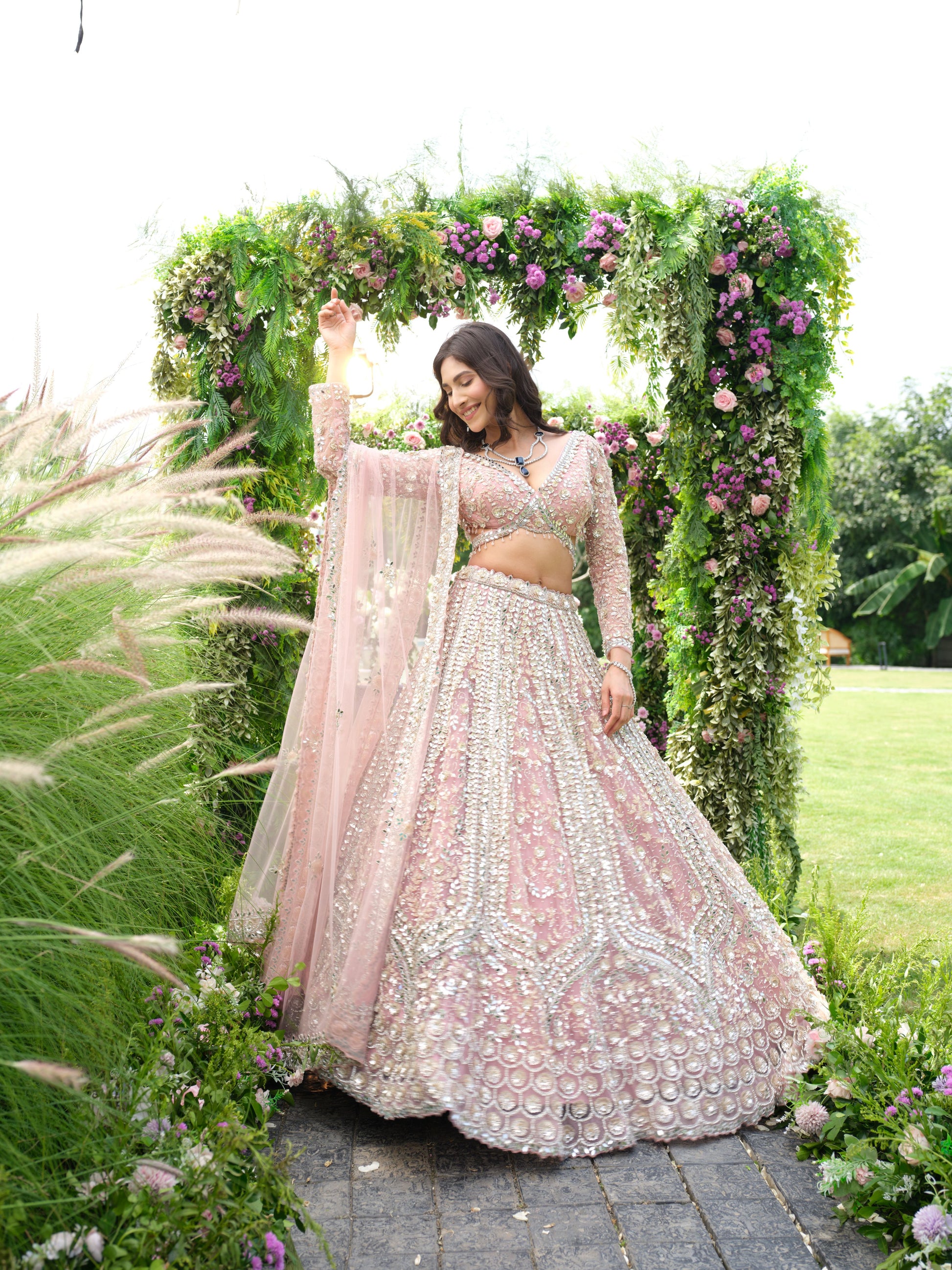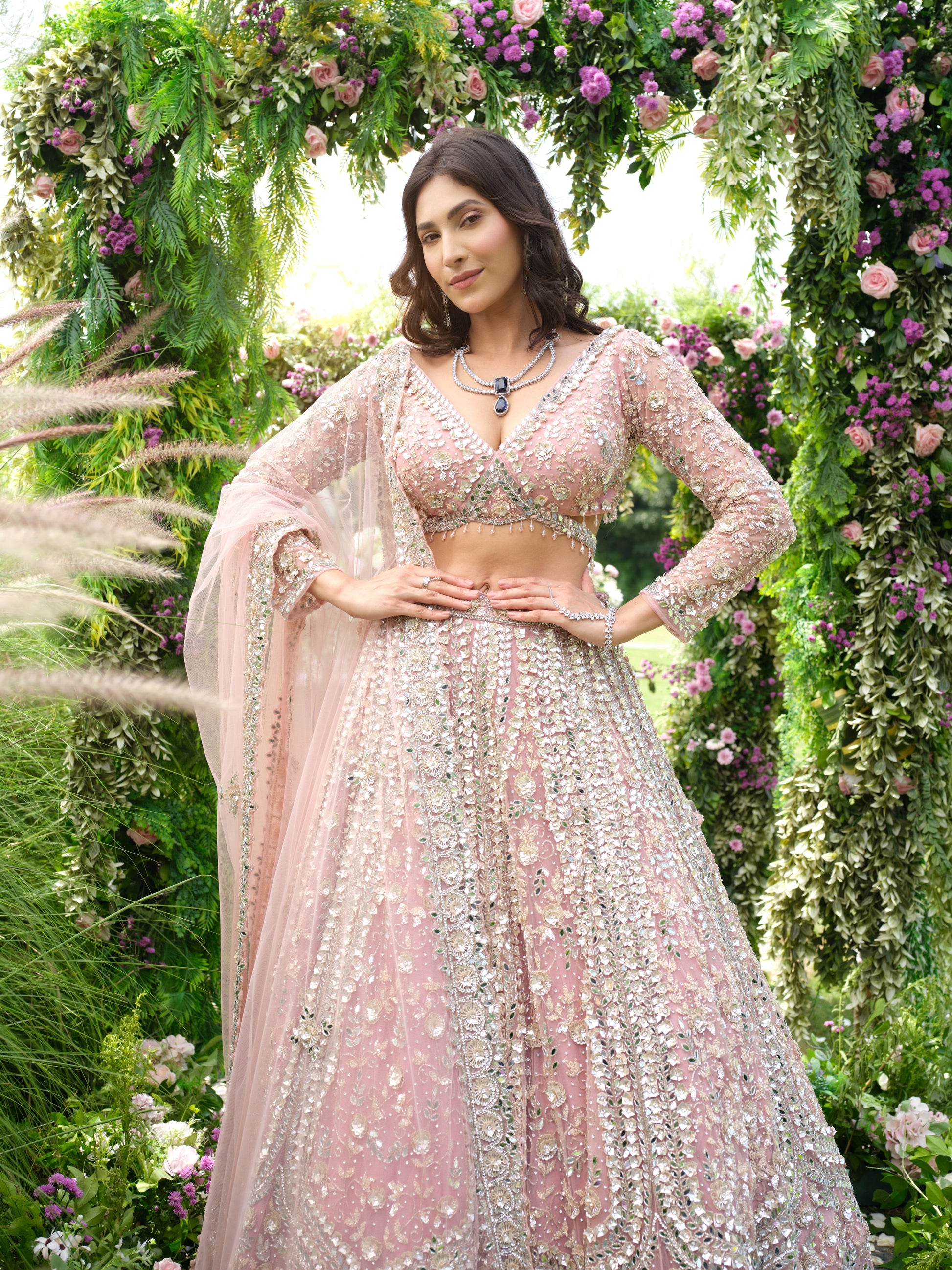 A dreamy blush pink lehenga set lavishly adorned with sequins, reflective mirror work, and intricate embroidery. The blouse features a plunging neckline with delicate detailing, paired with a voluminous skirt that sparkles with every movement. Styled with a sheer embellished dupatta, this ensemble exudes romance, grace, and modern sophistication.