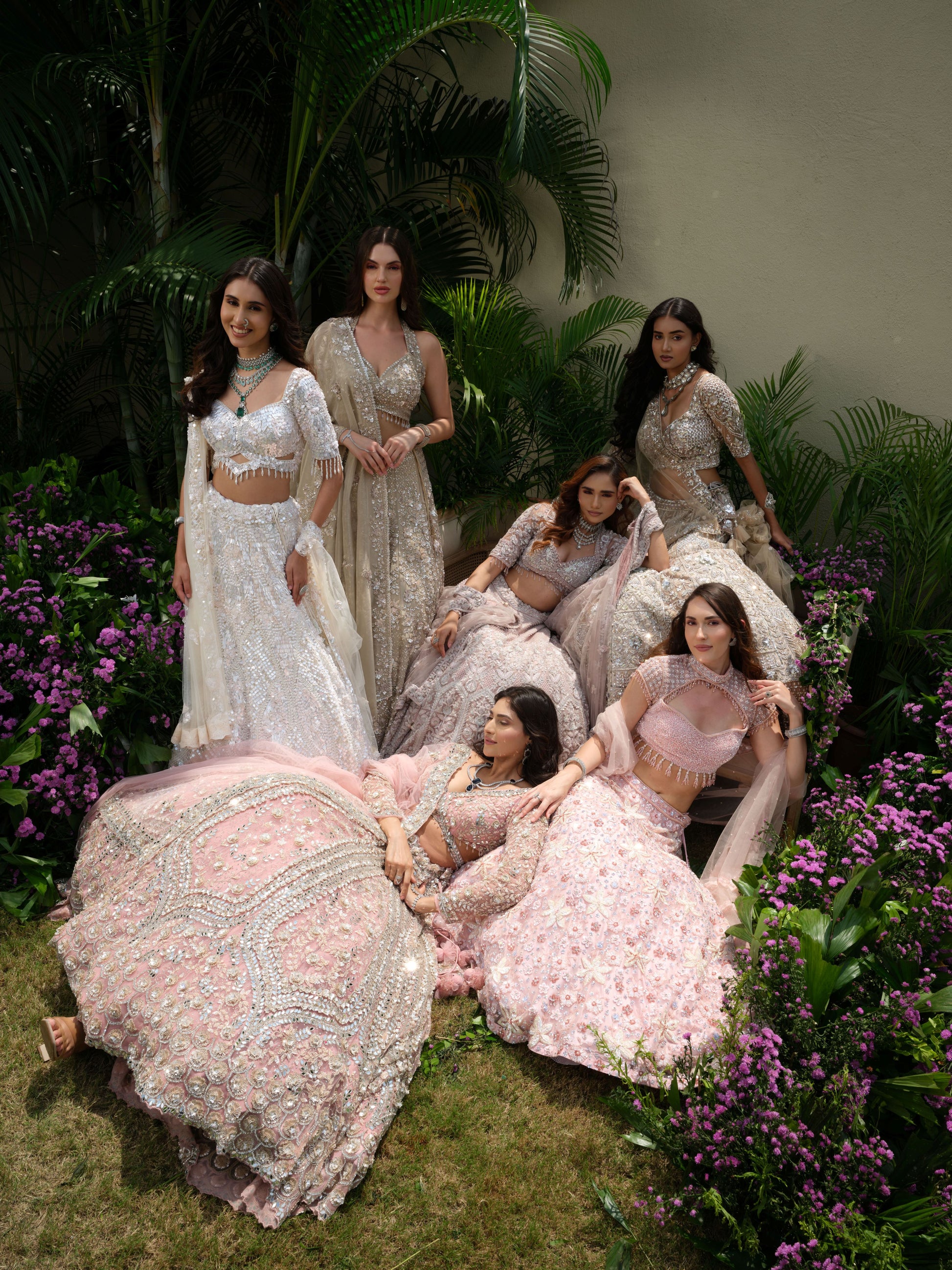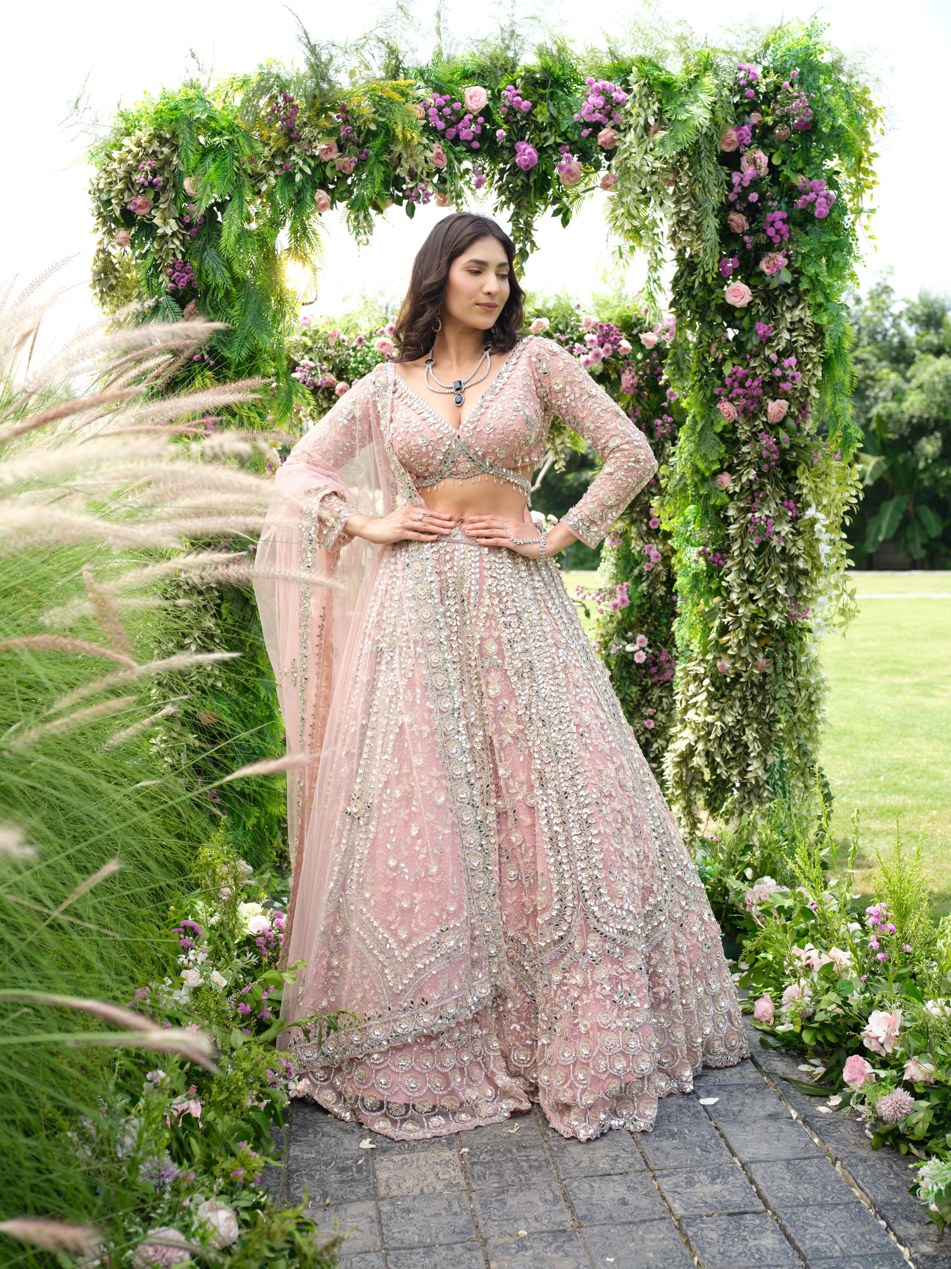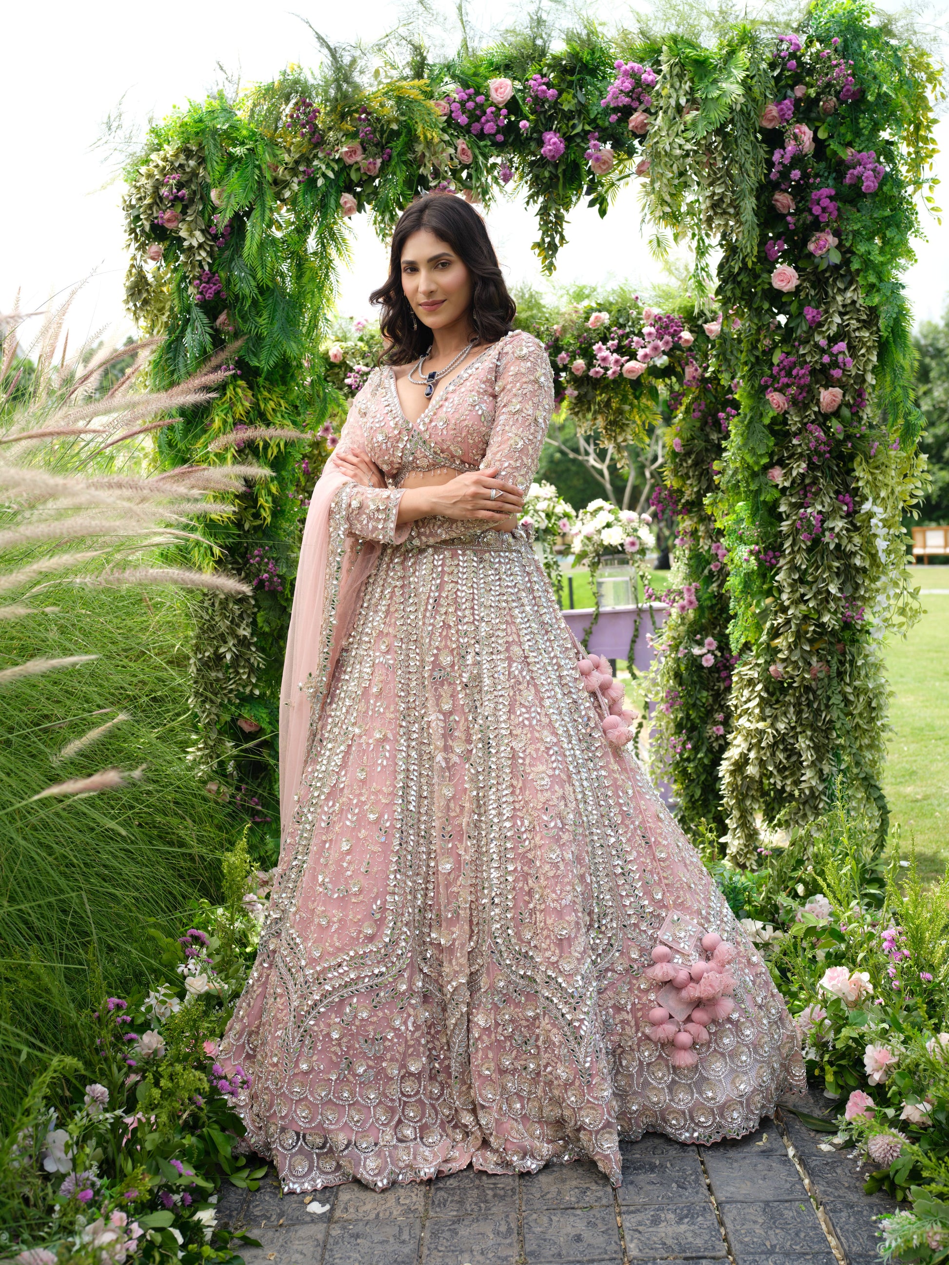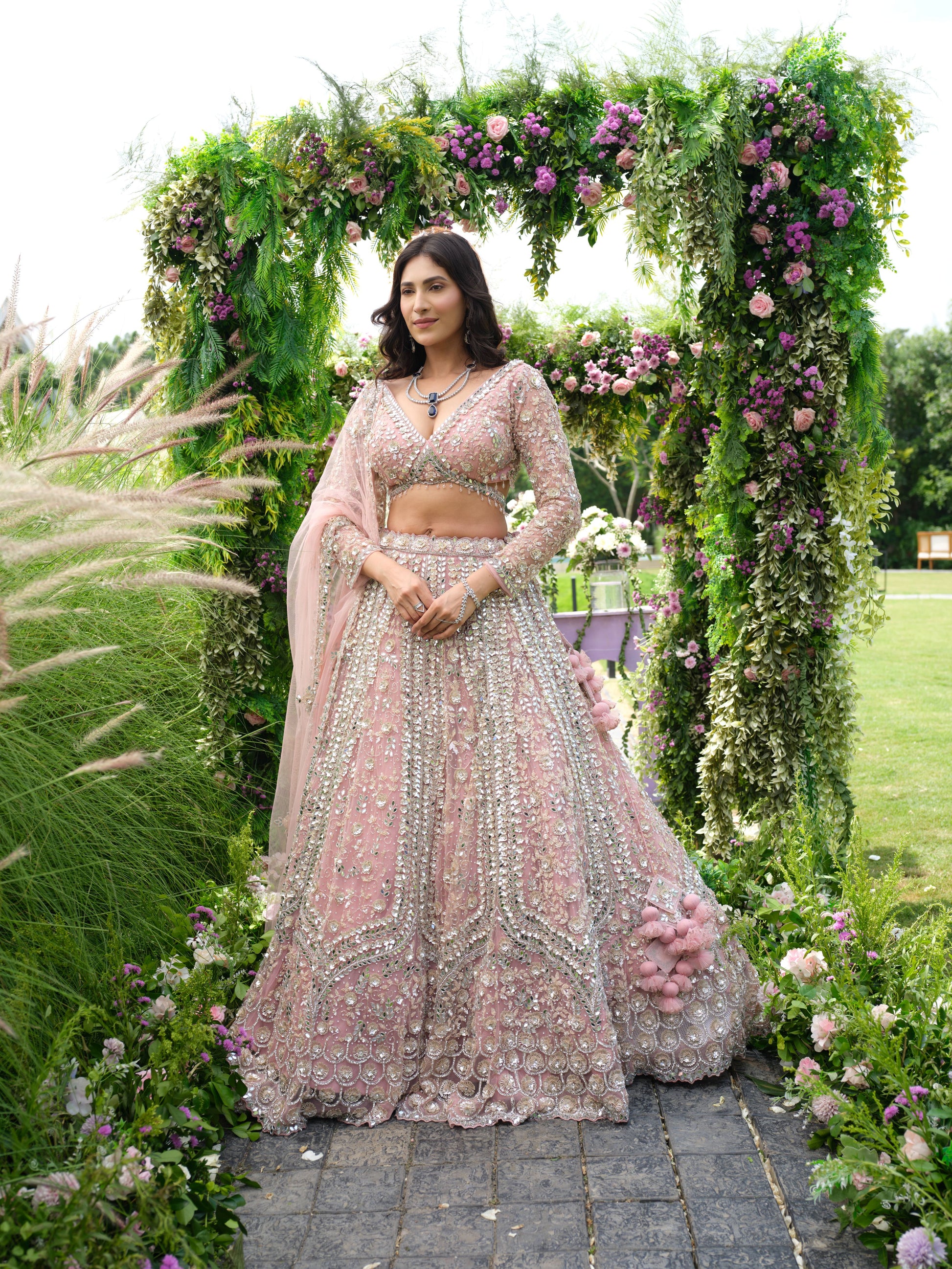 A dreamy blush pink lehenga set lavishly adorned with sequins, reflective mirror work, and intricate embroidery. The blouse features a plunging neckline with delicate detailing, paired with a voluminous skirt that sparkles with every movement. Styled with a sheer embellished dupatta, this ensemble exudes romance, grace, and modern sophistication.
