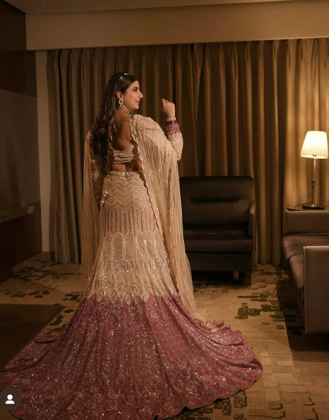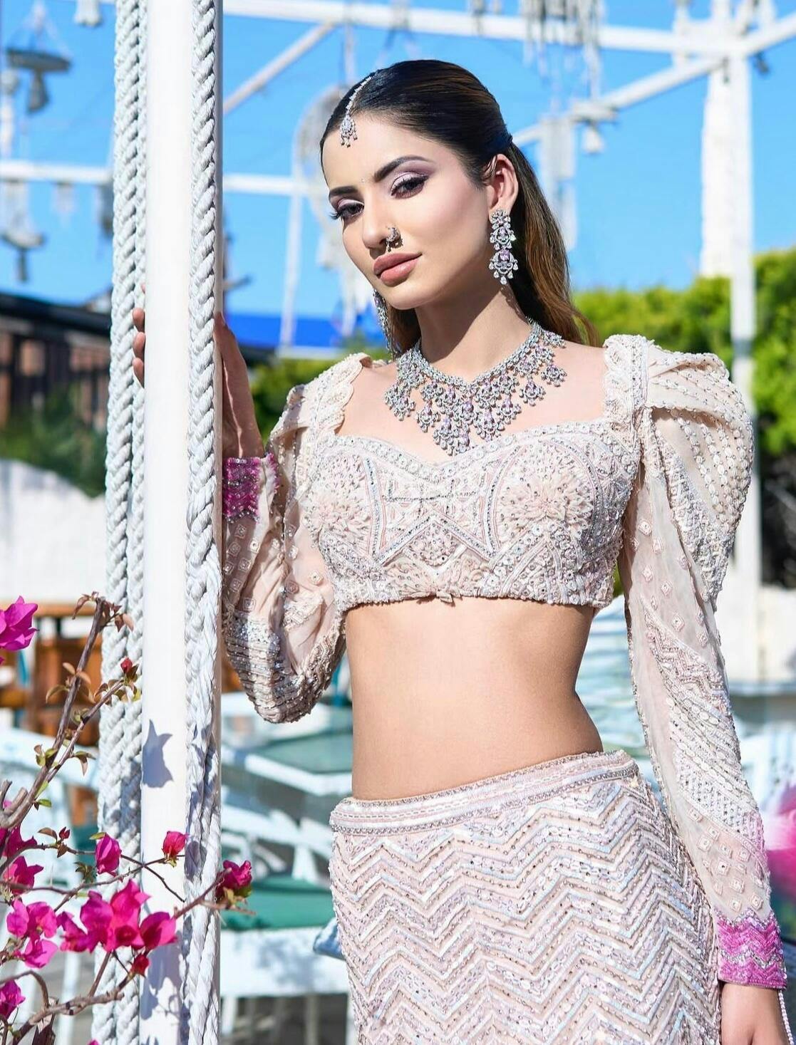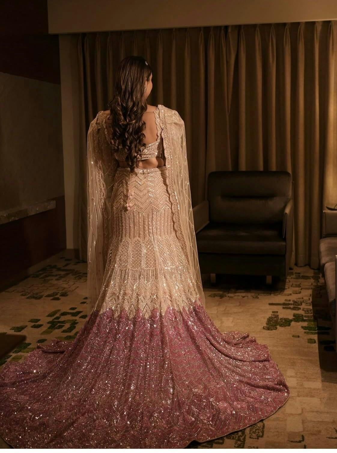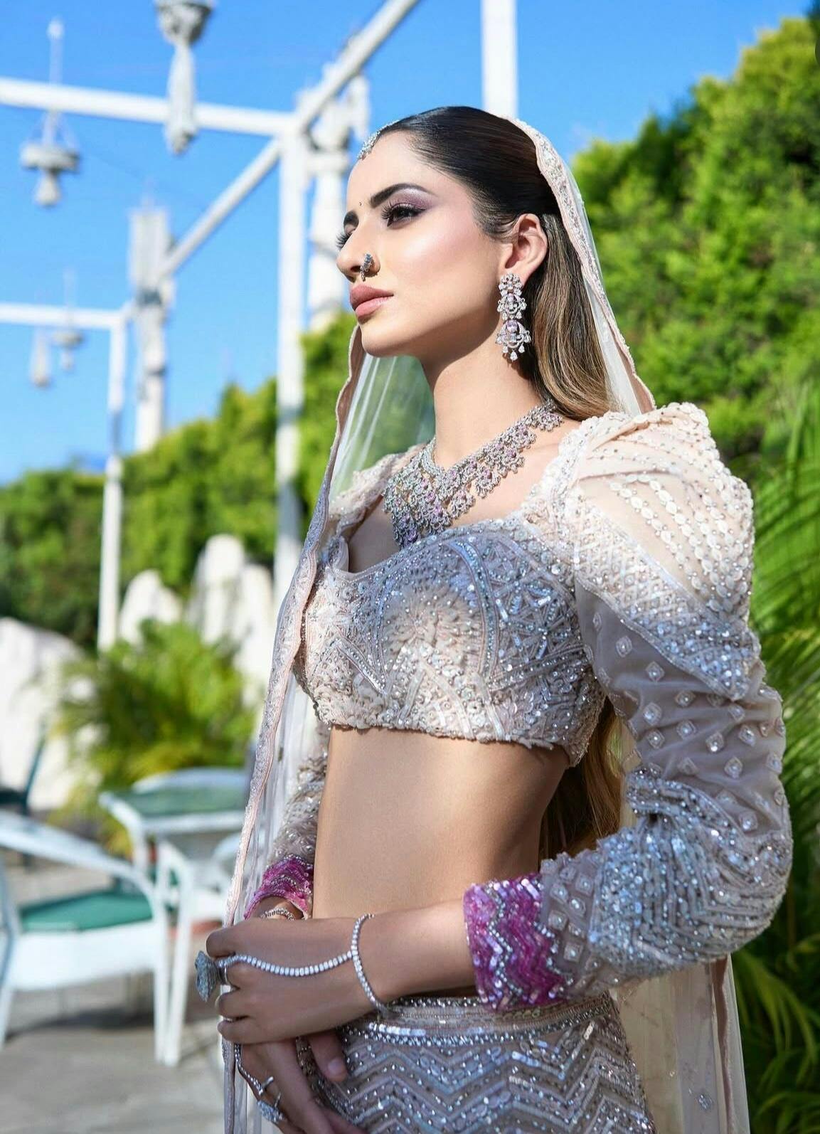 A beautiful silver and pink lehenga, featuring intricate detailing, perfect for a vibrant and elegant sangeet celebration.