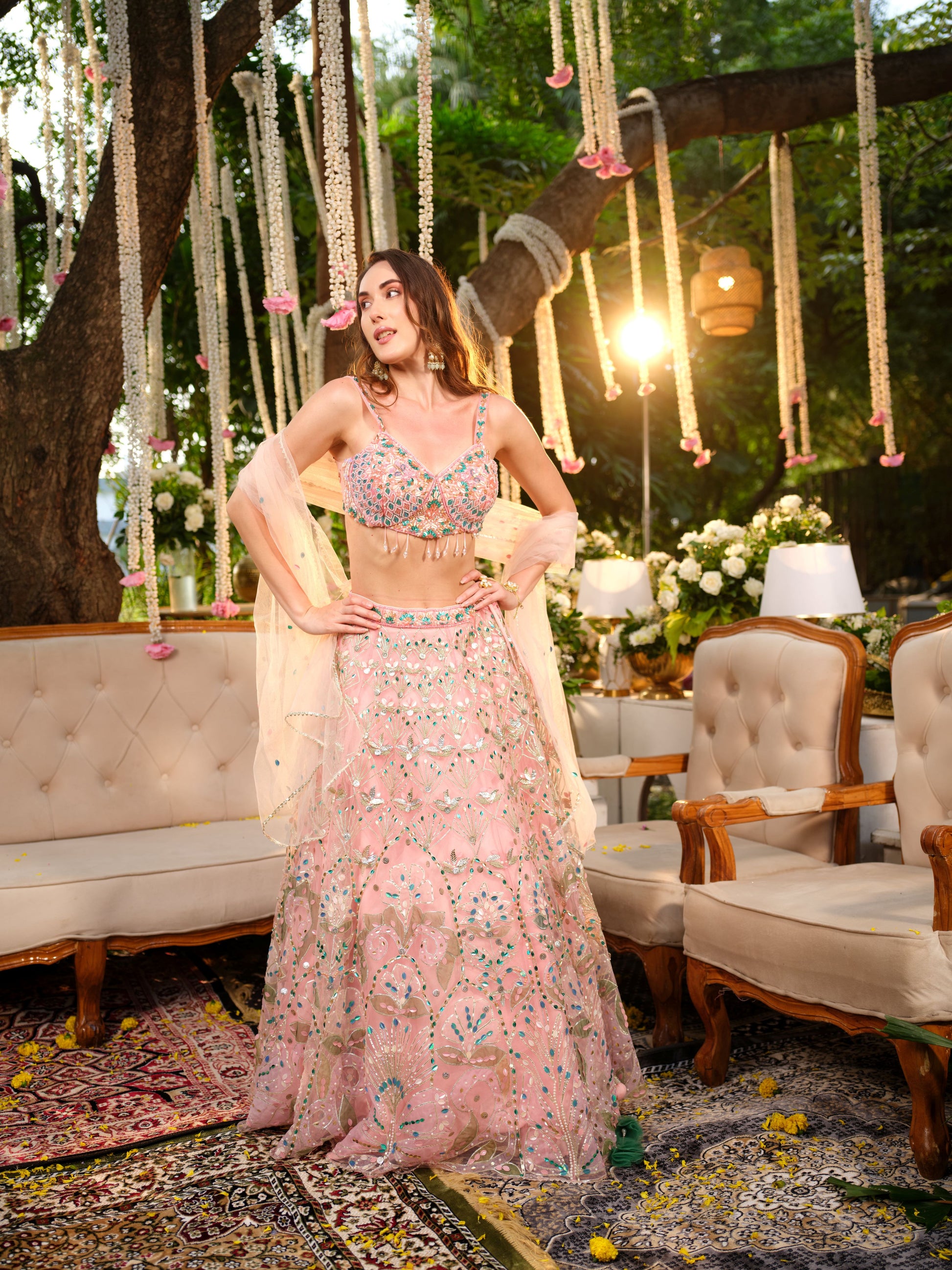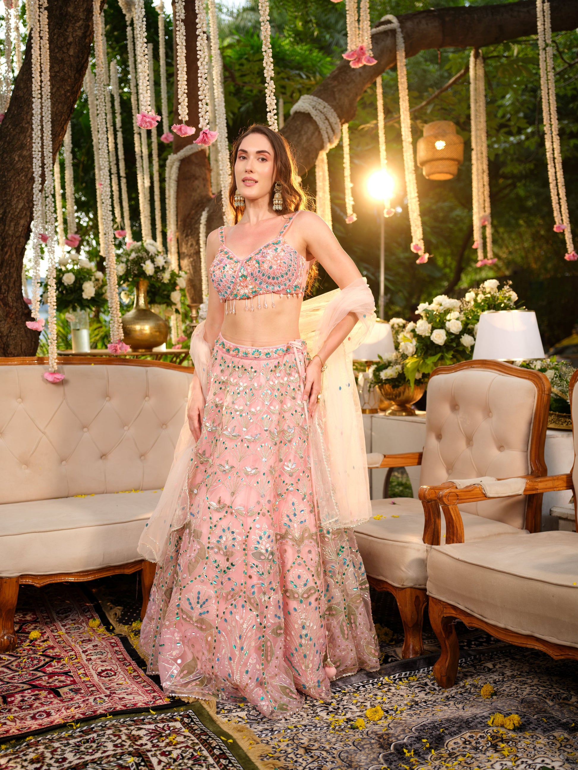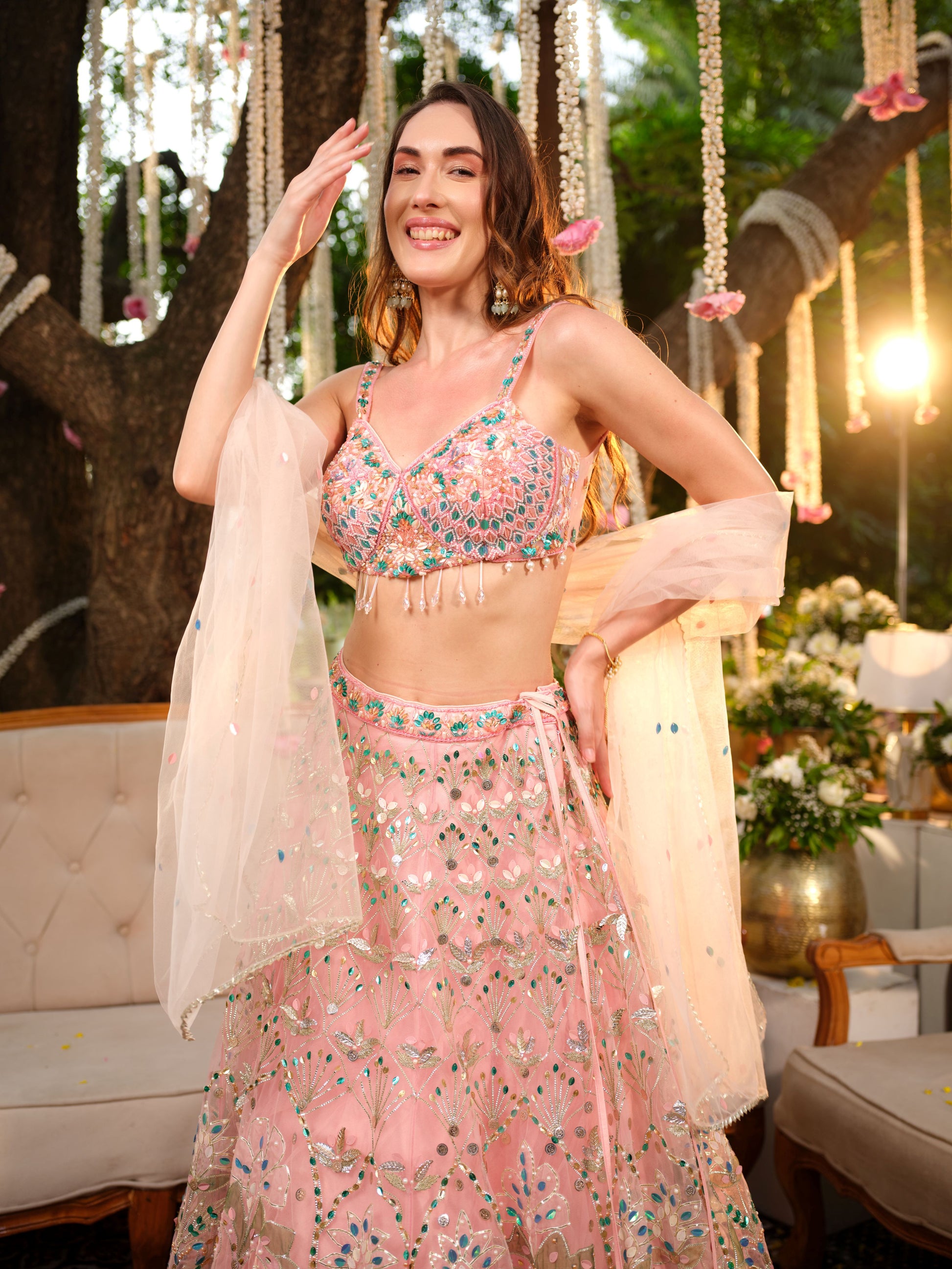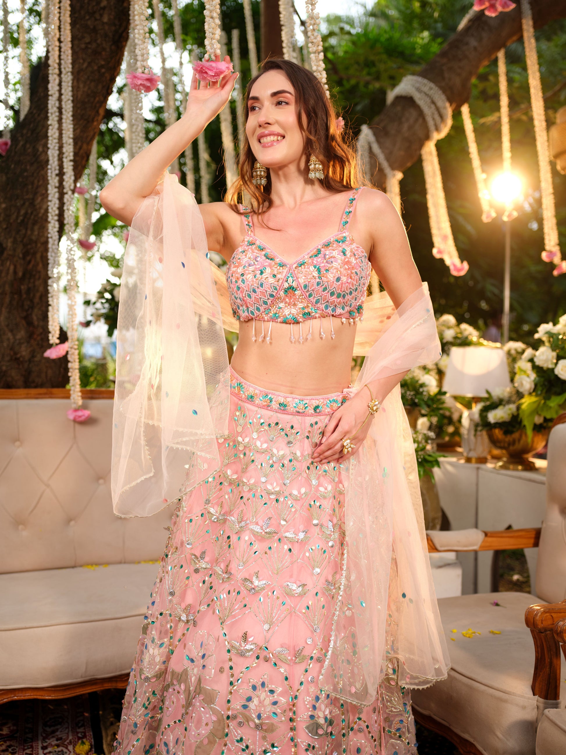 Delicate and dreamy, this pastel pink lehenga set captures the essence of modern romance. Adorned with intricate mirror and sequin work in multicoloured patterns, the lehenga glistens with subtle charm. The embellished blouse with tassel details and a sheer dupatta complete the ensemble, making it an ethereal choice for celebrations.This outfit embodies grace, elegance, and effortless glamour.