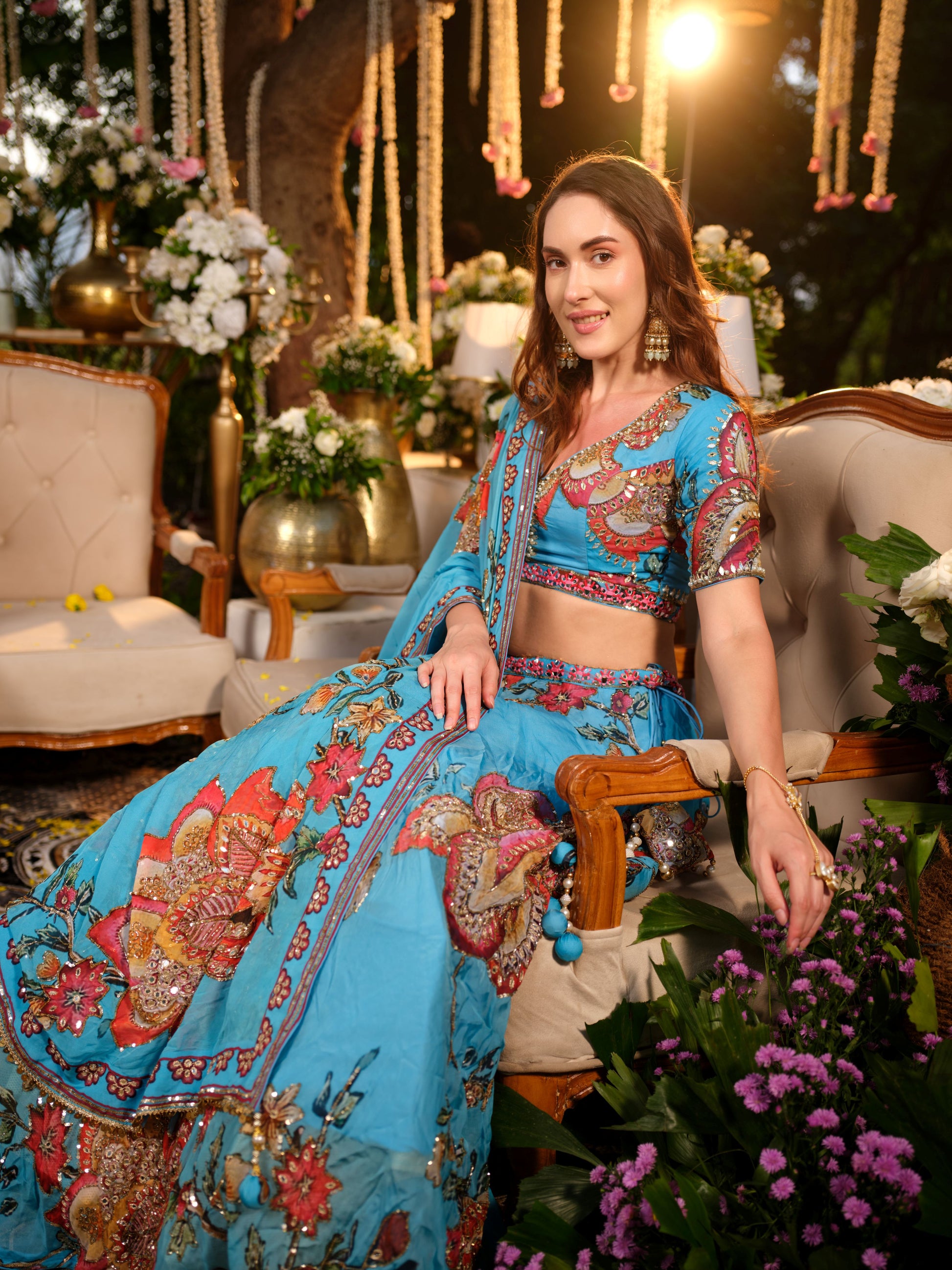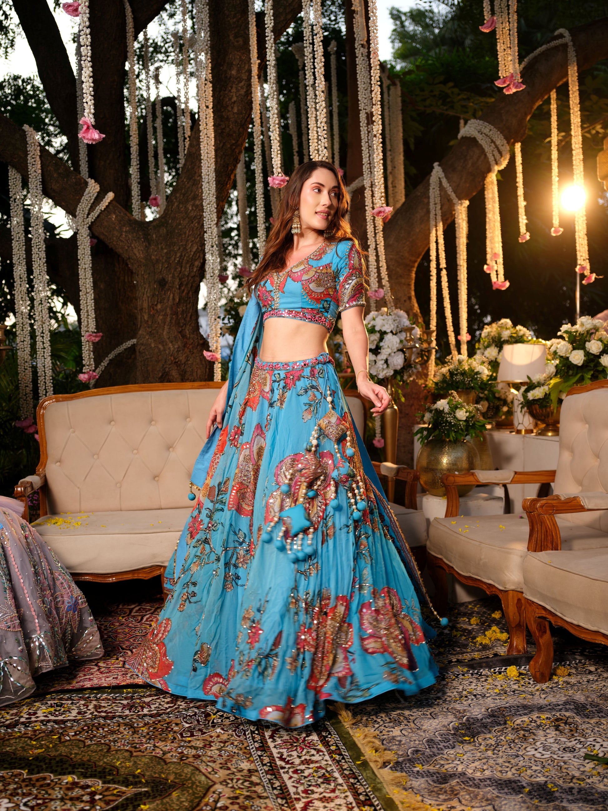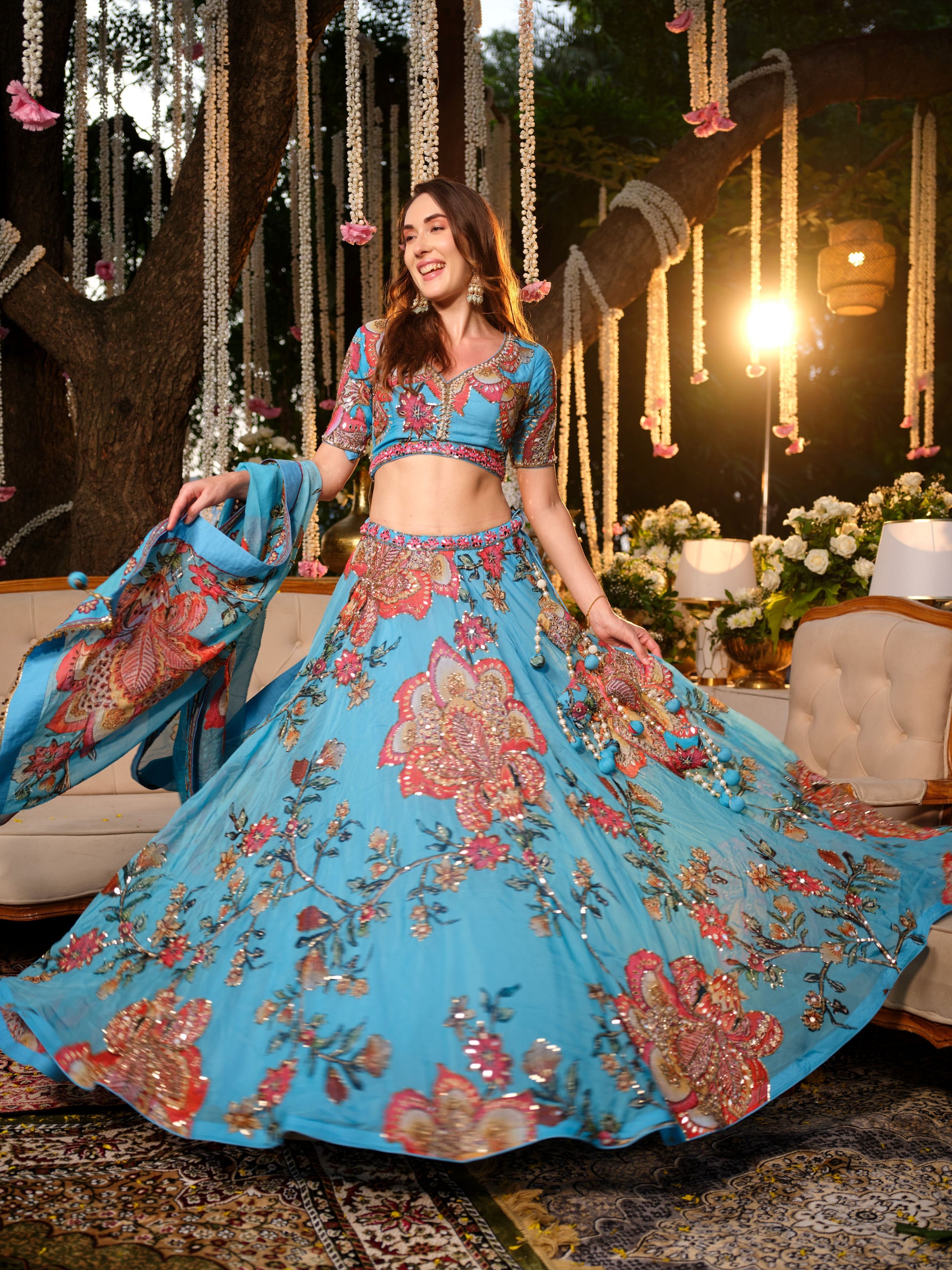 A radiant aqua blue lehenga set brought to life with oversized floral embroidery, shimmering sequins, and mirror highlights that exude festive grandeur. The blouse features coordinated embellishments with half sleeves, paired with a flowing lehenga skirt that makes a striking statement. A matching dupatta completes the look, adding balance and elegance to this vibrant ensemble.