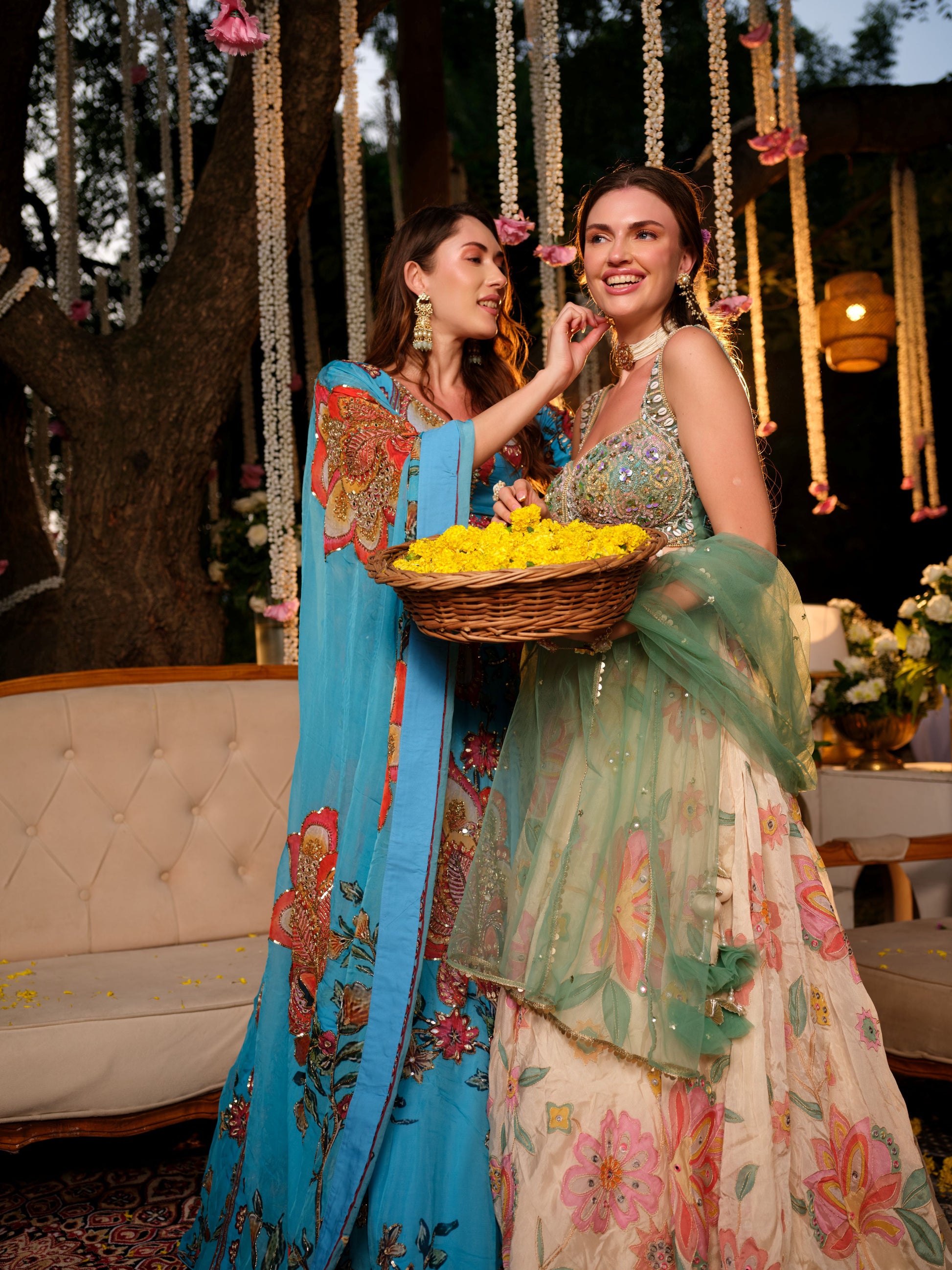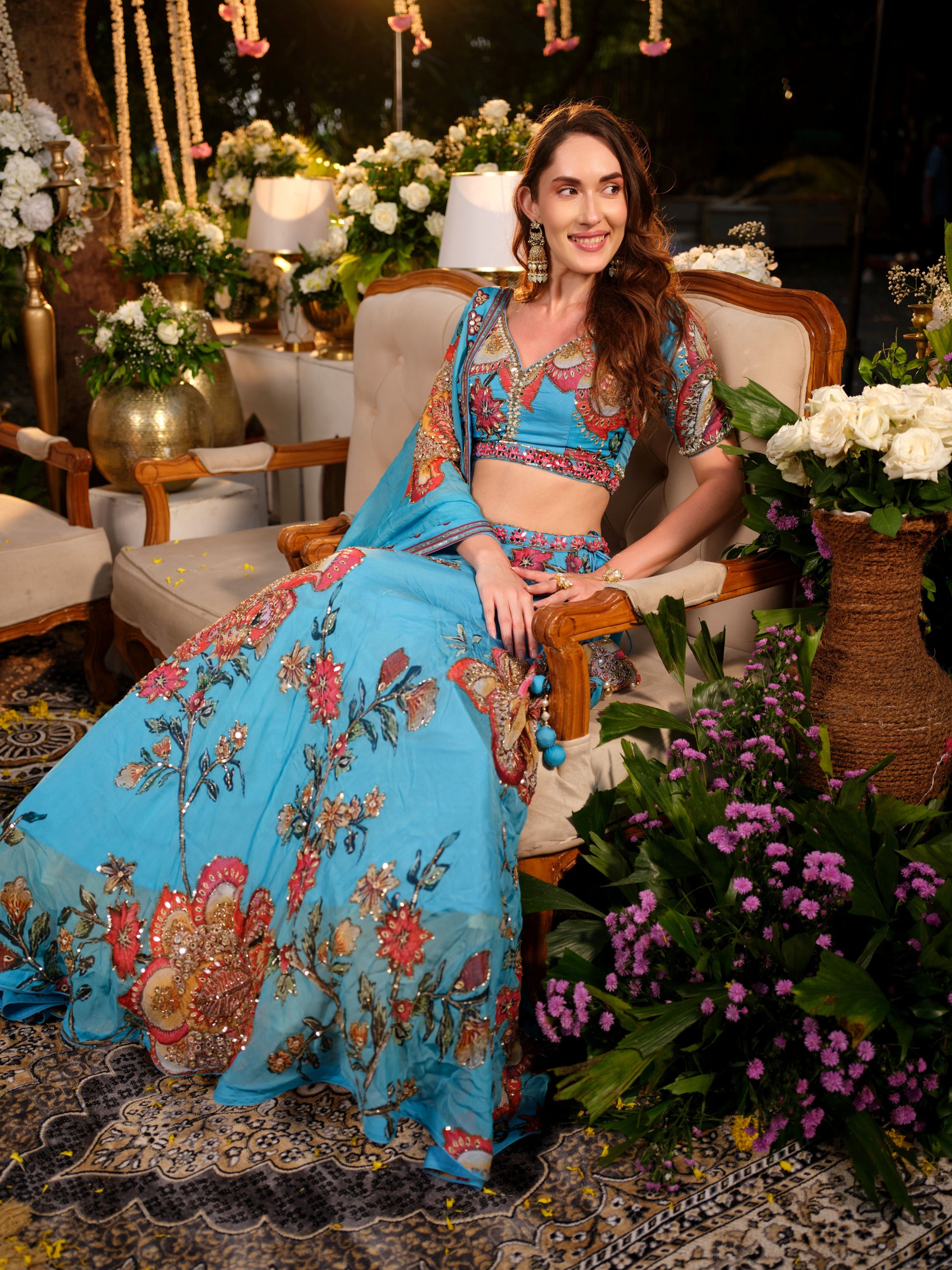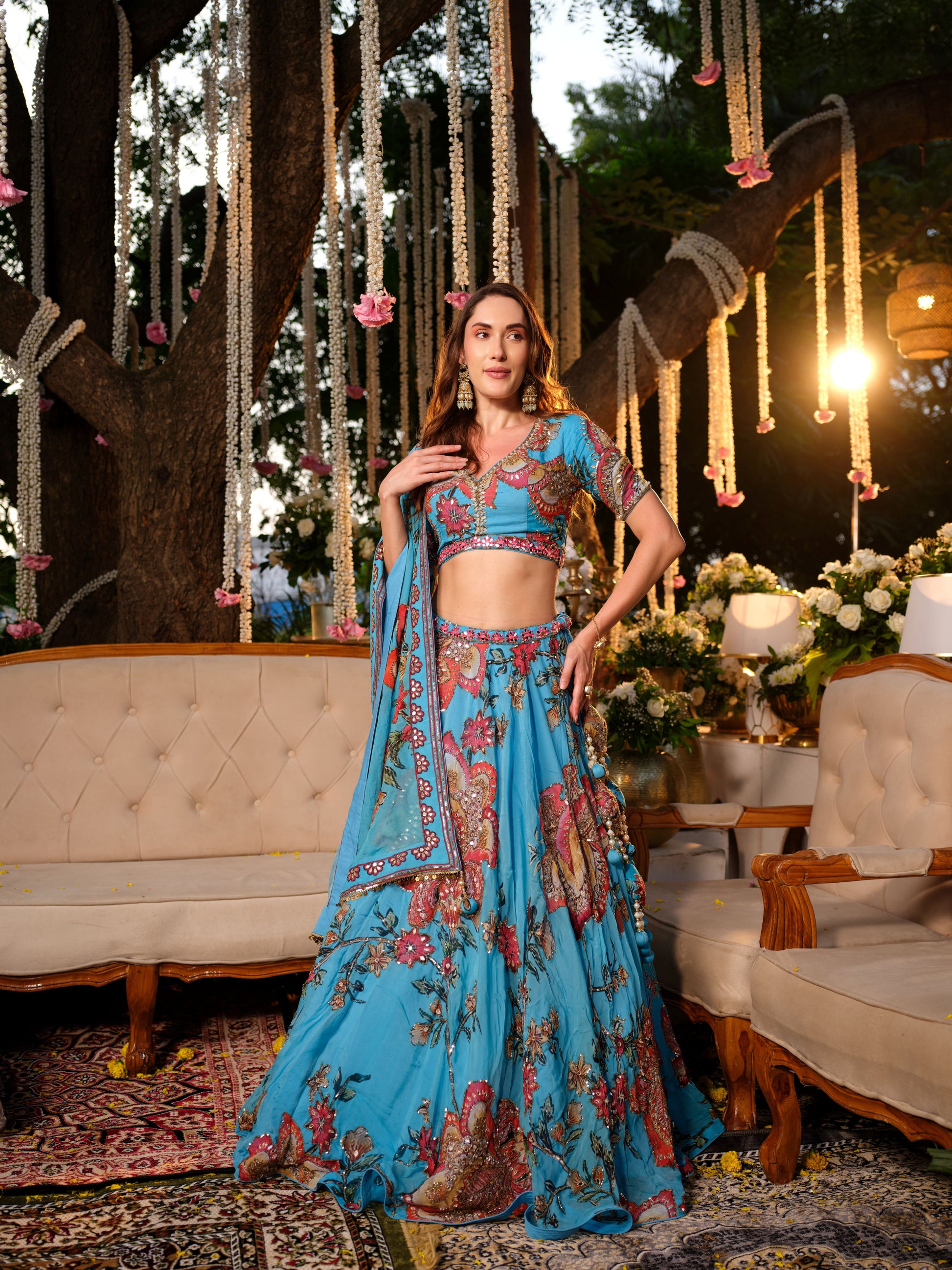 A radiant aqua blue lehenga set brought to life with oversized floral embroidery, shimmering sequins, and mirror highlights that exude festive grandeur. The blouse features coordinated embellishments with half sleeves, paired with a flowing lehenga skirt that makes a striking statement. A matching dupatta completes the look, adding balance and elegance to this vibrant ensemble.