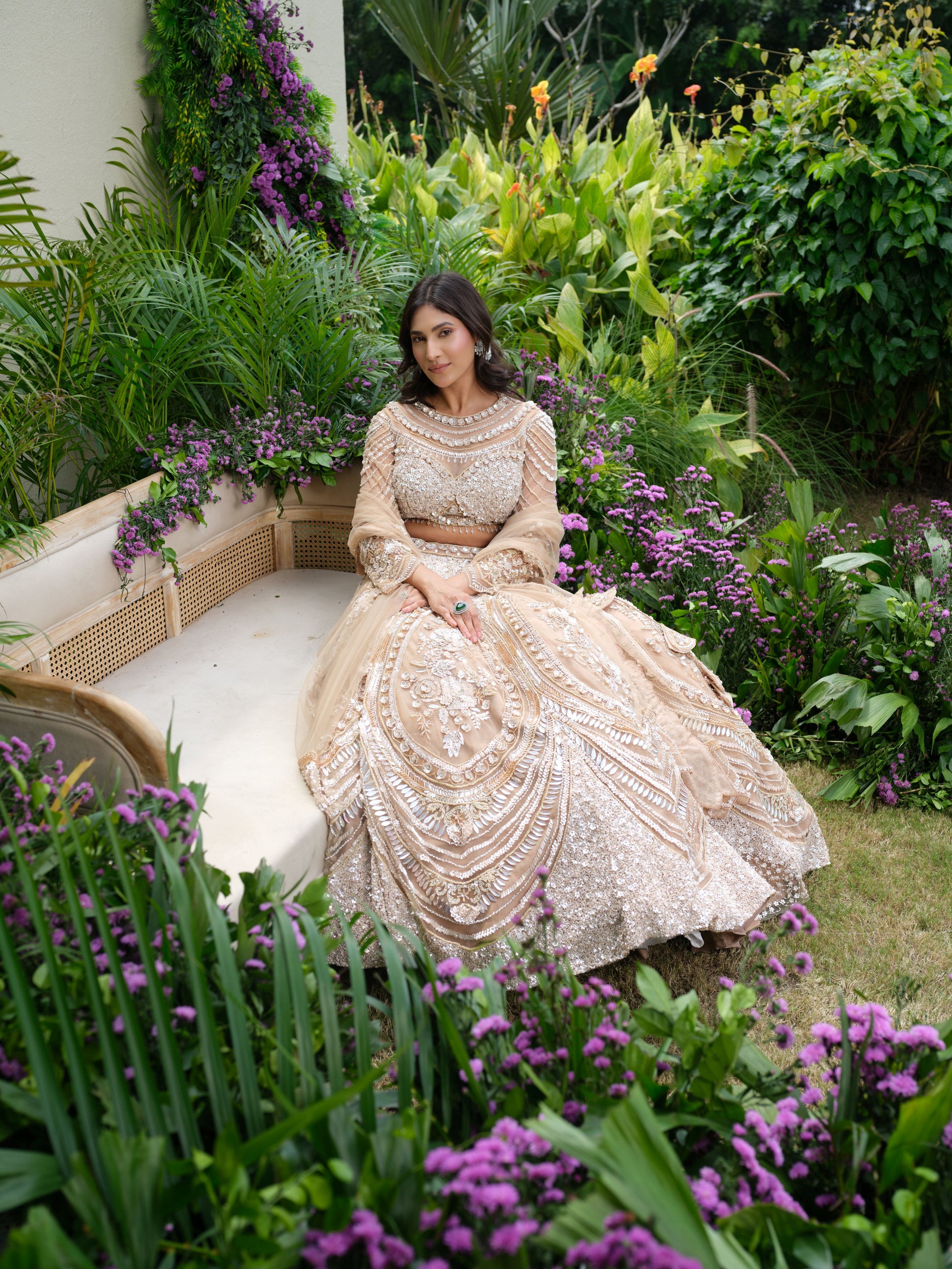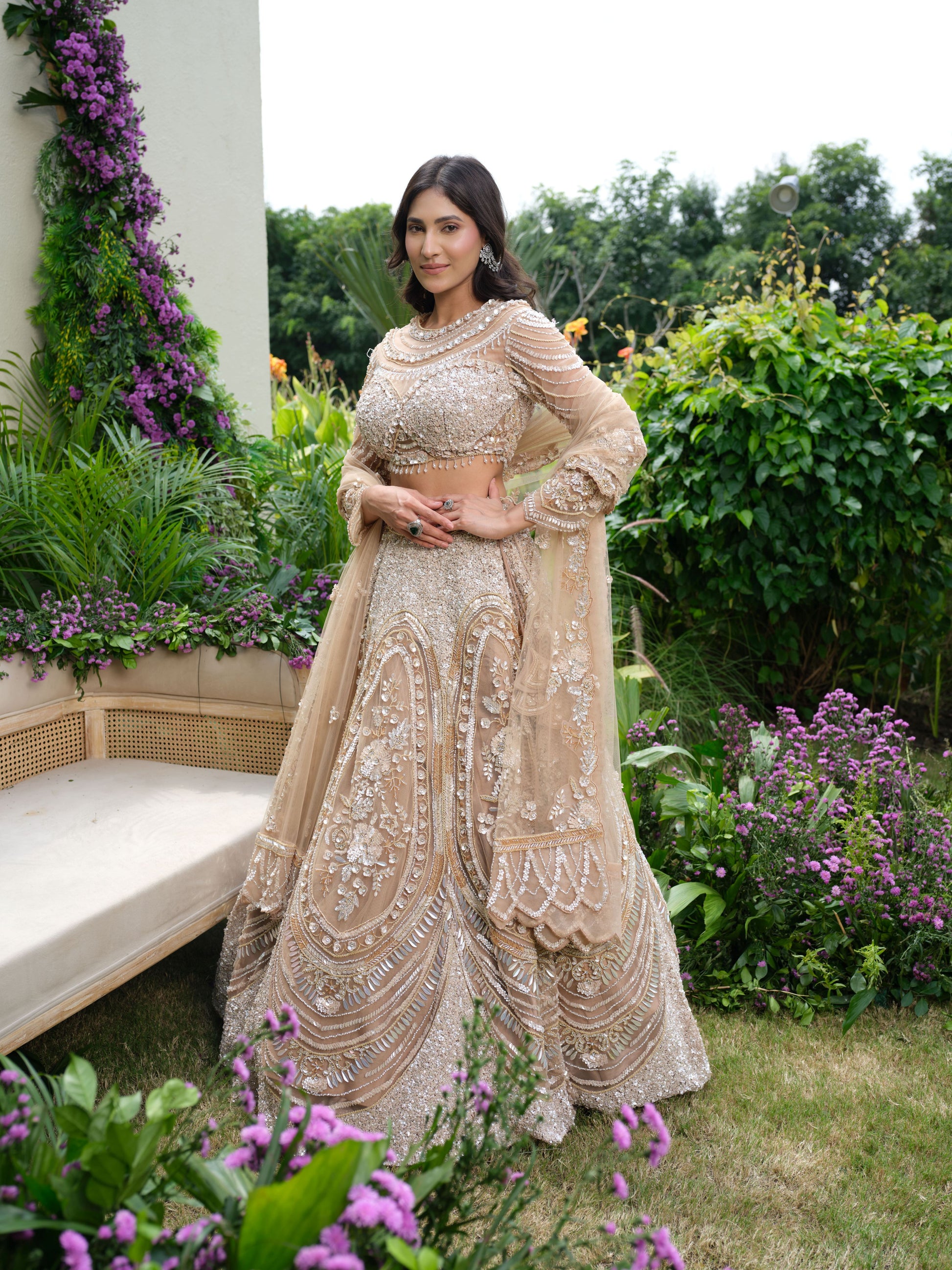 A refined nude gold lehenga set, exquisitely crafted with shimmering sequins, intricate thread embroidery, and delicate mirror work. The blouse features full sheer sleeves with ornate embellishments, paired with a flowing skirt that showcases detailed floral and geometric motifs. The sheer dupatta with a subtle border completes the look, making it a statement of understated opulence and modern elegance.