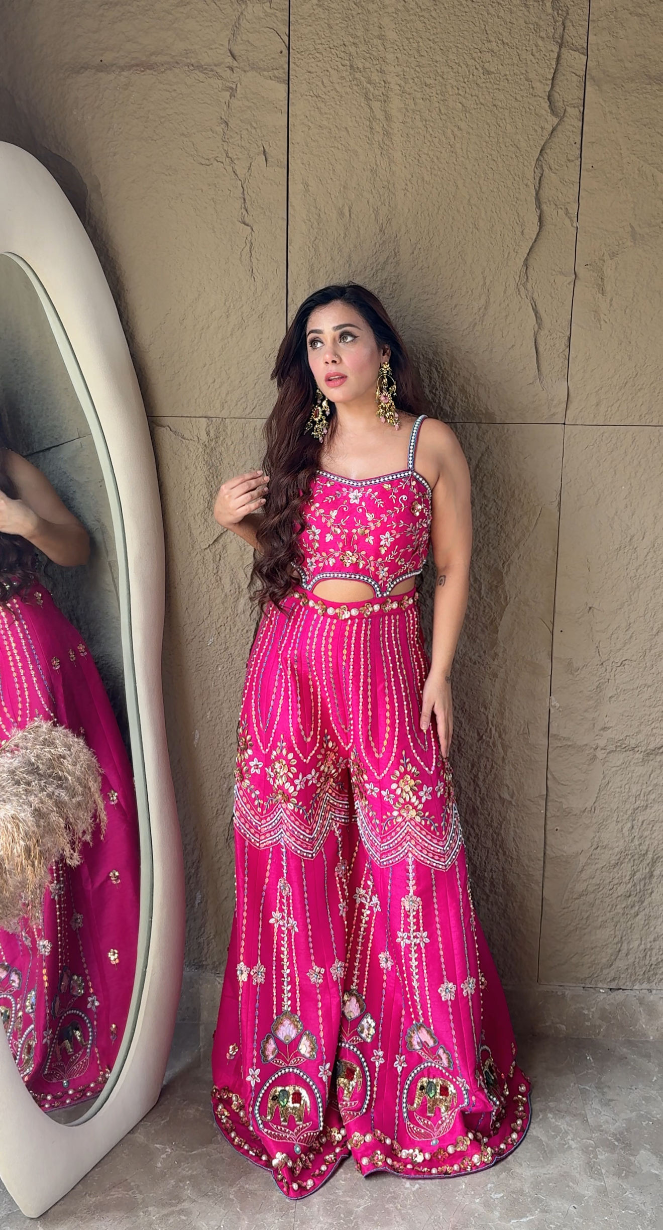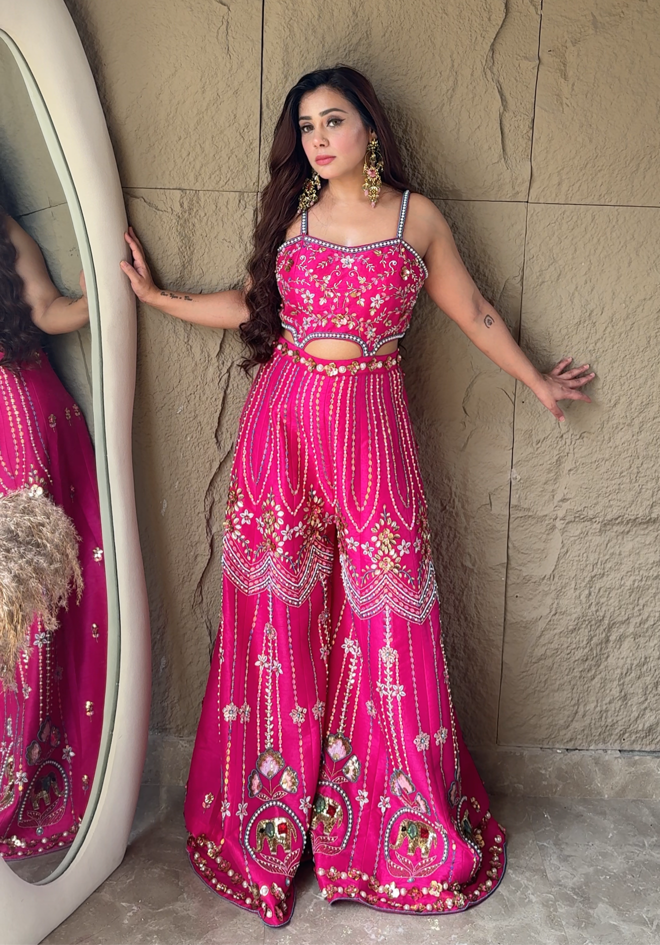 A bold and vibrant Indo-western ensemble, this fuchsia pink palazzo set is a stunning fusion of tradition and contemporary fashion. The sleeveless crop top features intricate floral embroidery with a unique front cut-out, paired with wide-legged palazzos showcasing rich, detailed motifs including traditional elephant designs. Crafted in a smooth satin-silk blend, the set is perfect for making a grand entrance at any celebration.