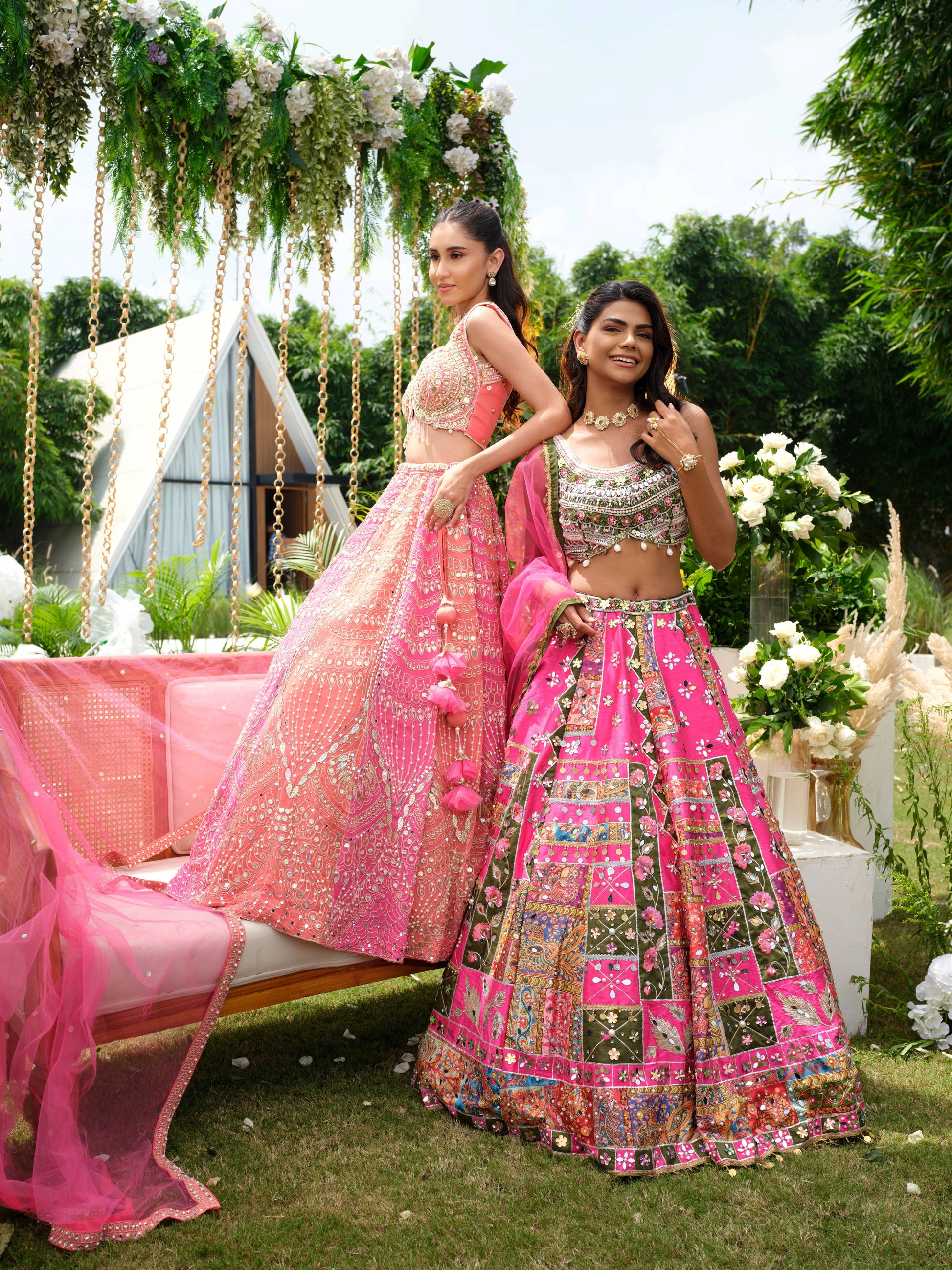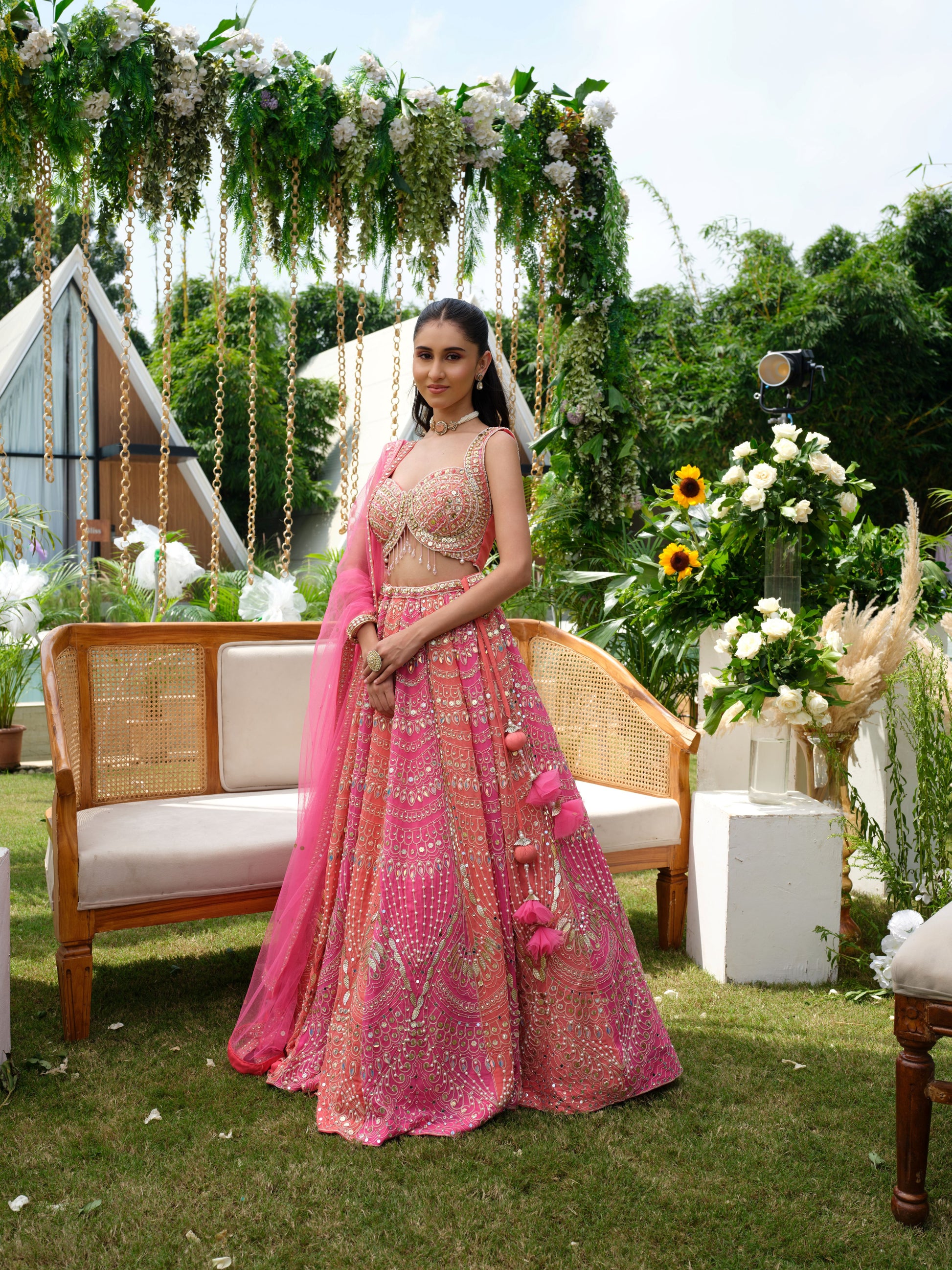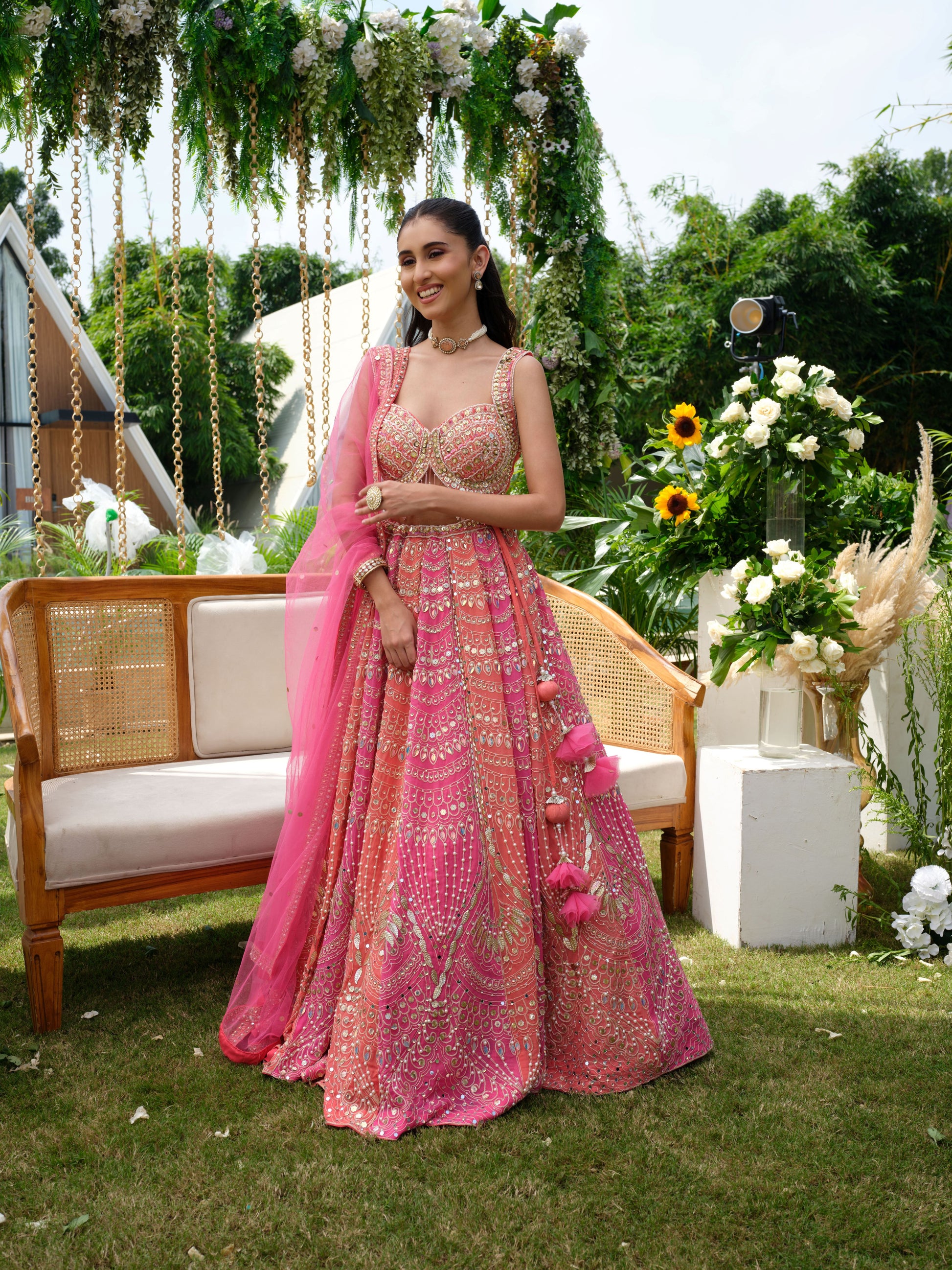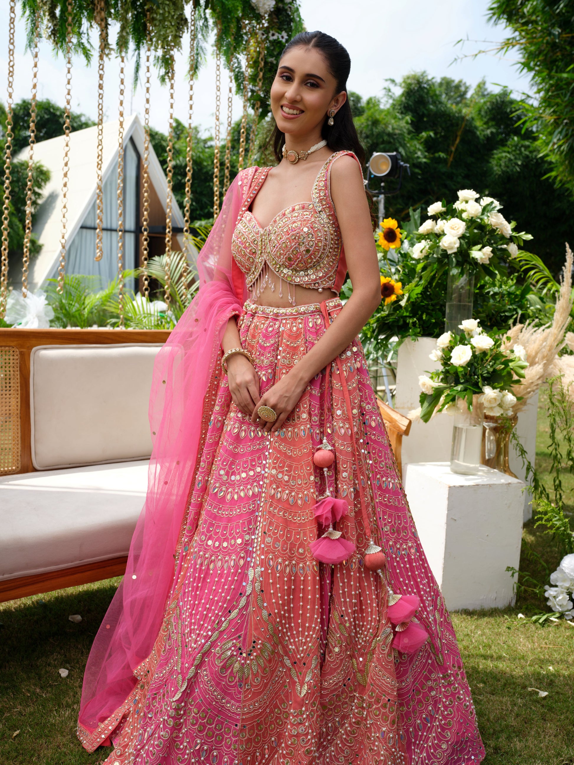 A dreamy blush pink lehenga drenched in intricate mirror work, sequin embroidery, and delicate thread detailing. The sleeveless blouse features a modern cut with shimmering embellishments, perfectly complemented by a flowy skirt that glitters with every move. Paired with a sheer pink dupatta adorned with playful tassels, this ensemble is feminine, festive, and full of charm.