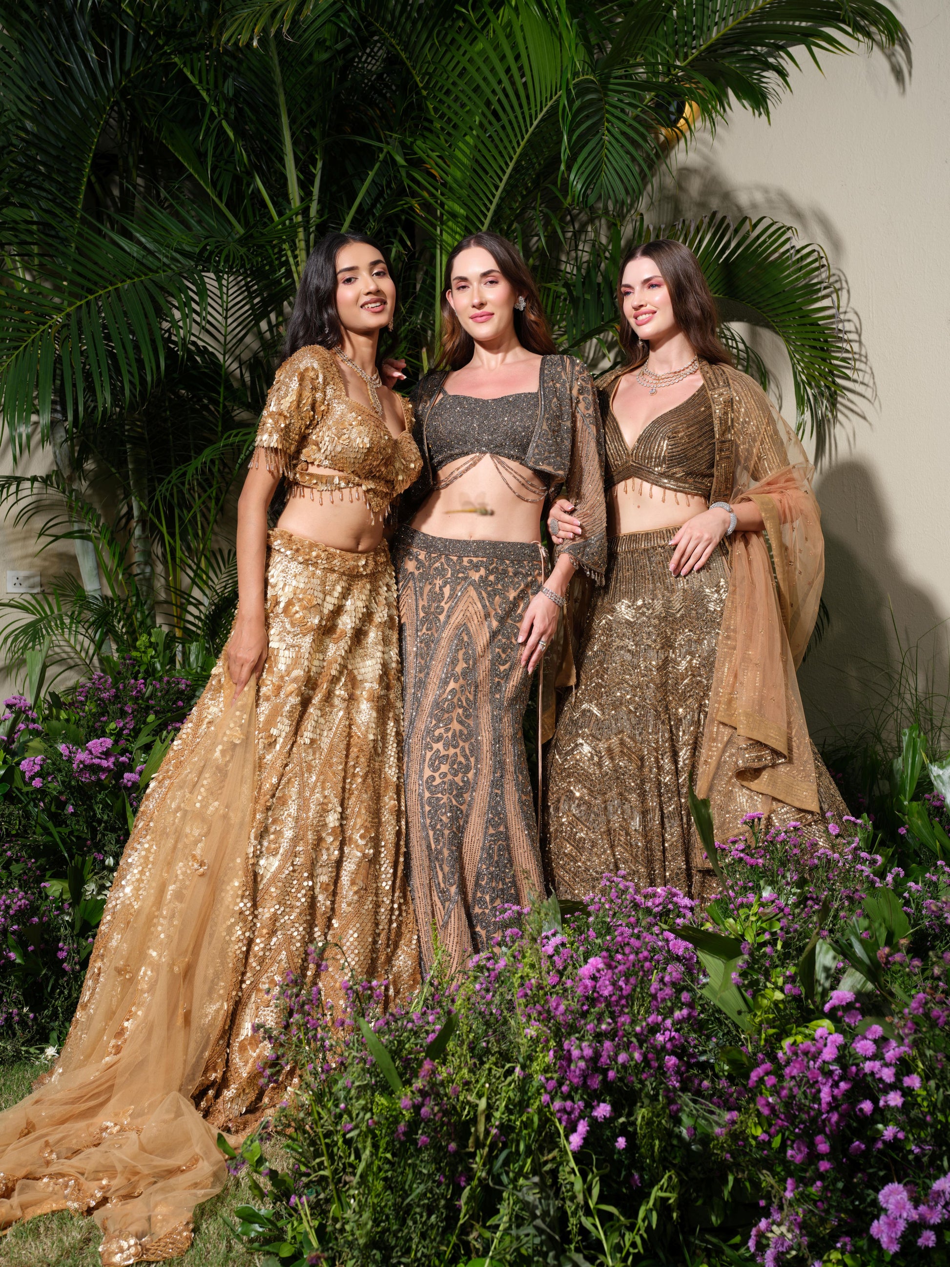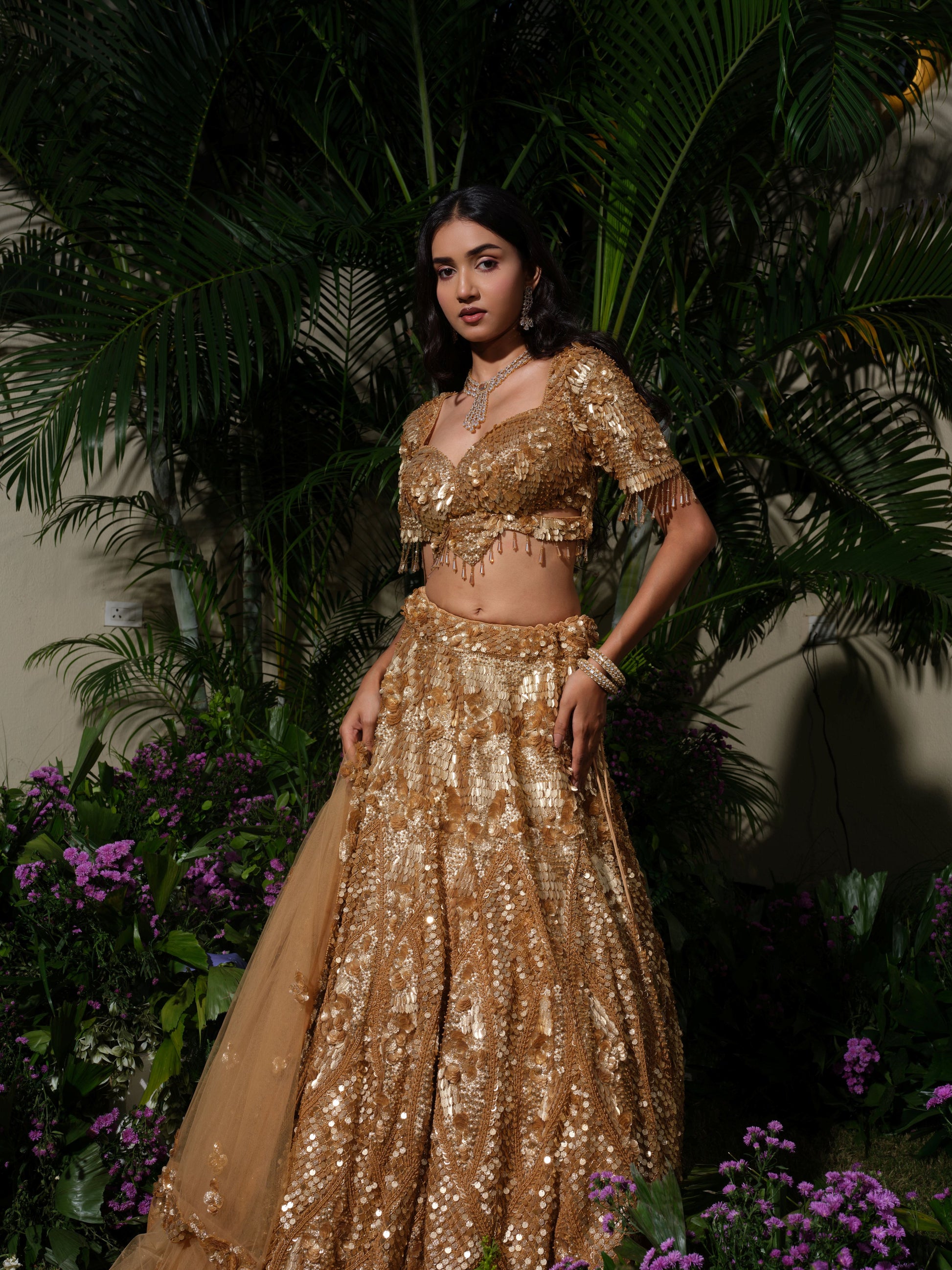 Step into the spotlight with this dazzling gold sequin lehenga set. The intricately embellished blouse with delicate tassel detailing pairs beautifully with the voluminous sequin skirt and a sheer net dupatta, making it a showstopper ensemble. Designed to shimmer under the lights, this outfit is perfect for wedding receptions, sangeet nights, and glamorous soirées.