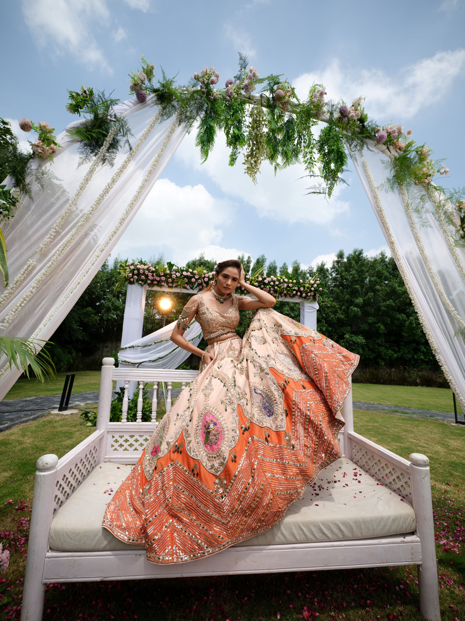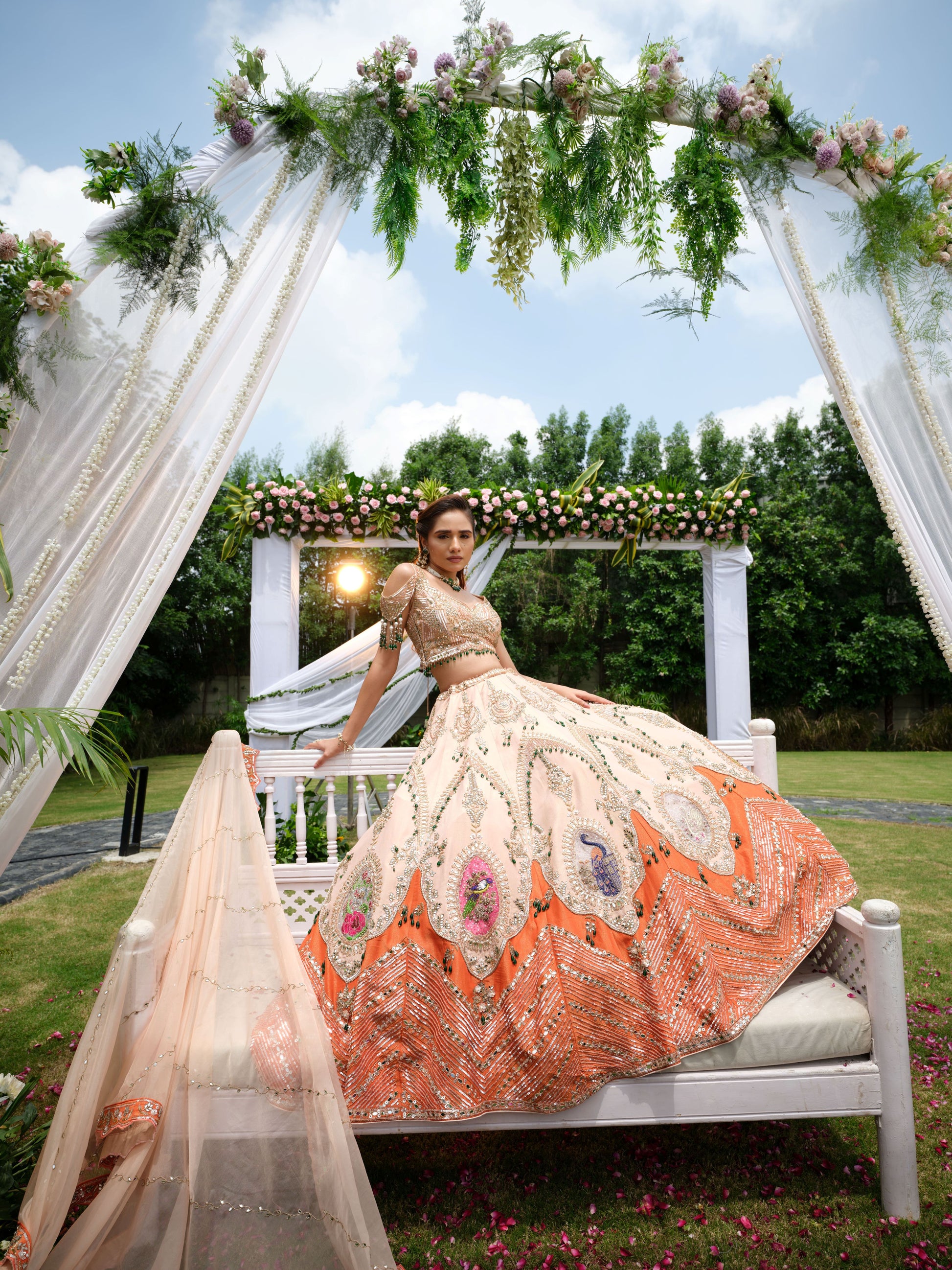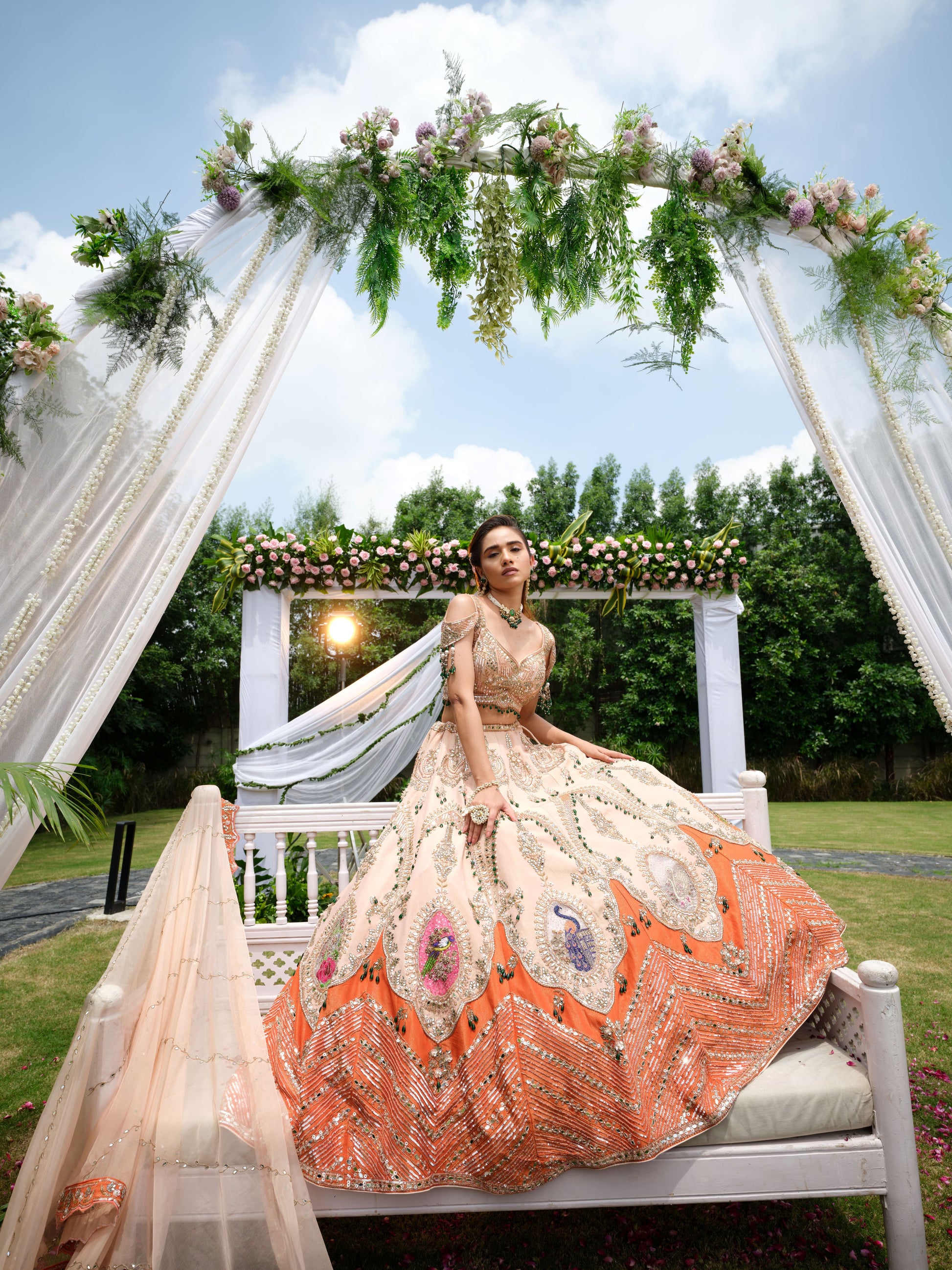 A statement peach coral lehenga intricately detailed with ivory threadwork, sequins, and floral embroidery. The blouse features delicate embellishments and a timeless neckline, while the voluminous skirt showcases bold floral motifs and grand patterns, making it regal and graceful. Styled with a sheer dupatta, this look is perfect for brides and wedding showstoppers.