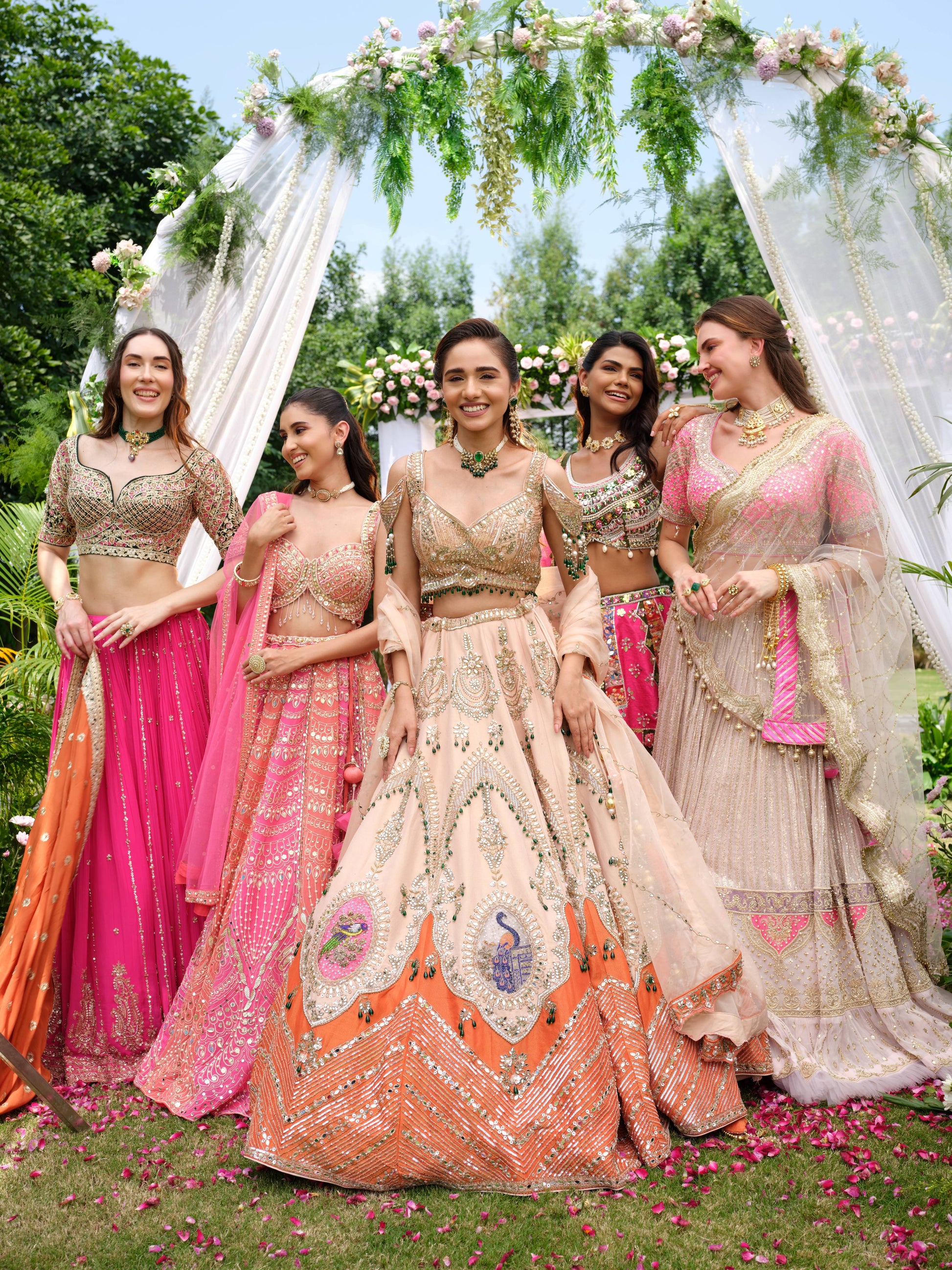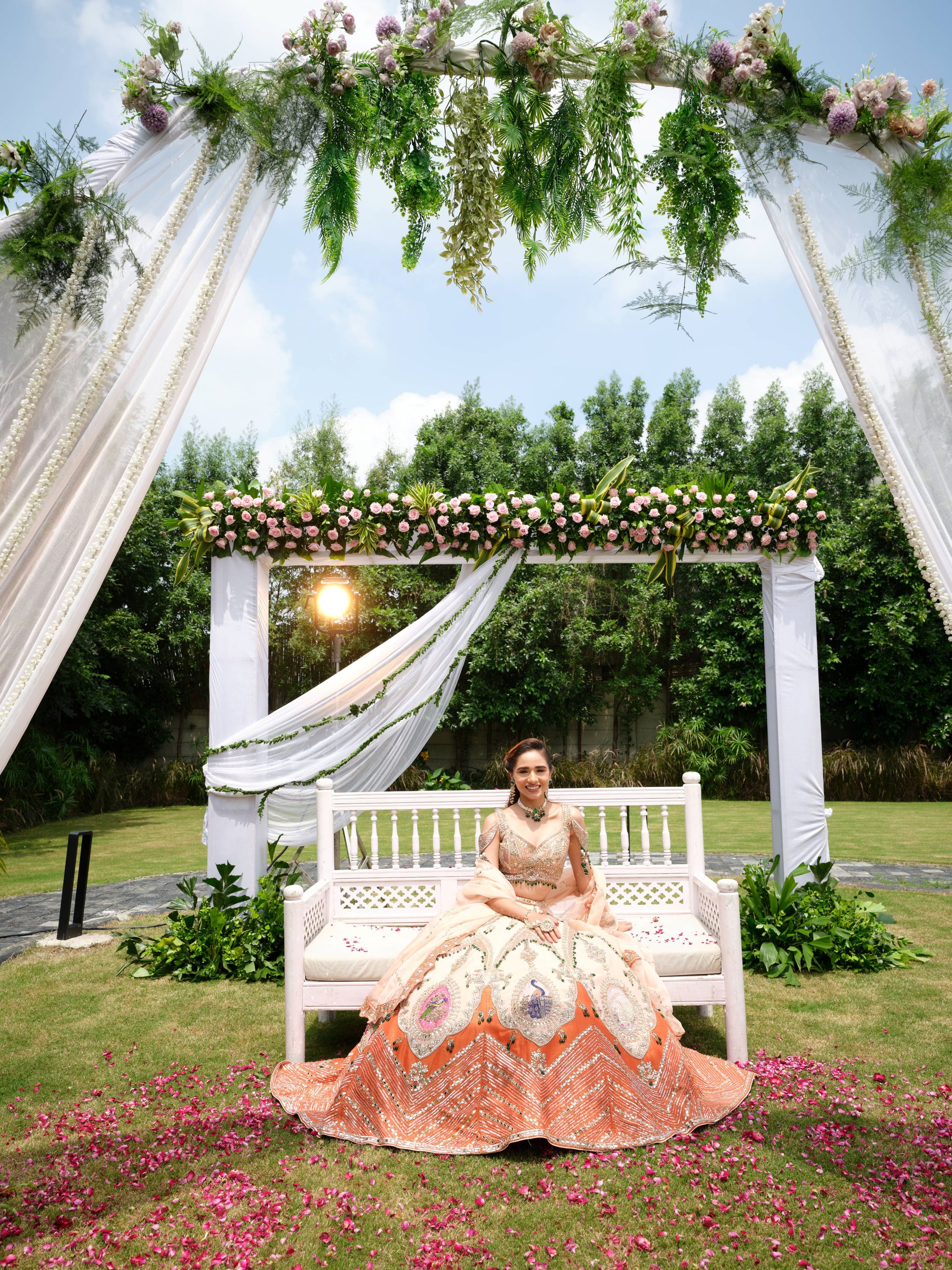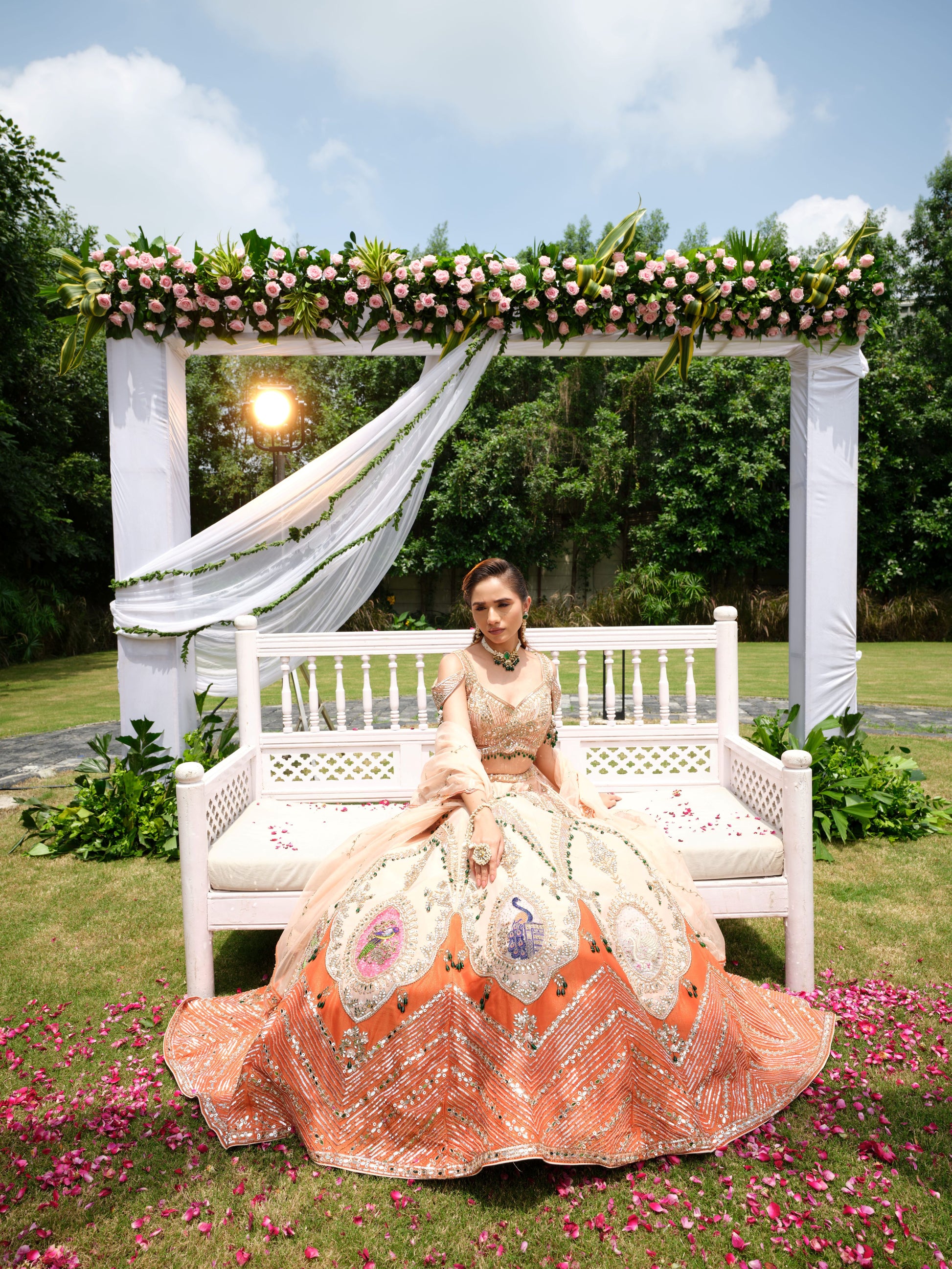 A statement peach coral lehenga intricately detailed with ivory threadwork, sequins, and floral embroidery. The blouse features delicate embellishments and a timeless neckline, while the voluminous skirt showcases bold floral motifs and grand patterns, making it regal and graceful. Styled with a sheer dupatta, this look is perfect for brides and wedding showstoppers.