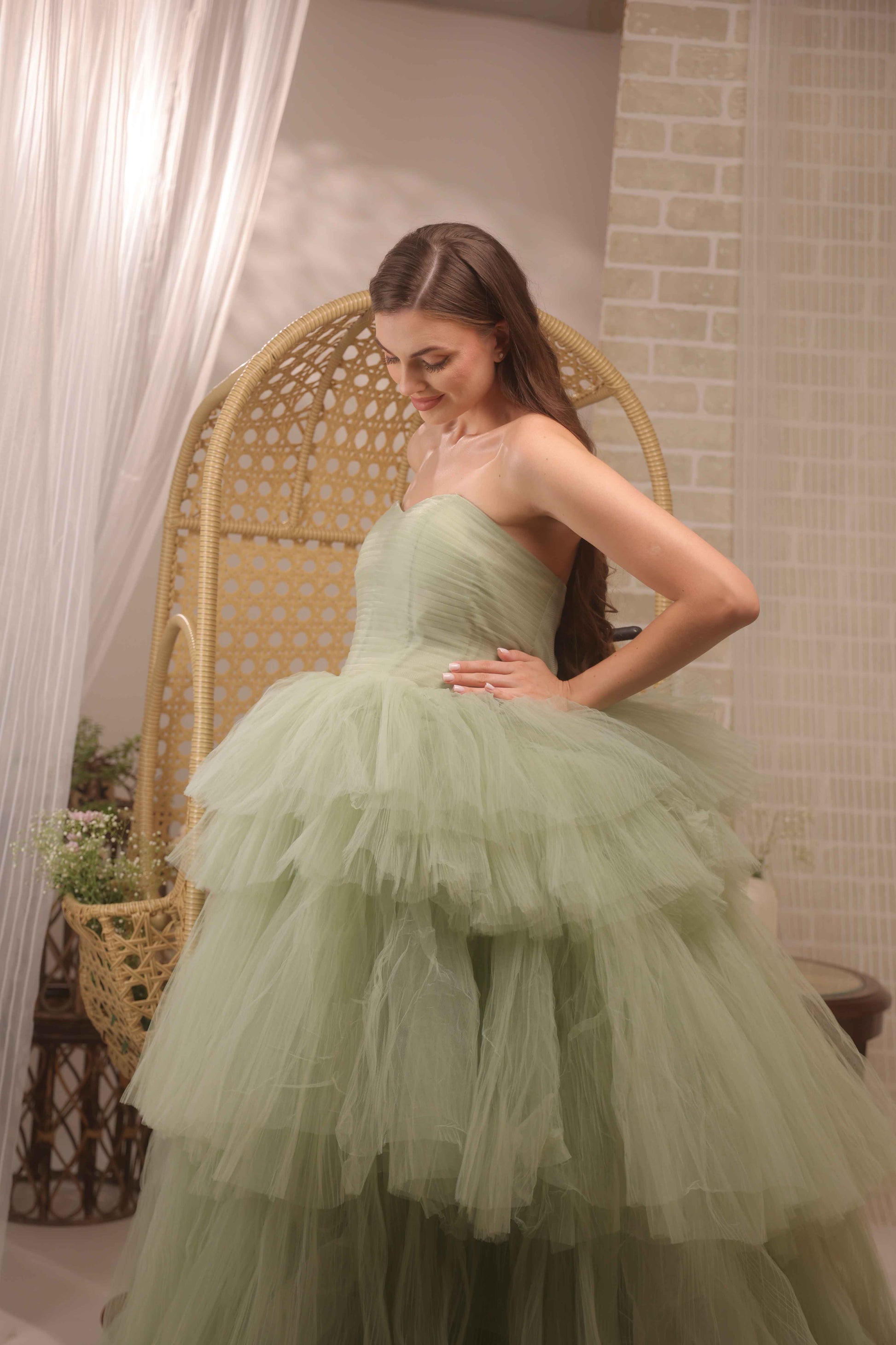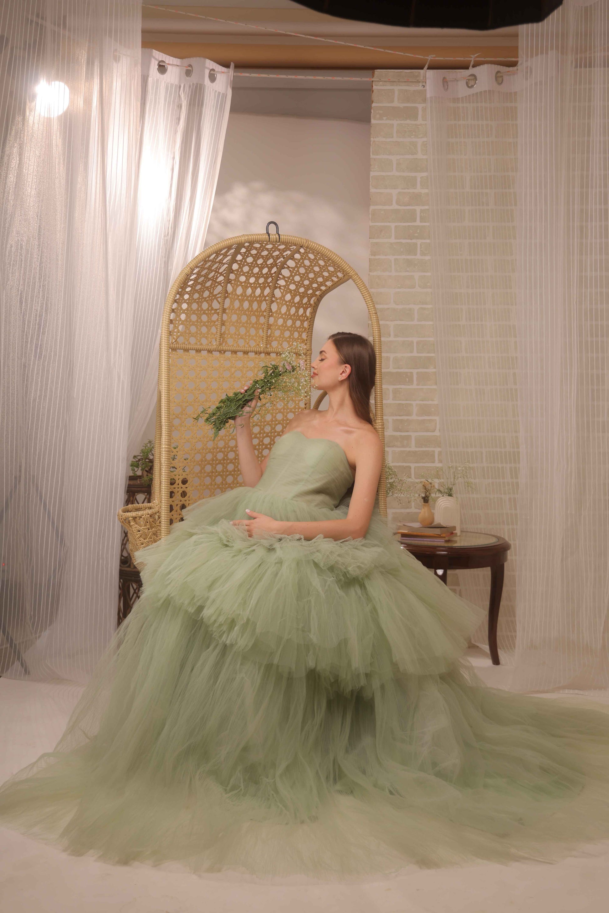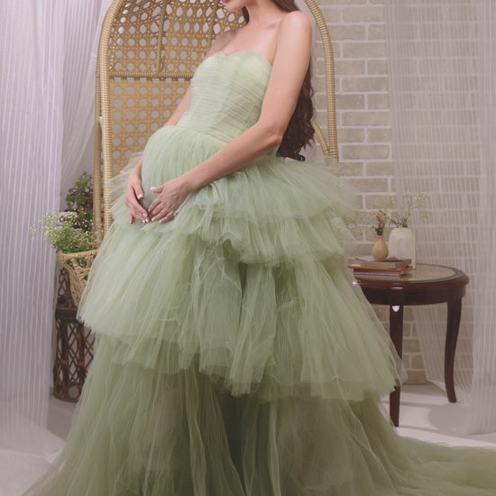 Refreshing and ethereal, this strapless maternity gown is crafted in soft layered tulle for a dreamy and romantic feel. The delicate bodice paired with a voluminous ruffled skirt enhances your maternity glow while ensuring comfort. Perfect for creating whimsical and elegant photoshoot memories, this gown exudes effortless charm and grace.