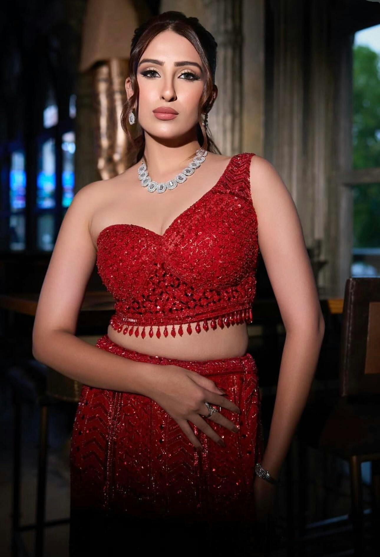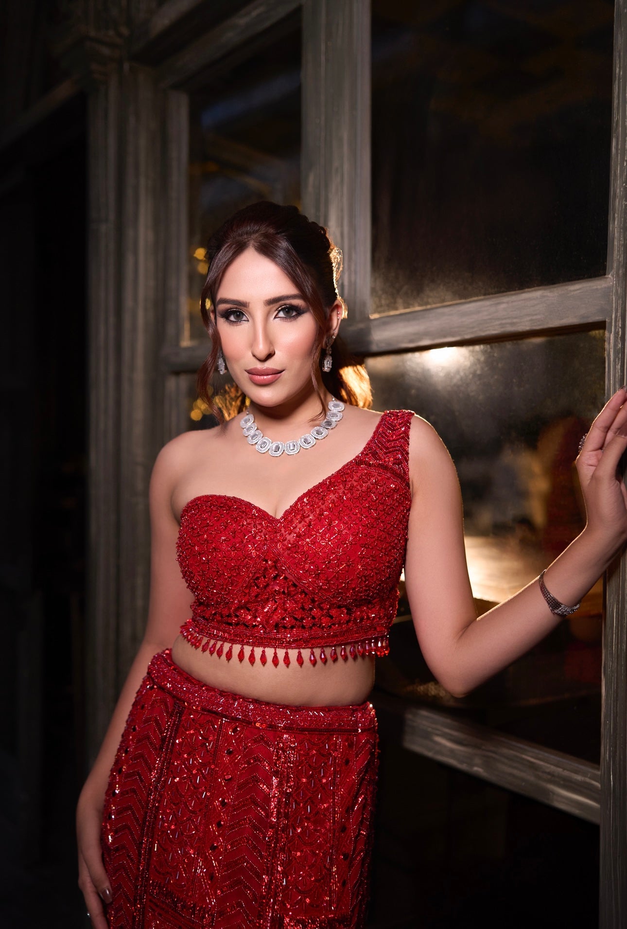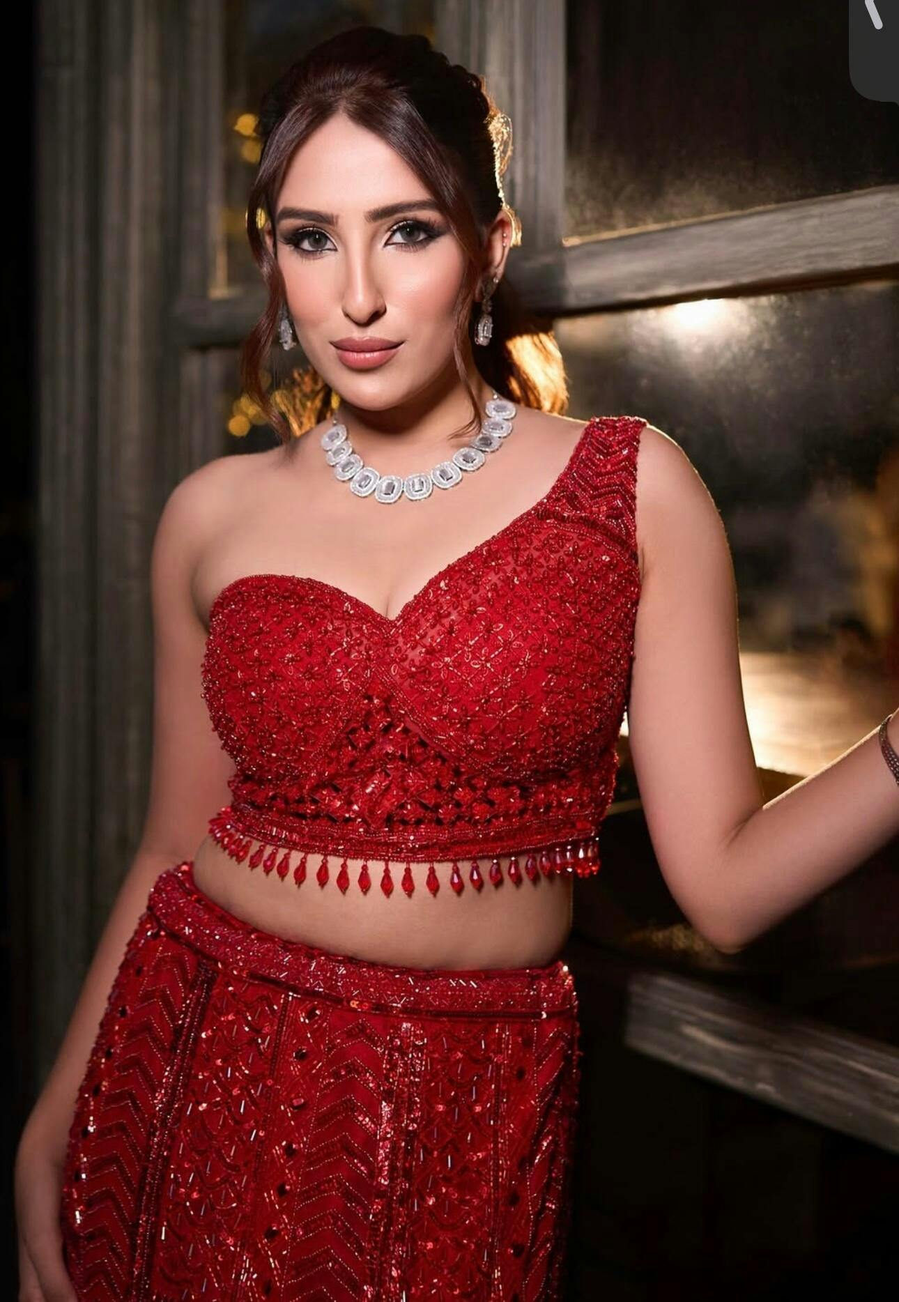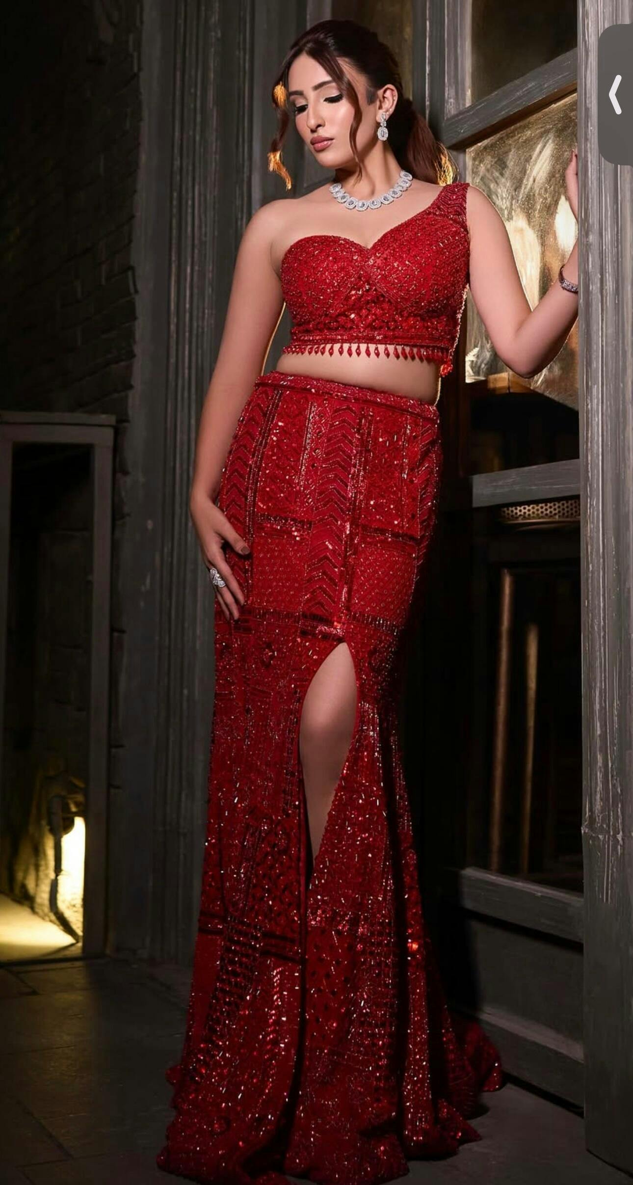 A stunning red heavy lehenga with intricate handwork, featuring a slit in the skirt and paired with a cape veil, creates a bold, stylish, and glamorous look for any special occasion.