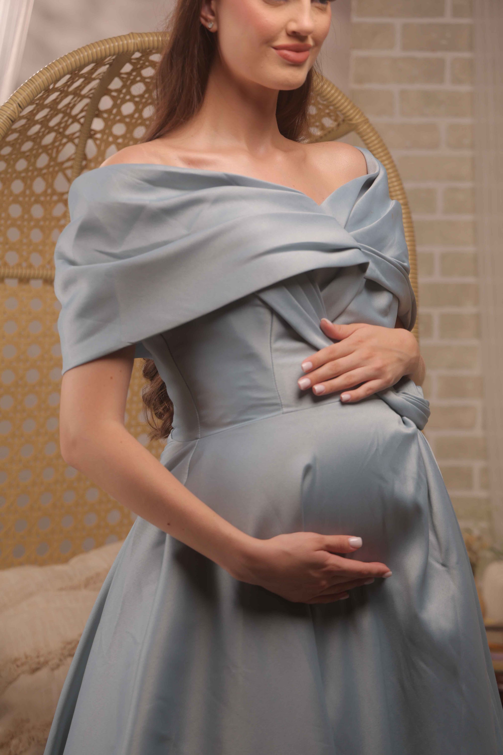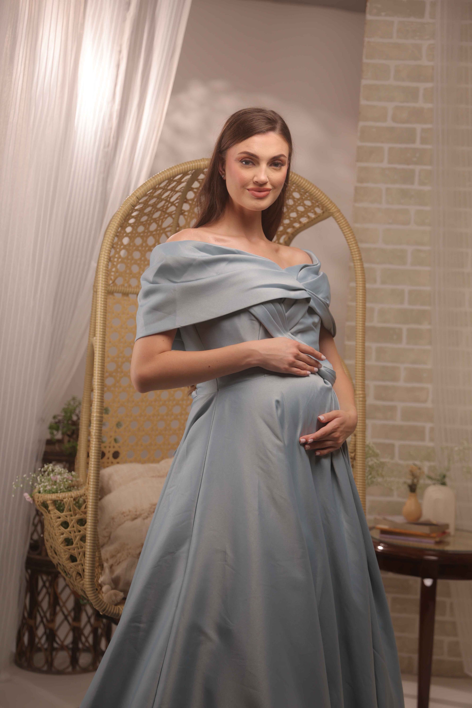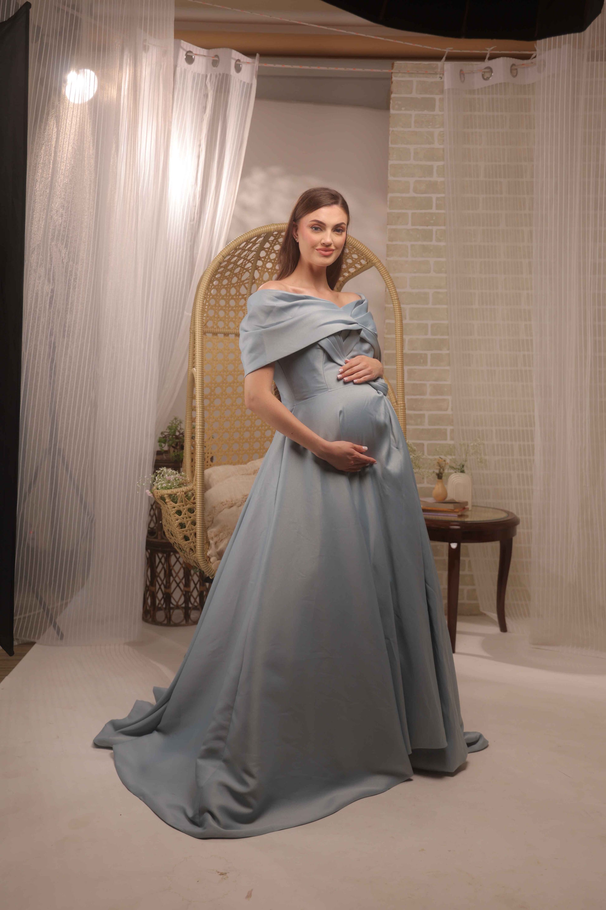 This elegant off-shoulder maternity gown is crafted in flowing fabric, designed to drape beautifully and enhance your natural glow. With its structured bodice and graceful flare, it provides comfort without compromising on style. Perfect for capturing timeless maternity moments, the gown combines sophistication with ease, making it an ideal choice for photoshoots.