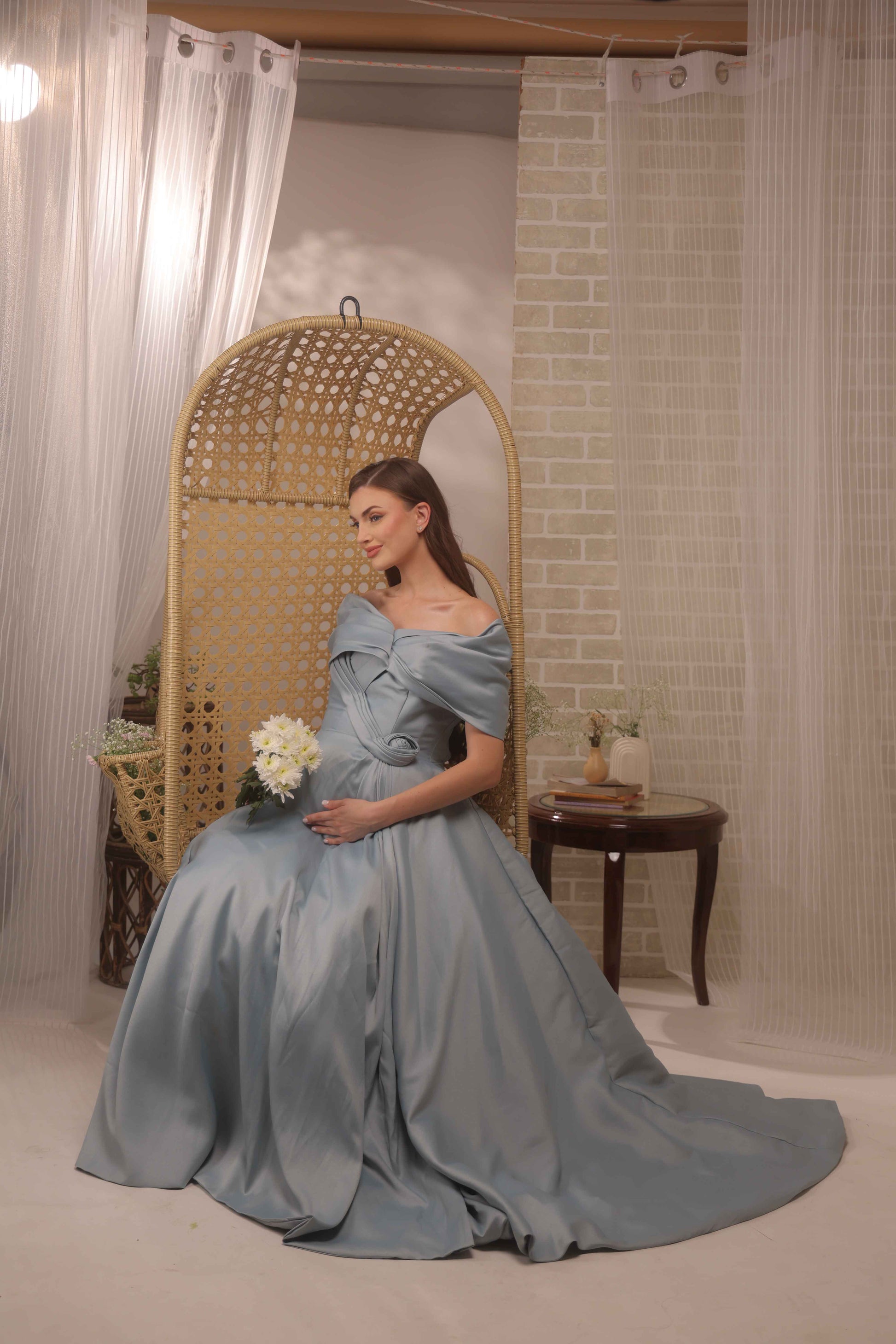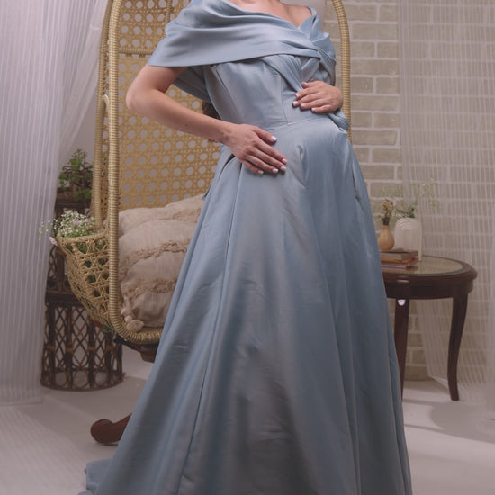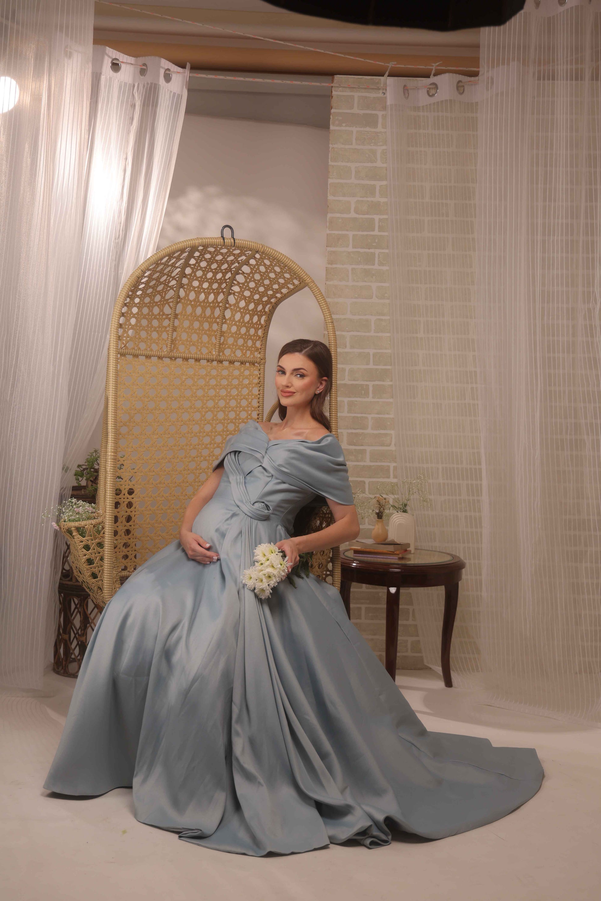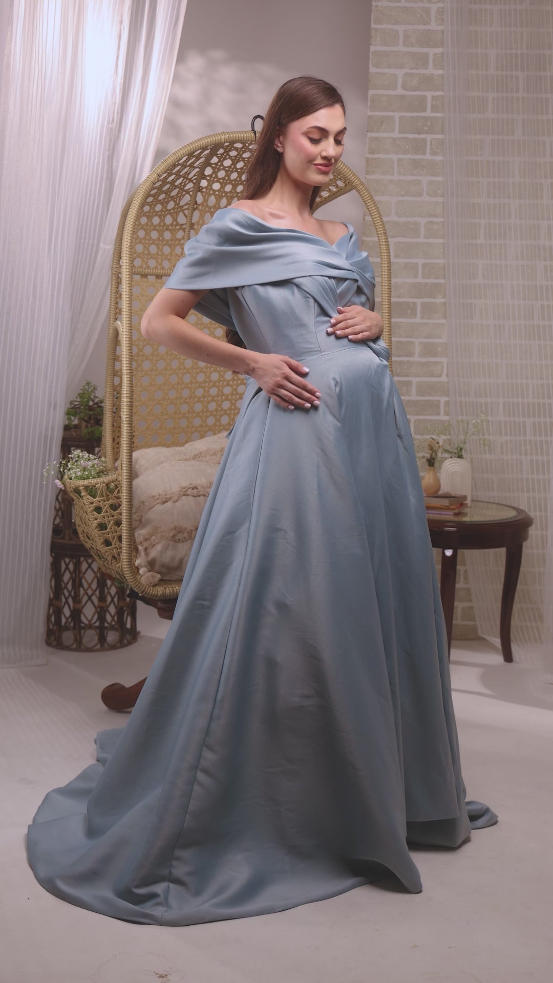 This elegant off-shoulder maternity gown is crafted in flowing fabric, designed to drape beautifully and enhance your natural glow. With its structured bodice and graceful flare, it provides comfort without compromising on style. Perfect for capturing timeless maternity moments, the gown combines sophistication with ease, making it an ideal choice for photoshoots.