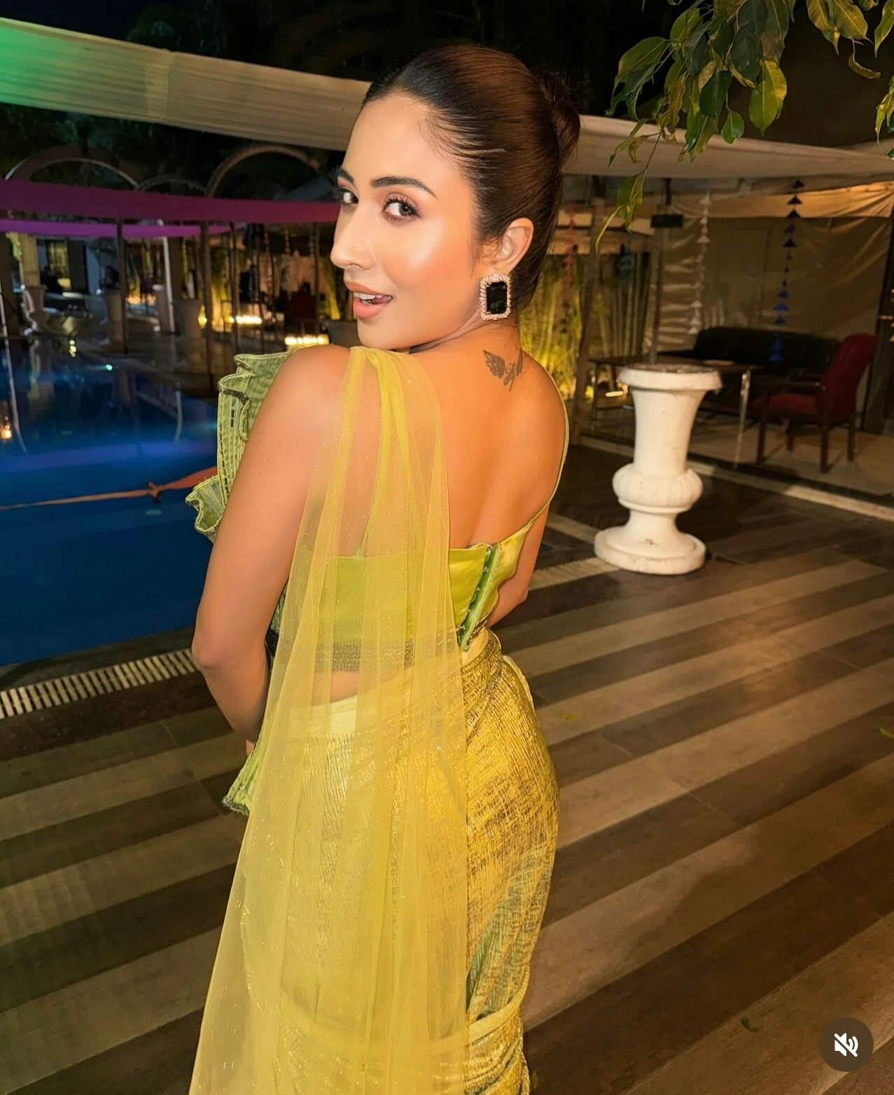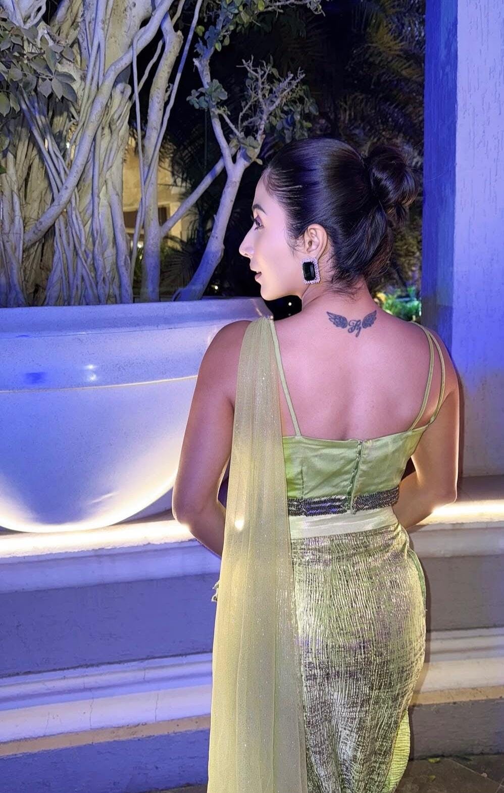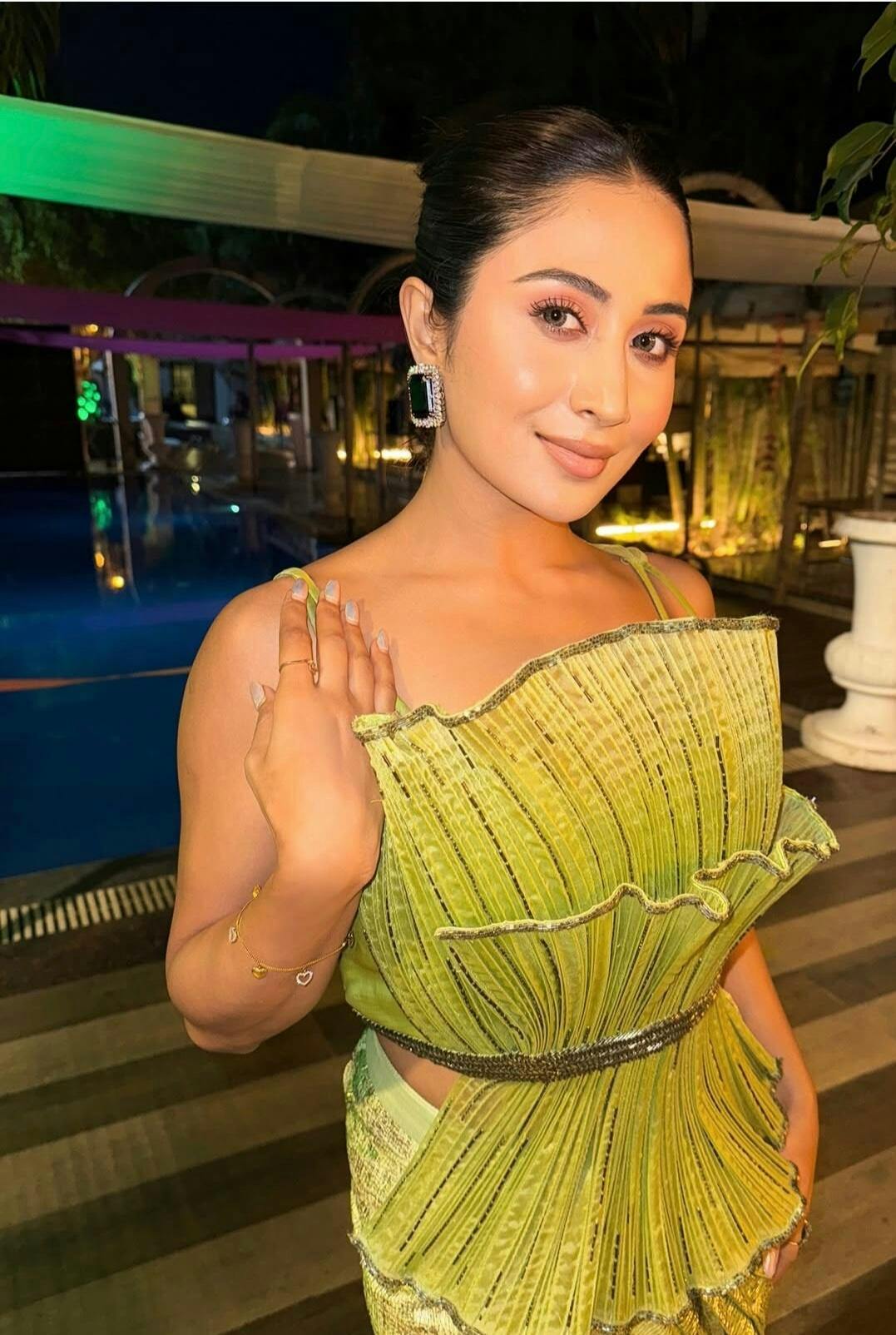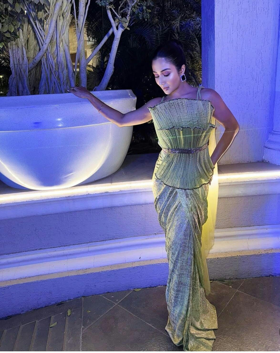 Green shimmer lycra saree gown with all over crinkled pattern, pleated draped details, attached pallu, layered ruffle panelled bodice, tonal nalki & cut dana embroidery.