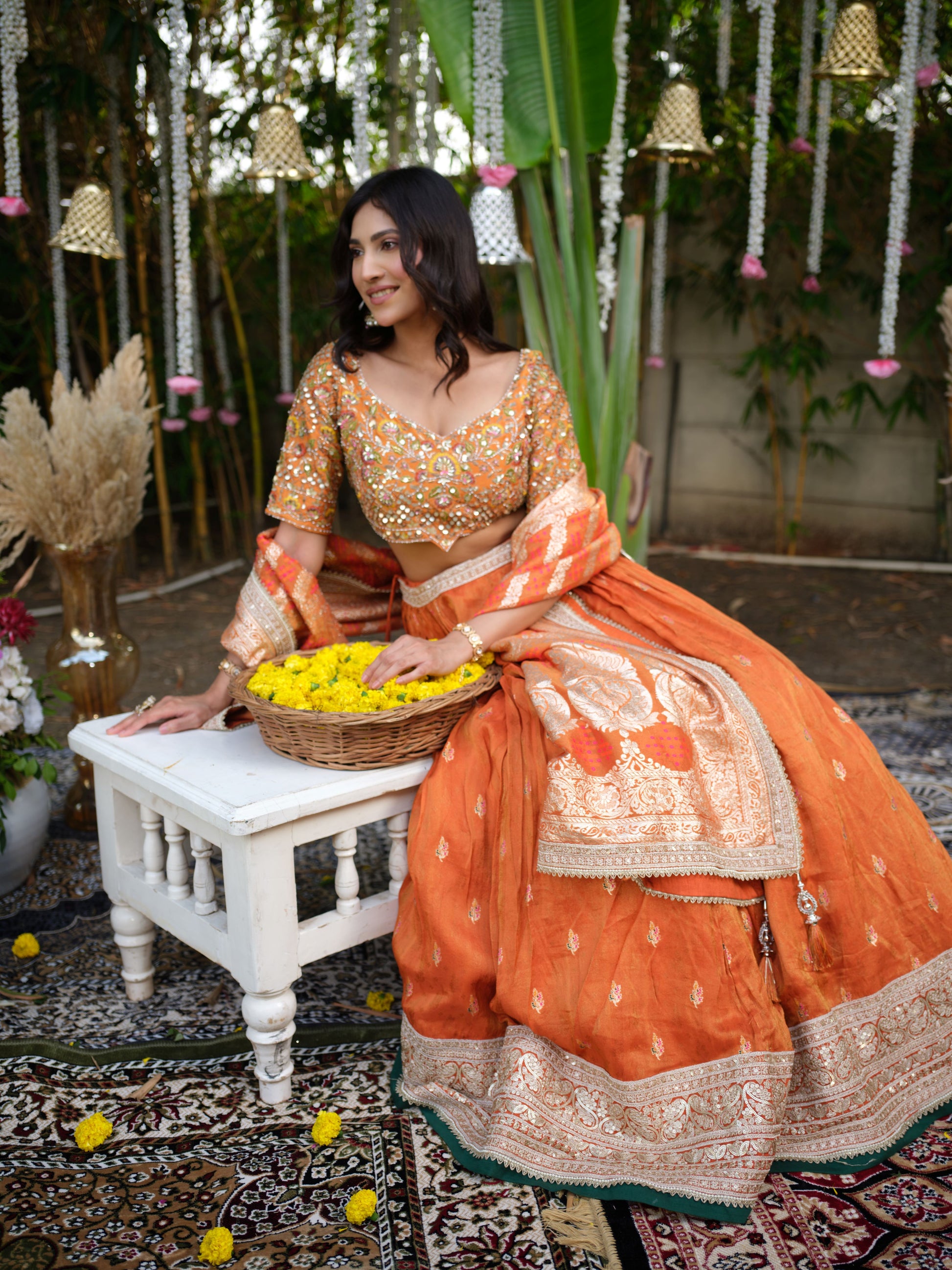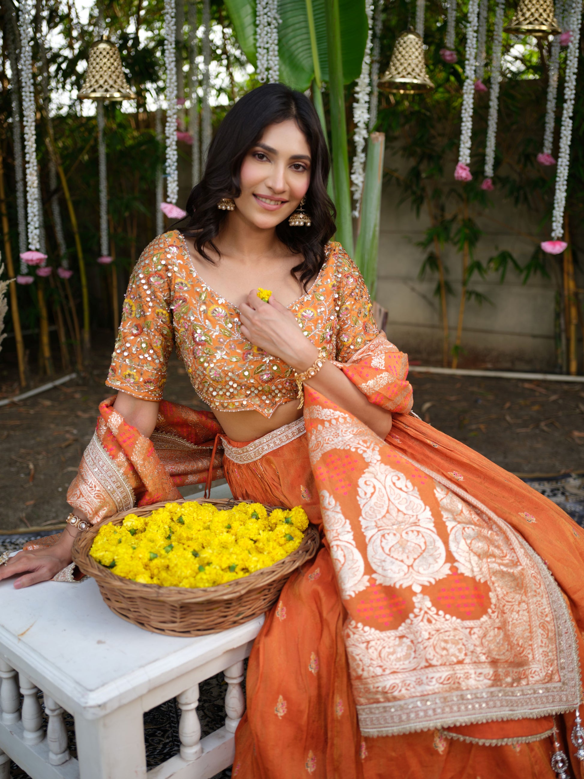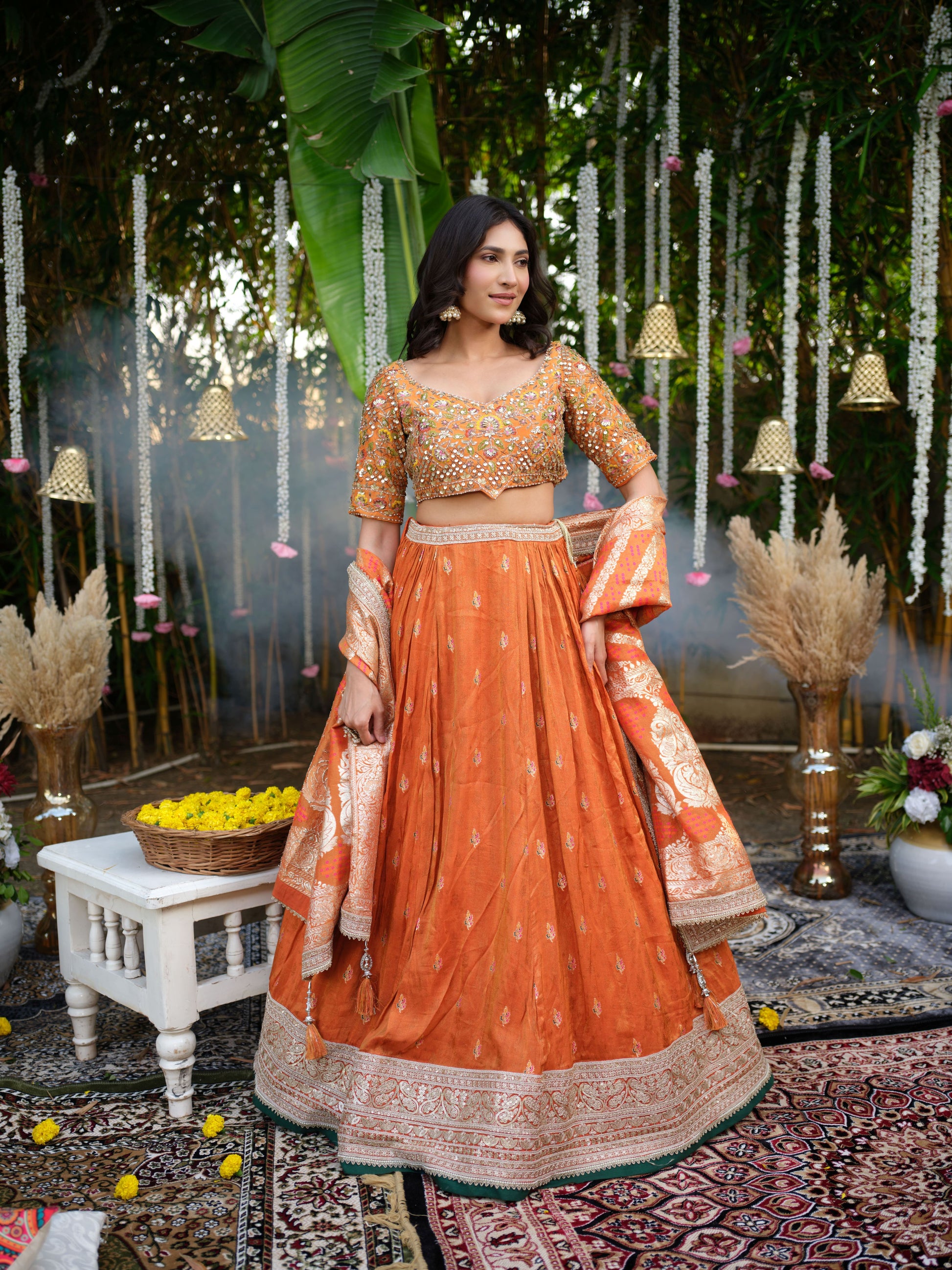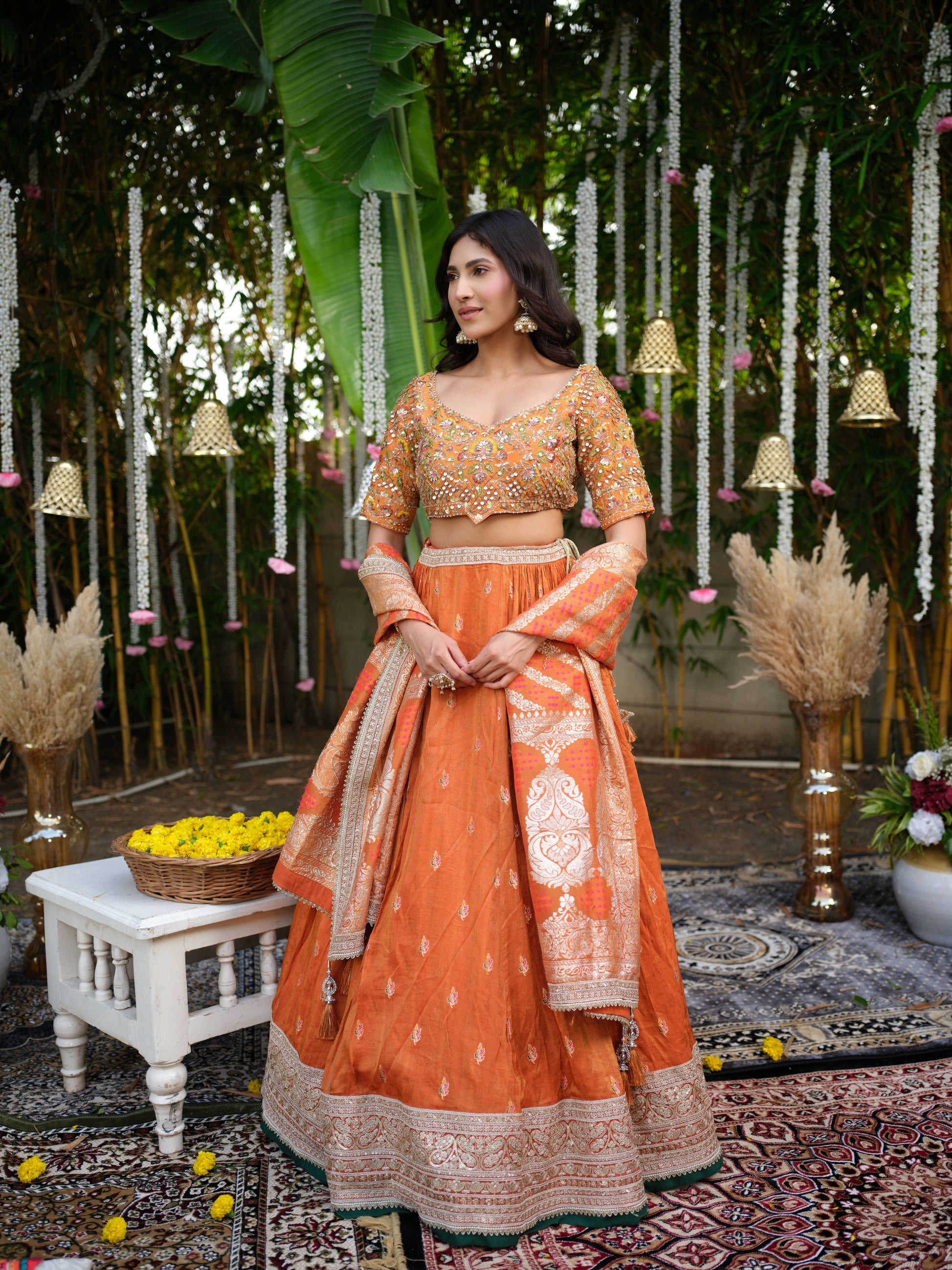 Radiate festive elegance in this rich rust-orange lehenga set. The intricately embroidered blouse, adorned with mirror and sequin work, pairs beautifully with the flowing silk skirt featuring traditional motifs. A complementing dupatta with zari detailing adds a regal finish, making it a perfect choice for mehendi, haldi, or daytime wedding celebrations.