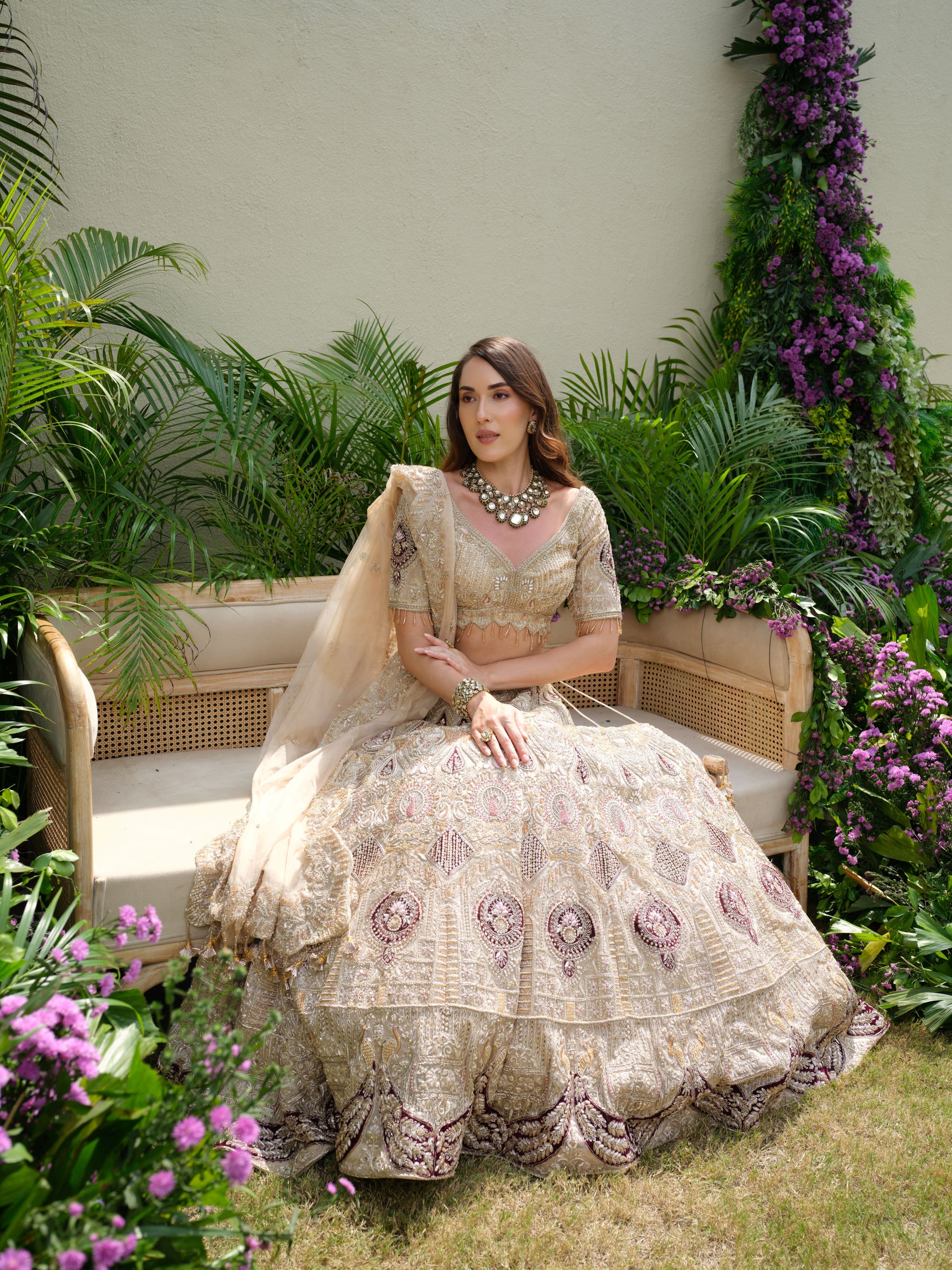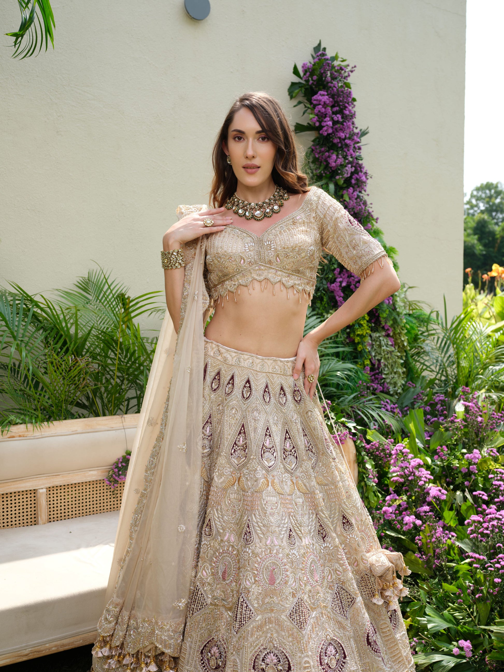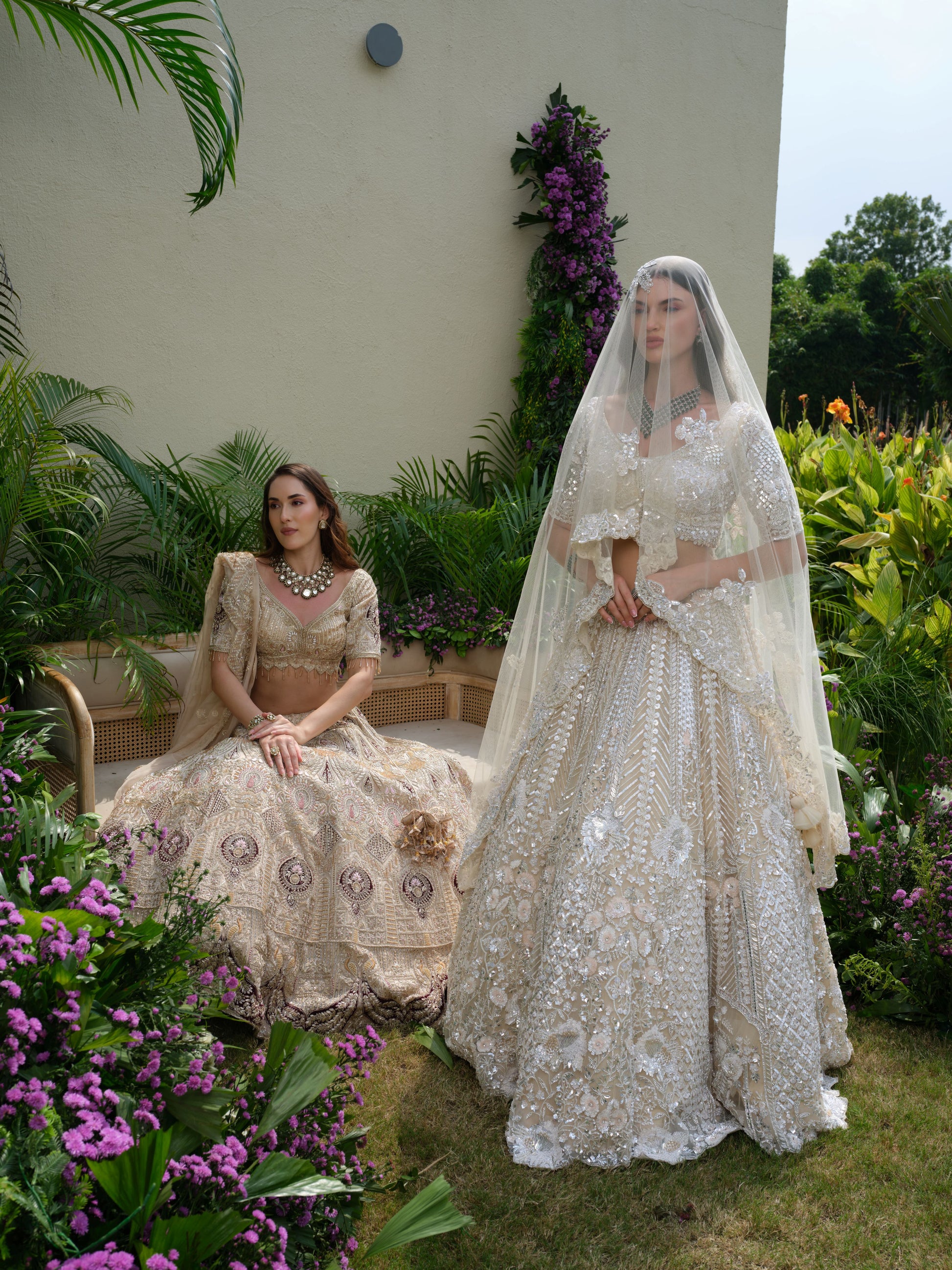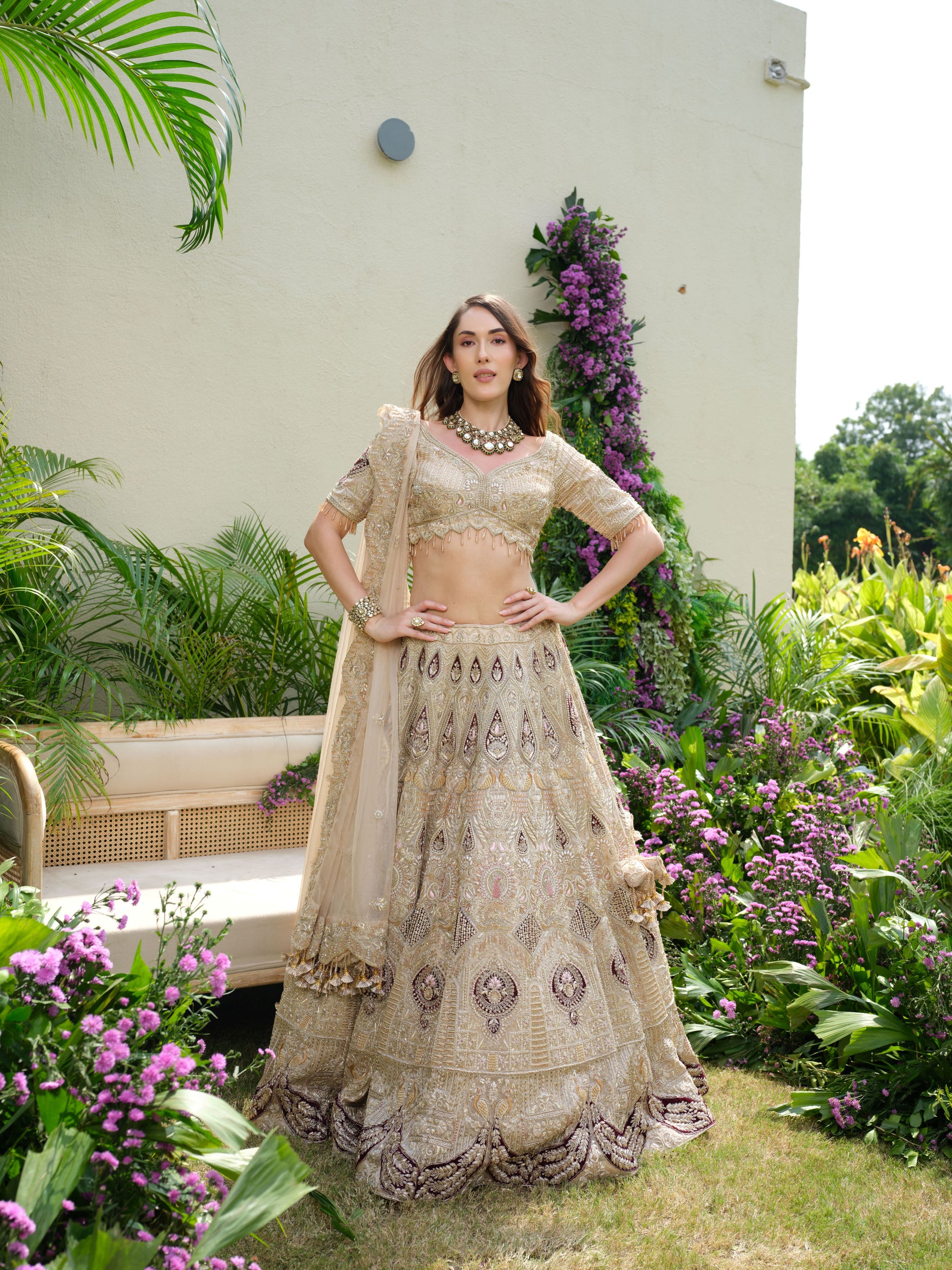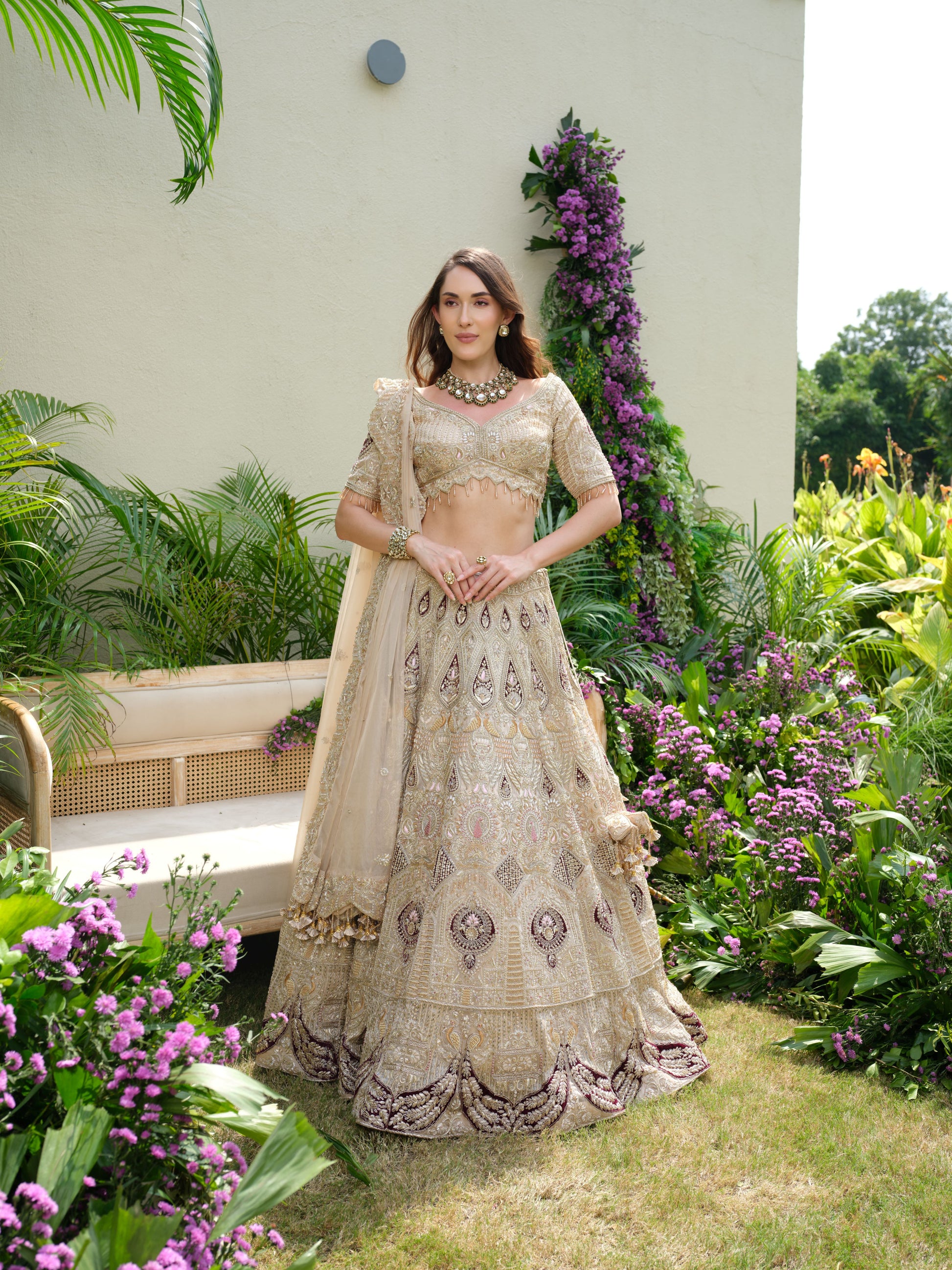 A true statement of grandeur, this antique gold lehenga is adorned with intricate resham, zari, and sequin embroidery in heritage-inspired motifs. The structured blouse with scalloped detailing pairs perfectly with the richly embellished skirt, while the sheer dupatta completes the majestic silhouette. A perfect choice for brides who seek timeless opulence on their big day.