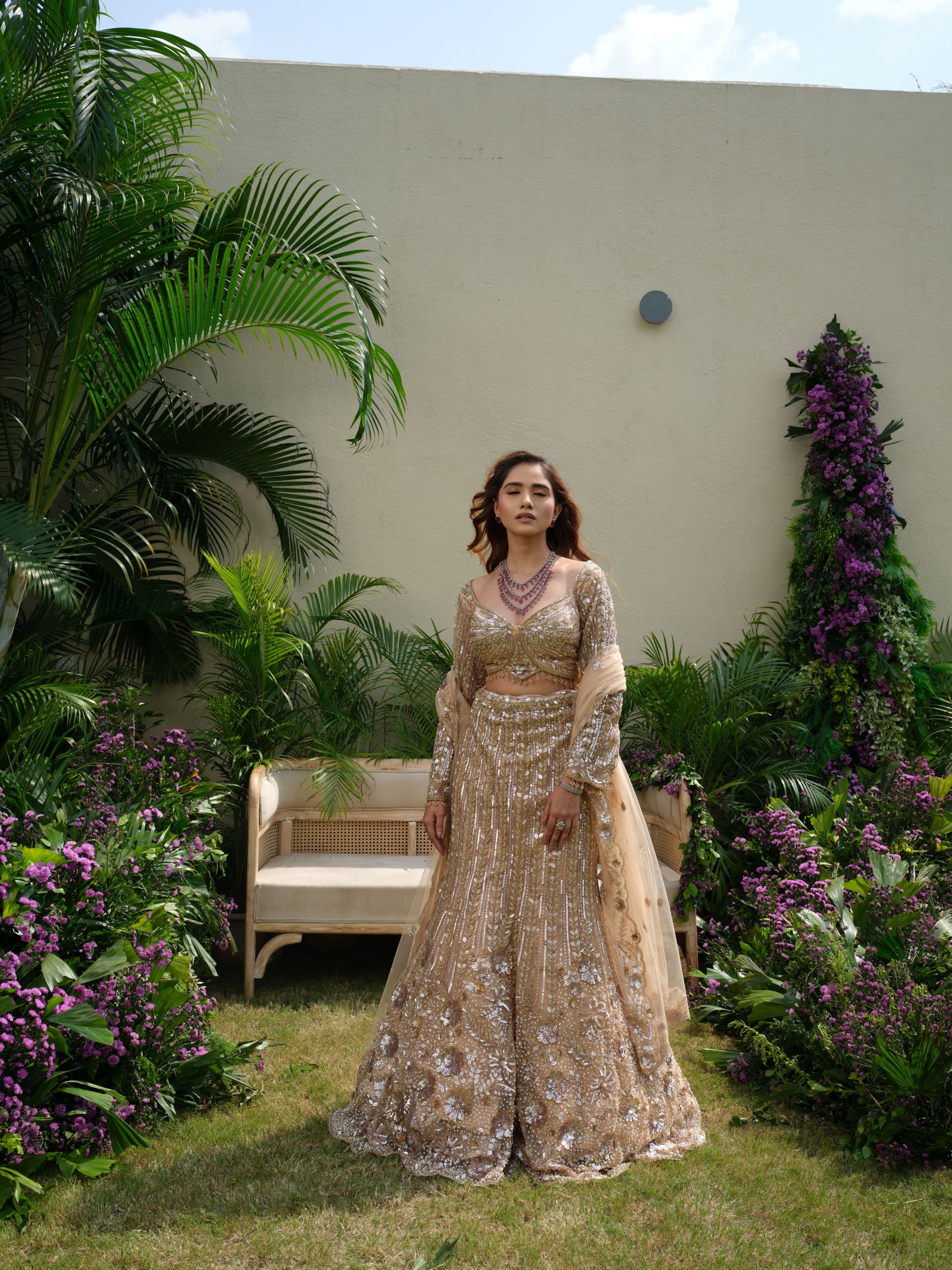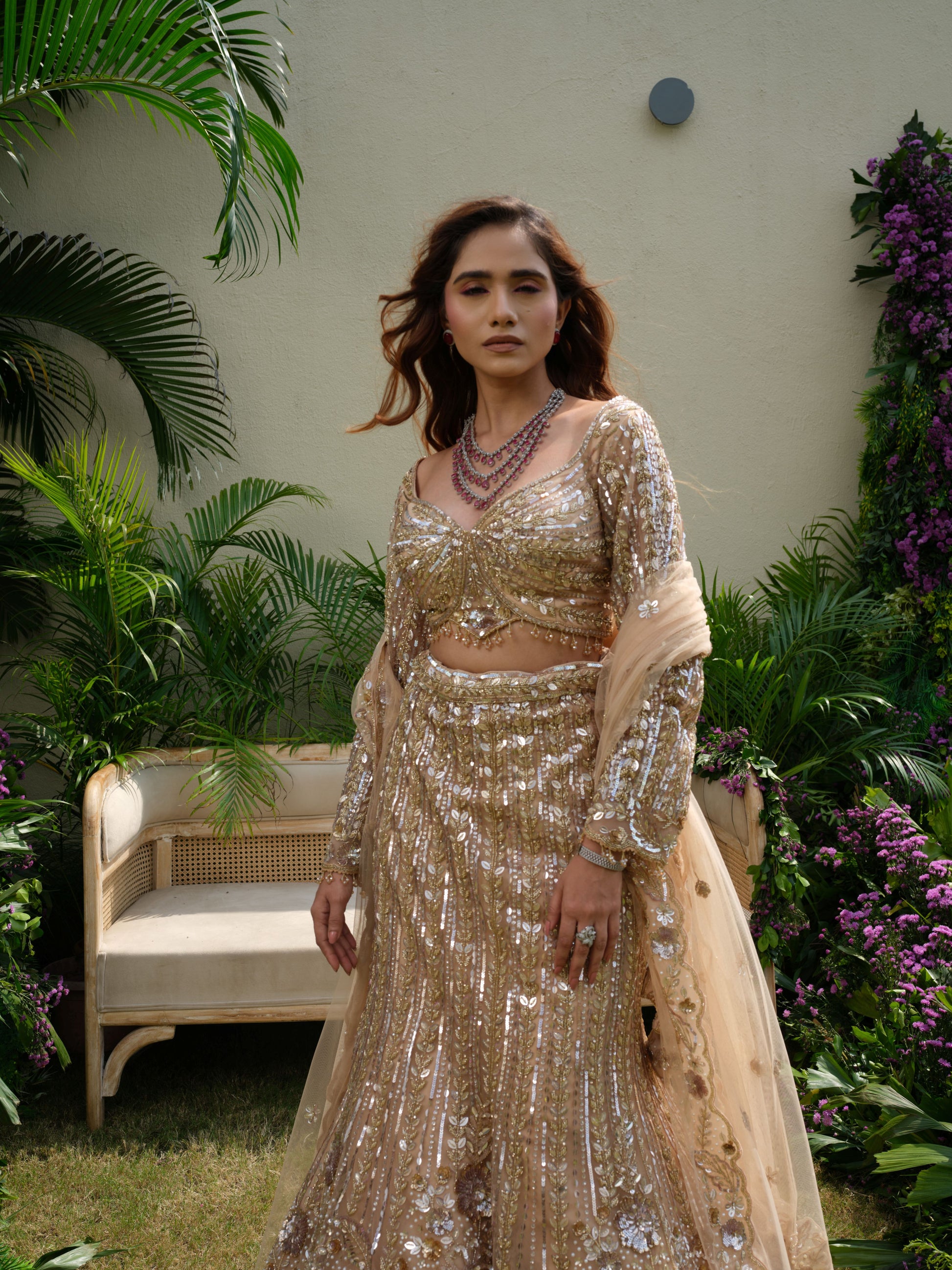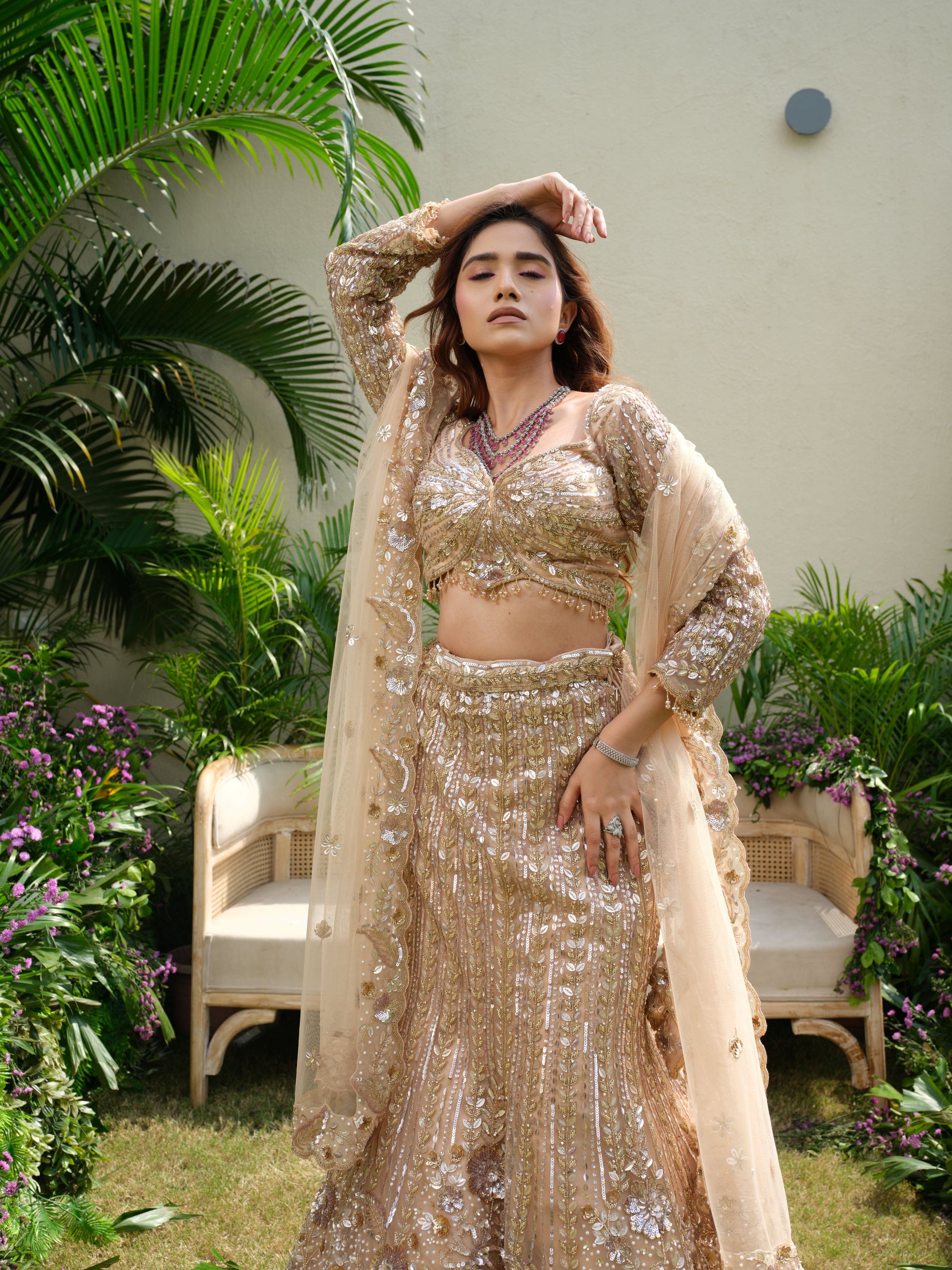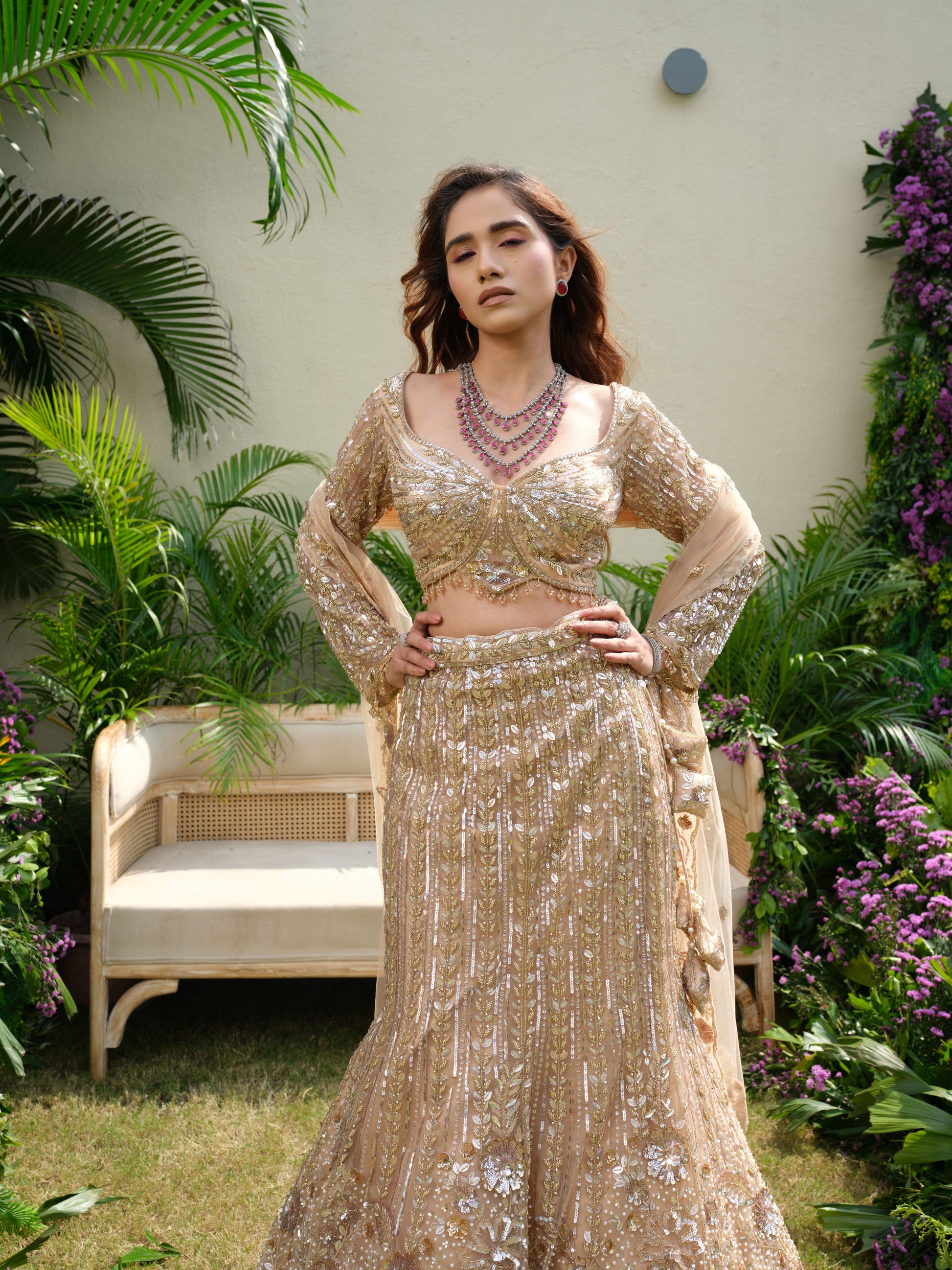 Step into timeless grandeur with this champagne-gold lehenga, drenched in sequins, crystals, and intricate threadwork. The sculpted blouse with a sweetheart neckline and sheer sleeves adds contemporary elegance, while the flowing lehenga exudes regal charm. Paired with a soft net dupatta, this masterpiece is perfect for receptions, sangeet nights, or a modern bride’s grand statement.