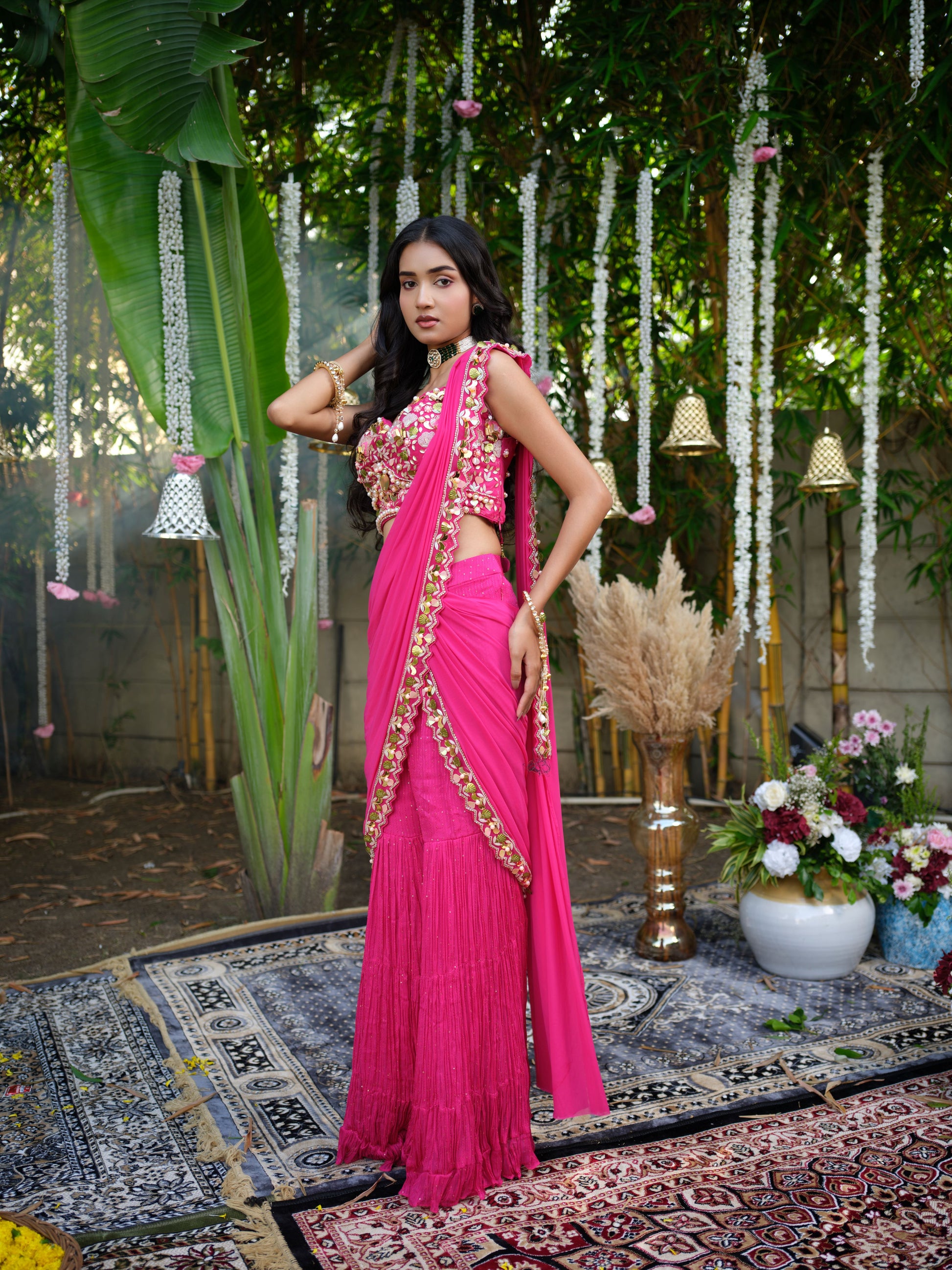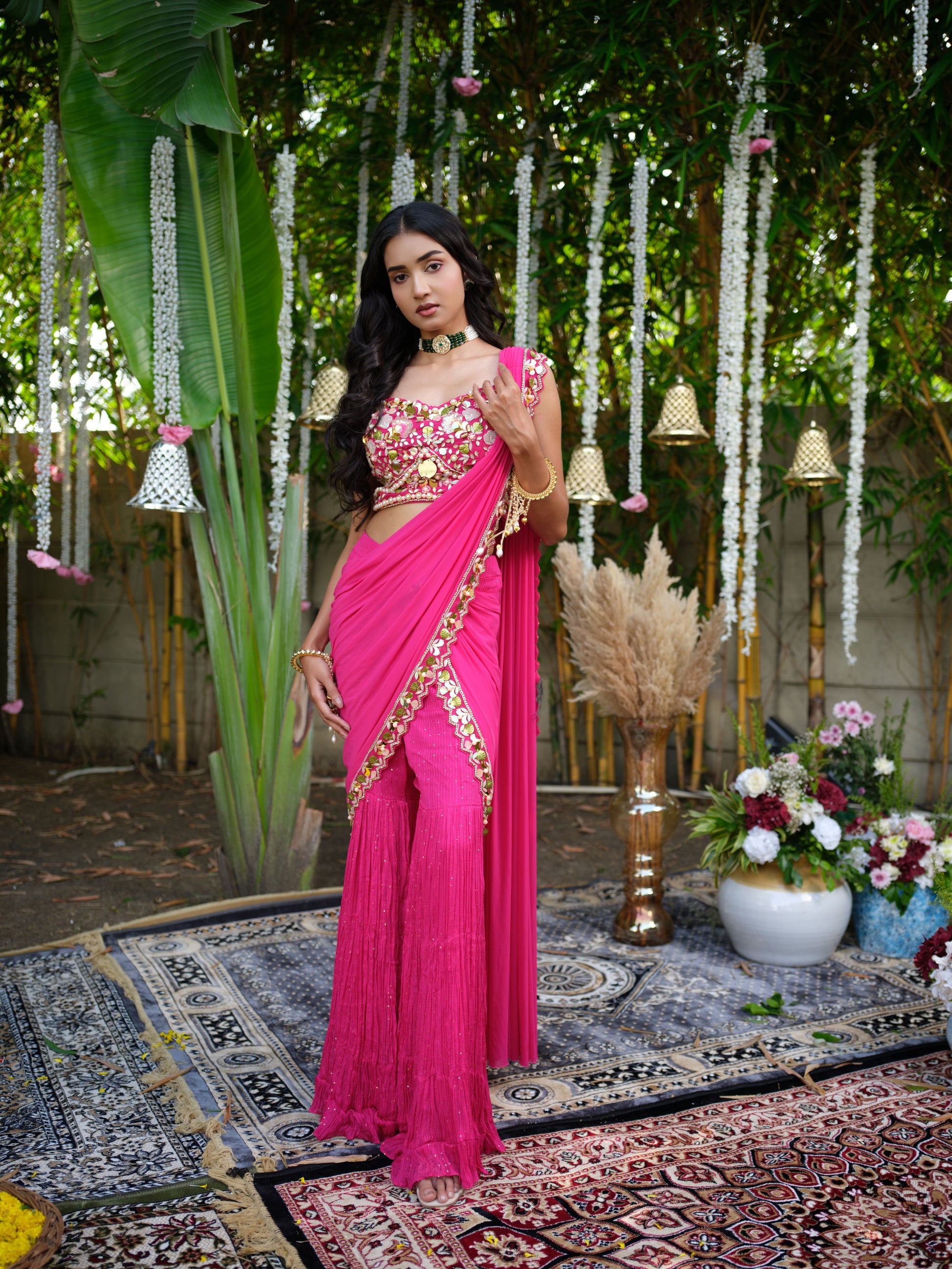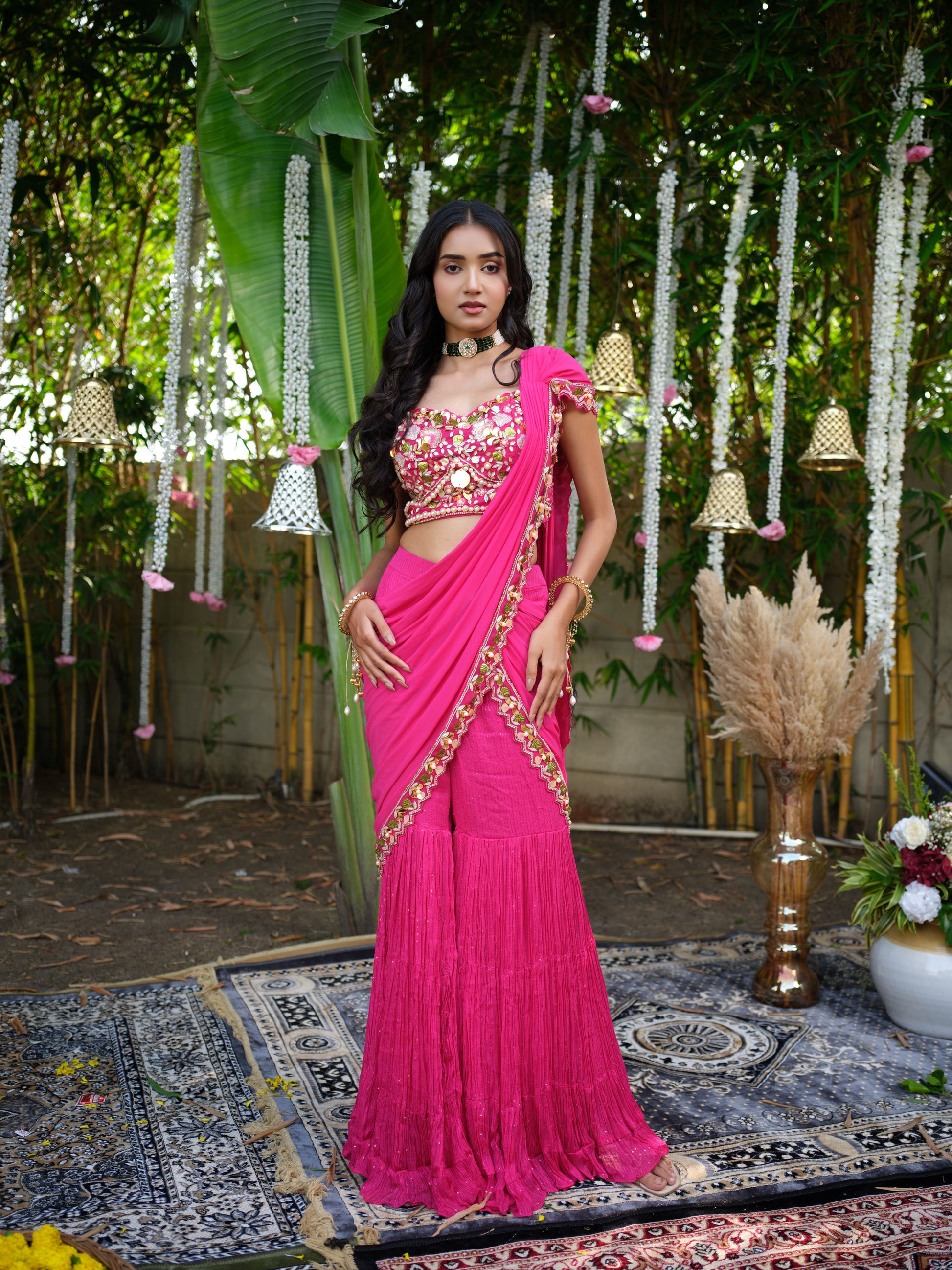 Dazzle in this bold fuchsia pre-draped saree teamed with a mirror-work embroidered blouse that sparkles with every move. The scallop-edged detailing and fluid drape blend tradition with contemporary flair, while the sharara-style bottom adds a modern twist. A perfect pick for sangeet nights, cocktails, or festive celebrations where glamour takes center stage.