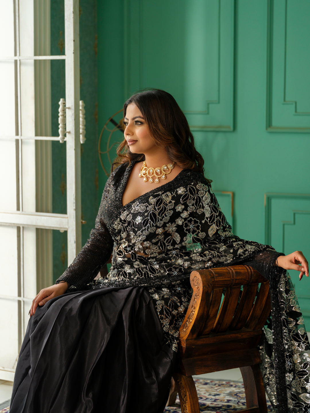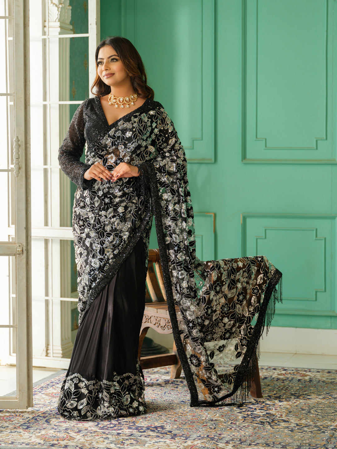 A stunning black saree enhanced with a touch of silver, combining elegance and modern flair. Perfect for making a statement at any evening event.