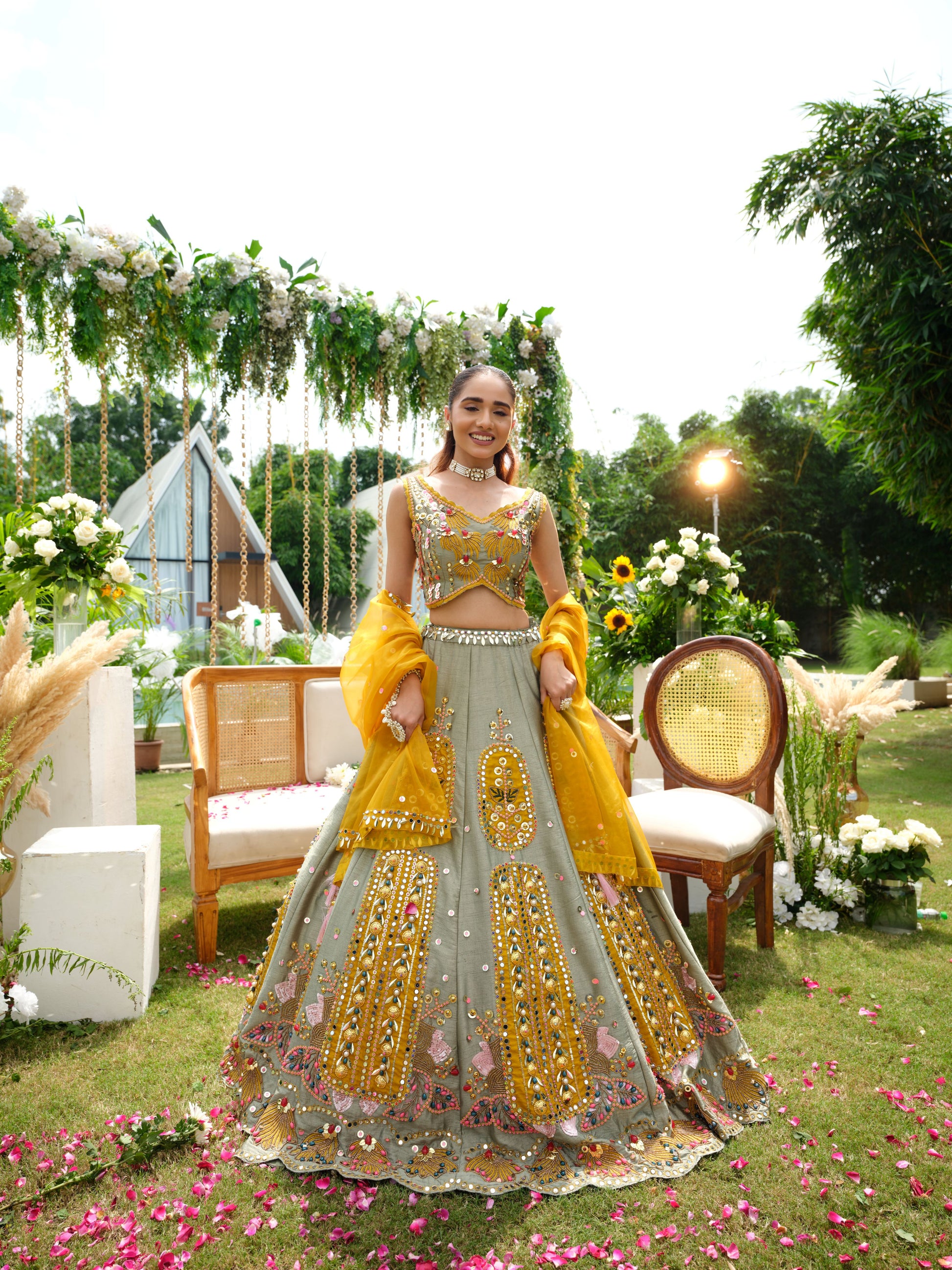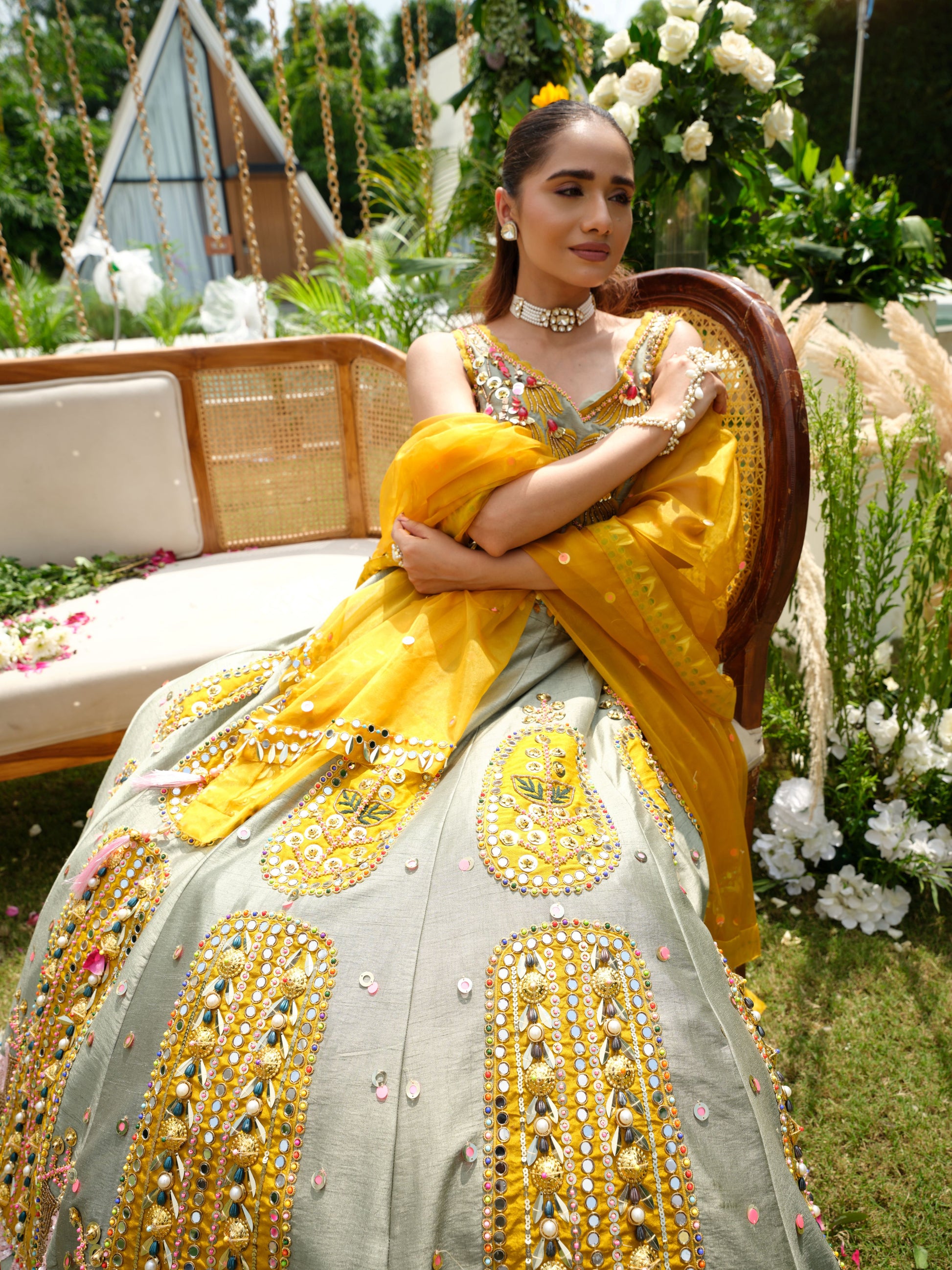A refreshing blend of tradition and vibrance, this sage green lehenga set with mustard accents is a perfect pick for daytime festivities. The lehenga is adorned with intricate mirror work, vibrant thread embroidery, and ornate motifs that add depth and elegance. The matching blouse, paired with a mustard yellow dupatta, creates a striking contrast that exudes festive charm.