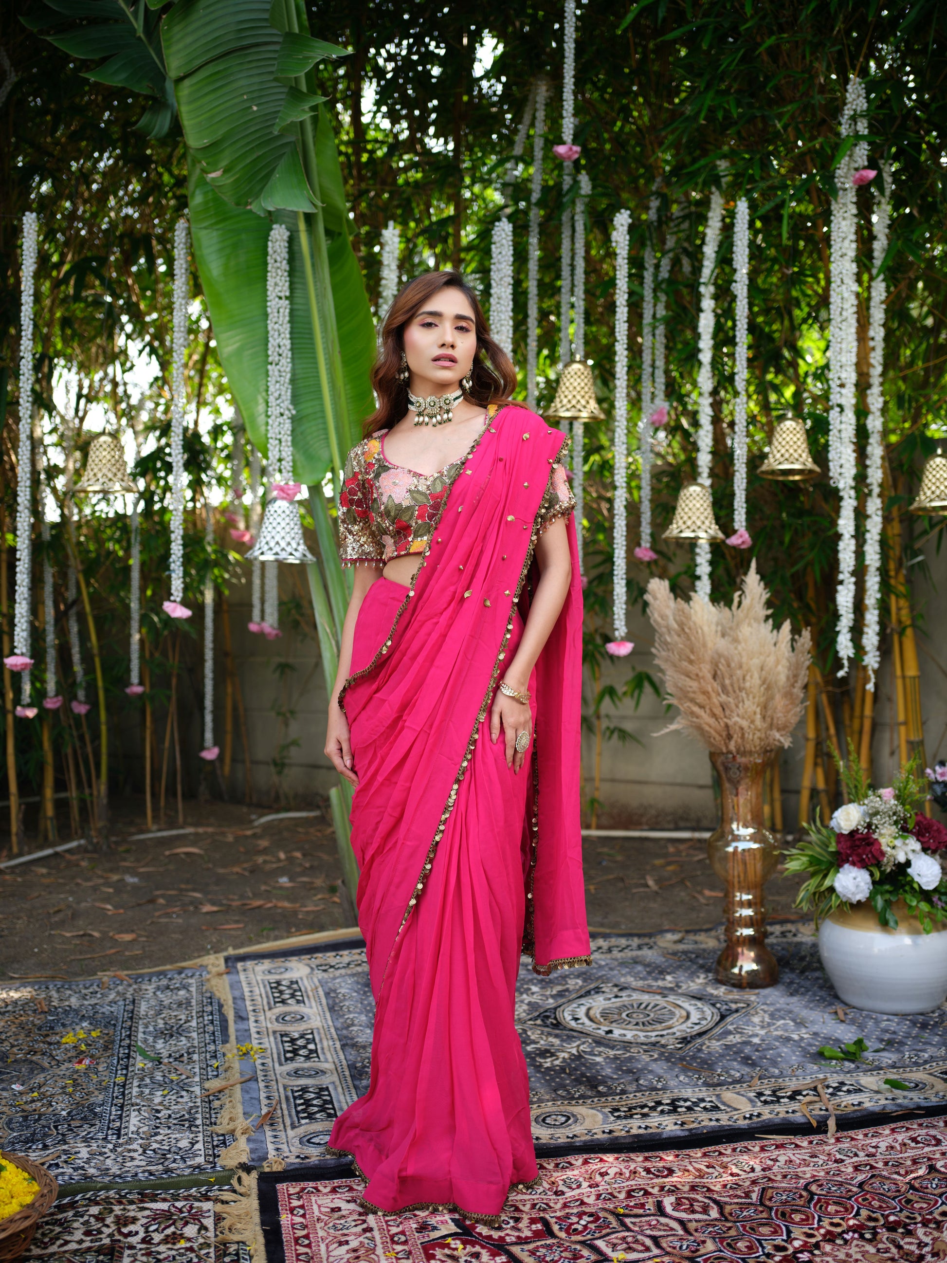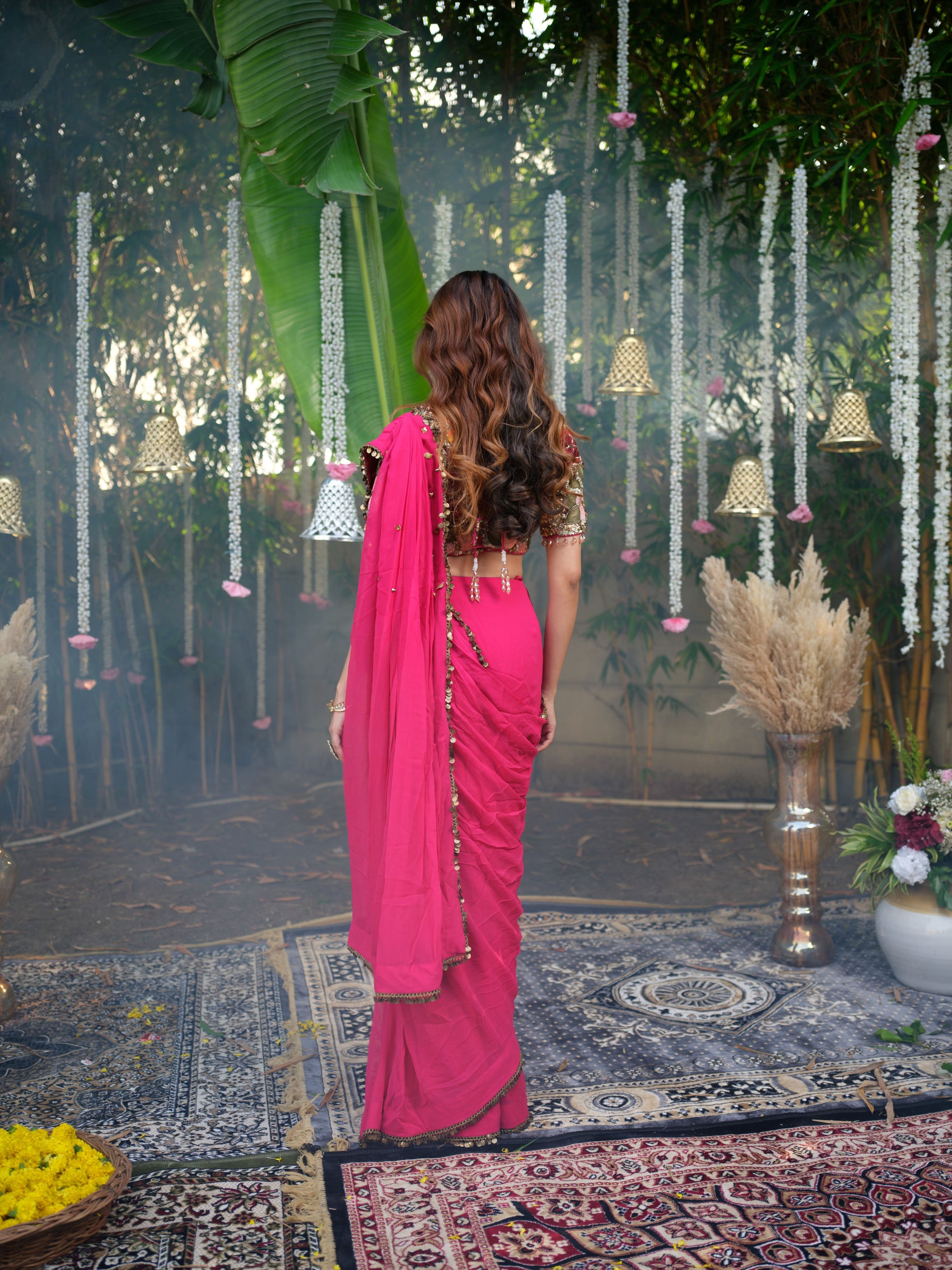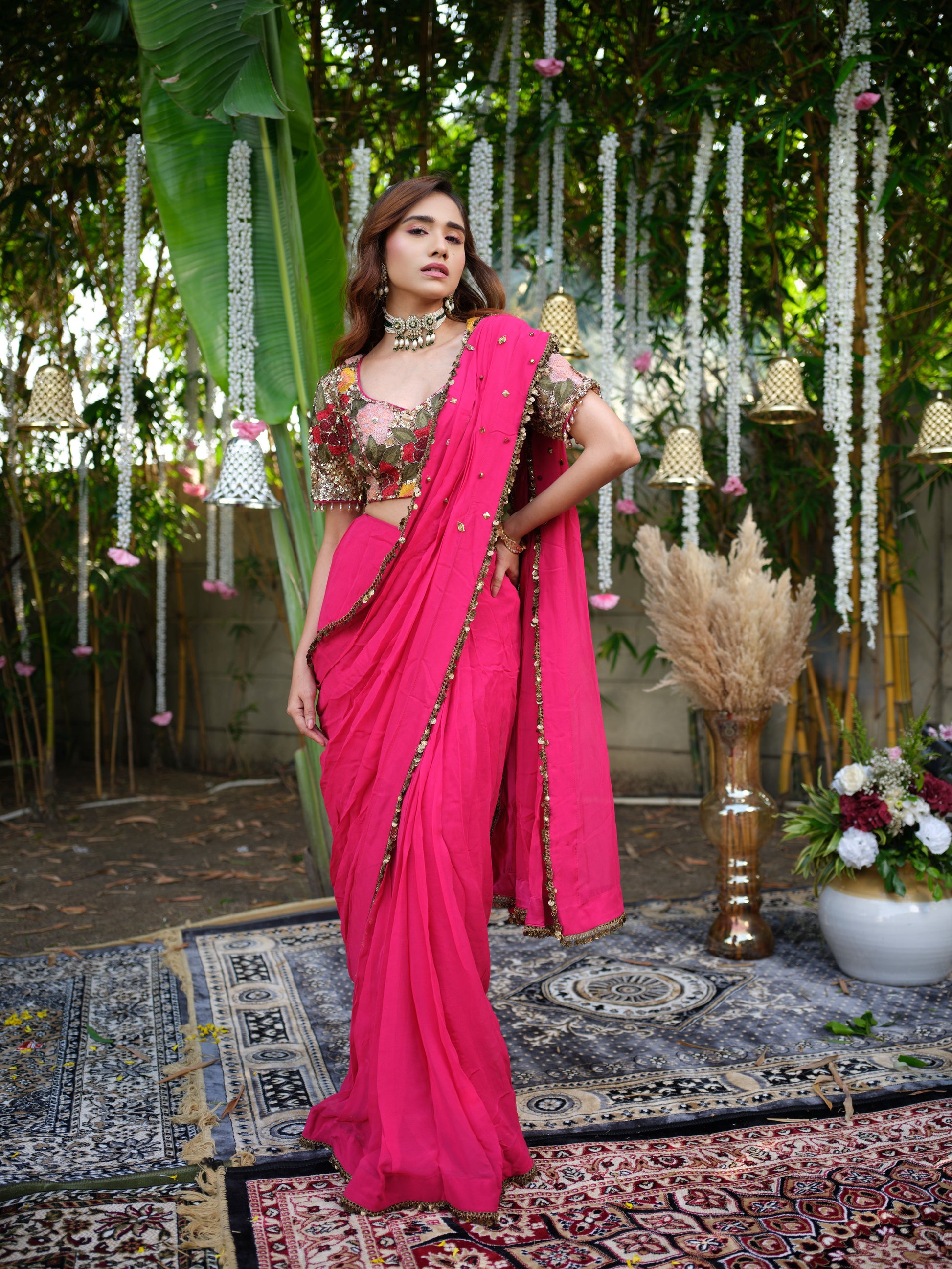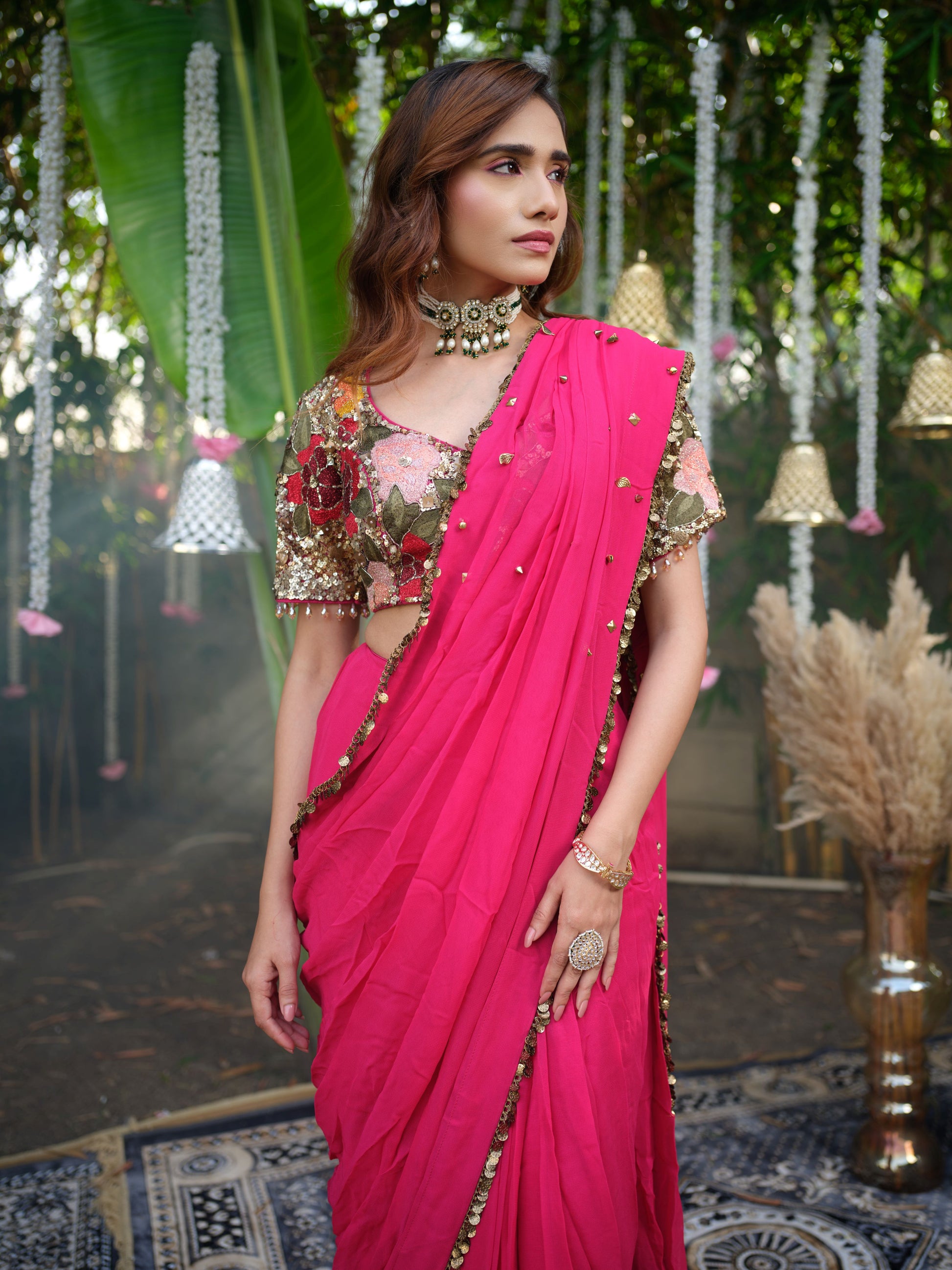 Turn heads in this radiant fuchsia saree paired with a heavily embellished sequin and floral blouse. The saree drape is light, fluid, and enhanced with delicate golden border details that add just the right touch of sparkle. Perfect for wedding soirées, cocktail nights, and festive occasions, this ensemble blends traditional draping with modern glamour.