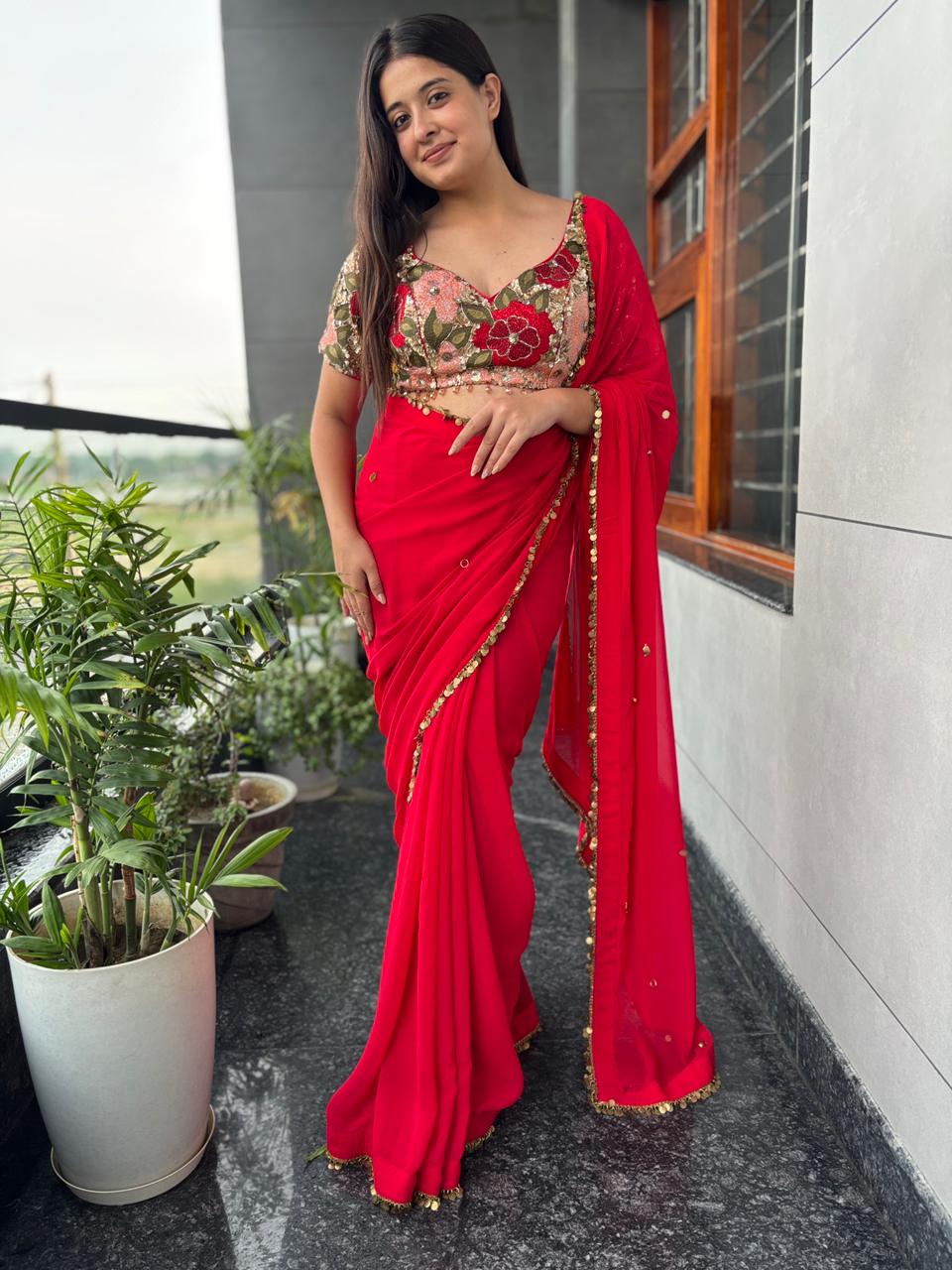 Turn heads in this radiant red saree paired with a heavily embellished sequin and floral blouse. The saree drape is light, fluid, and enhanced with delicate golden border details that add just the right touch of sparkle. Perfect for wedding soirées, cocktail nights, and festive occasions, this ensemble blends traditional draping with modern glamour.